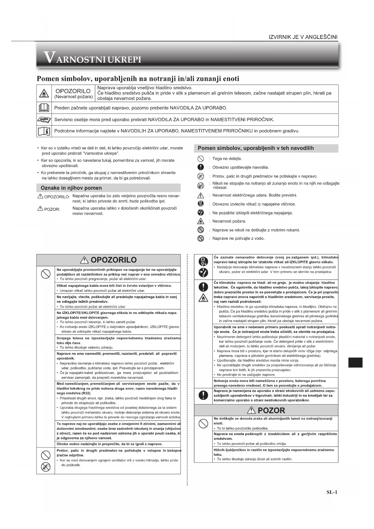 SL SL• Ker so v izdelku vrteči se deli in deli, ki lahko povzročijo električni udar, morate pred uporabo prebrati “Varnostne ukrepe”.• Ker so opozorila, ki so navedena tukaj, pomembna za varnost, jih morate obvezno upoštevati.• Ko preberete ta priročnik, ga skupaj z namestitvenim priročnikom shranite na lahko dosegljivem mestu za primer, da bi ga potrebovali. Oznake in njihov pomen OPOZORILO:Napačna uporaba bo zelo verjetno povzročila resno nevar-nost, ki lahko privede do smrti, hude poškodbe ipd. POZOR:Napačna uporaba lahko v določenih okoliščinah povzroči resno nevarnost. VARNOSTNI UKREPI Pomen simbolov, uporabljenih na notranji in/ali zunanji enoti OPOZORILO (Nevarnost požara)Naprava uporablja vnetljivo hladilno sredstvo.Če hladilno sredstvo pušča in pride v stik s plamenom ali grelnim telesom, začne nastajati strupen plin, hkrati pa obstaja nevarnost požara.Preden začnete uporabljati napravo, pozorno preberite NAVODILA ZA UPORABO.Servisno osebje mora pred uporabo prebrati NAVODILA ZA UPORABO in NAMESTITVENI PRIROČNIK.Podrobne informacije najdete v NAVODILIH ZA UPORABO, NAMESTITVENEM PRIROČNIKU in podobnem gradivu. OPOZORILO Ne uporabljajte provizoričnih priklopov na napajanje ter ne uporabljajte podaljškov ali razdelilnikov za priklop več naprav v eno omrežno vtičnico.• To lahko povzroči pregrevanje, požar ali električni udar.Vtikač napajalnega kabla mora biti čist in čvrsto vstavljen v vtičnico.• Umazan vtikač lahko povzroči požar ali električni udar.Ne navijajte, vlecite, poškodujte ali predelujte napajalnega kabla in nanj ne odlagajte težkih predmetov.• To lahko povzroči požar ali električni udar.Ne IZKLOPITE/VKLOPITE glavnega stikala in ne odklopite vtikača napa-jalnega kabla med delovanjem.• To lahko povzroči iskrenje, ki lahko zaneti požar.• Ko notranjo enoto IZKLOPITE z daljinskim upravljalnikom, IZKLOPITE glavno stikalo ali odklopite vtikač napajalnega kabla. Svojega telesa ne izpostavljajte neposrednemu hladnemu zračnemu toku dlje časa.• To lahko škoduje vašemu zdravju.Naprave ne sme namestiti, premestiti, razstaviti, predelati ali popraviti uporabnik.• Nepravilno ravnanje s klimatsko napravo lahko povzroči požar, električni udar, poškodbo, puščanje vode, ipd. Posvetujte se s prodajalcem.• Če je napajalni kabel poškodovan, ga mora proizvajalec ali pooblaščeni serviser zamenjati, da prepreči morebitno nevarnost.Med nameščanjem, premeščanjem ali servisiranjem enote pazite, da v hladilni tokokrog ne pride nobena druga snov, razen navedenega hladil-nega sredstva (R32).• Prisotnost drugih snovi, npr. zraka, lahko povzroči neobičajen dvig tlaka in privede do eksplozije ali poškodbe.• Uporaba drugega hladilnega sredstva od posebej določenega za ta sistem lahko povzroči mehansko okvaro, motnje delovanja sistema ali okvaro enote. V najhujšem primeru lahko to privede do resnega ogrožanja varnosti izdelka.Te naprave naj ne uporabljajo osebe z omejenimi fi zičnimi, zaznavnimi ali duševnimi zmožnostmi, osebe brez zadostnih izkušenj in znanja (vključno z otroci), razen če so pod nadzorom oziroma jih o uporabi pouči oseba, ki je odgovorna za njihovo varnost.Otroke vedno nadzirajte in preprečite, da bi se igrali z napravo. Prstov, palic in drugih predmetov ne potiskajte v vstopne in izstopne zračne odprtine.• Ker se med delovanjem vgrajeni ventilator vrti z visoko hitrostjo, lahko pride do poškodb. Če zaznate nenavadno delovanje (vonj po zažganem ipd.), klimatsko napravo takoj izklopite ter iztaknite vtikač ali IZKLOPITE glavno stikalo.• Nadaljnje delovanje klimatske naprave v neustreznem stanju lahko povzroči okvaro, požar ali električni udar. V tem primeru se obrnite na prodajalca. Če klimatska naprava ne hladi ali ne greje, je možno uhajanje hladilne tekočine. Če ugotovite, da hladilno sredstvo pušča, takoj izklopite napravo, dobro prezračite prostor in se posvetujte s prodajalcem. Če je pri popravilu treba napravo znova napolniti s hladilnim sredstvom, serviserja prosite, naj vam razloži podrobnosti.• Hladilno sredstvo, ki ga uporablja klimatska naprava, ni škodljivo. Običajno ne pušča. Če pa hladilno sredstvo pušča in pride v stik s plamenom ali grelnim telesom ventilatorskega grelnika, kerozinskega grelnika ali plinskega gorilnika in začne nastajati strupen plin, hkrati pa obstaja nevarnost požara.Uporabnik ne sme v nobenem primeru poskusiti oprati notranjosti notra-nje enote. Če je notranjost enote treba očistiti, se obrnite na prodajalca.• Neprimeren detergent lahko poškoduje plastični material v notranjosti enote, kar lahko povzroči puščanje vode. Če detergent pride v stik z električnimi deli ali motorjem, to lahko povzroči okvaro, dimljenje ali požar.• Naprava mora biti v prostoru, kjer ni stalno delujočih virov vžiga (npr. odprtega plamena, naprave s plinskim gorilnikom ali električnega grelnika).• Upoštevajte, da hladilno sredstvo morda nima vonja.• Ne uporabljajte drugih sredstev za pospeševanje odmrzovanja ali za čiščenje naprave kot tistih, ki jih priporoča proizvajalec.• Ne predirajte in ne zažigajte naprave.Notranja enota mora biti nameščena v prostoru, katerega površina presega navedeno vrednost. O tem se posvetujte s prodajalcem.Naprava je namenjena za uporabo s strani strokovnih ali ustrezno uspo-sobljenih uporabnikov v trgovinah, lahki industriji in na kmetijah ter za komercialno uporabo s strani nestrokovnih uporabnikov. POZOR Ne dotikajte se dovoda zraka ali aluminijastih lamel na notranji/zunanji enoti.• To bi lahko povzročilo poškodbe.Naprave ne smete poškropiti z insekticidom ali z gorljivim razpršilnim sredstvom.• To lahko povzroči požar ali poškodbo ohišja.Hišnih ljubljenčkov in rastlin ne izpostavljajte neposrednemu zračnemu toku.• To lahko škoduje zdravju živali ali sobnih rastlin. Pomen simbolov, uporabljenih v teh navodilih : Tega ne delajte. : Obvezno upoštevajte 