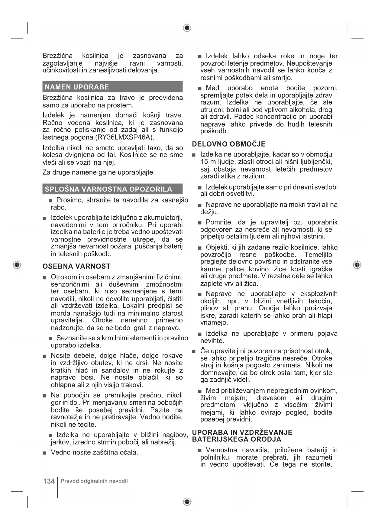 malom brzinom zbog rezanja rijetke trave.134 Prevod originalnih navodil Brezžična kosilnica je zasnovana za zagotavljanje najvišje ravni varnosti, učinkovitosti in zanesljivosti delovanja. NAMEN UPORABE Brezžična kosilnica za travo je predvidena samo za uporabo na prostem. Izdelek je namenjen domači košnji trave. Ročno vodena kosilnica, ki je zasnovana za ročno potiskanje od zadaj ali s funkcijo lastnega pogona (RY36LMXSP46A). Izdelka nikoli ne smete upravljati tako, da so kolesa dvignjena od tal. Kosilnice se ne sme vleči ali se voziti na njej. Za druge namene ga ne uporabljajte.