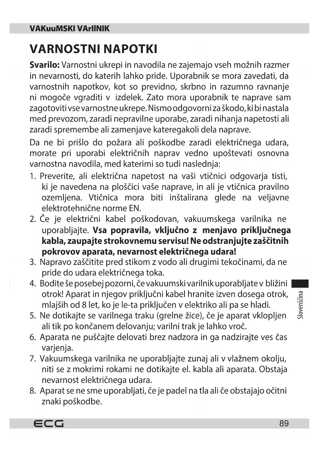 VaKuumSKI VarIlnIK VARNOSTNI NAPOTKI Svarilo: Varnostni ukrepi in navodila ne zajemajo vseh možnih razmer in nevarnosti, do katerih lahko pride. Uporabnik se mora zavedati, da varnostnih napotkov, kot so previdno, skrbno in razumno ravnanje ni mogoče vgraditi v izdelek. Zato mora uporabnik te naprave sam zagotoviti vse varnostne ukrepe. Nismo odgovorni za škodo, ki bi nastala med prevozom, zaradi nepravilne uporabe, zaradi nihanja napetosti ali zaradi spremembe ali zamenjave kateregakoli dela naprave. Da ne bi prišlo do požara ali poškodbe zaradi električnega udara, morate pri uporabi električnih naprav vedno upoštevati osnovna varnostna navodila, med katerimi so tudi naslednja: