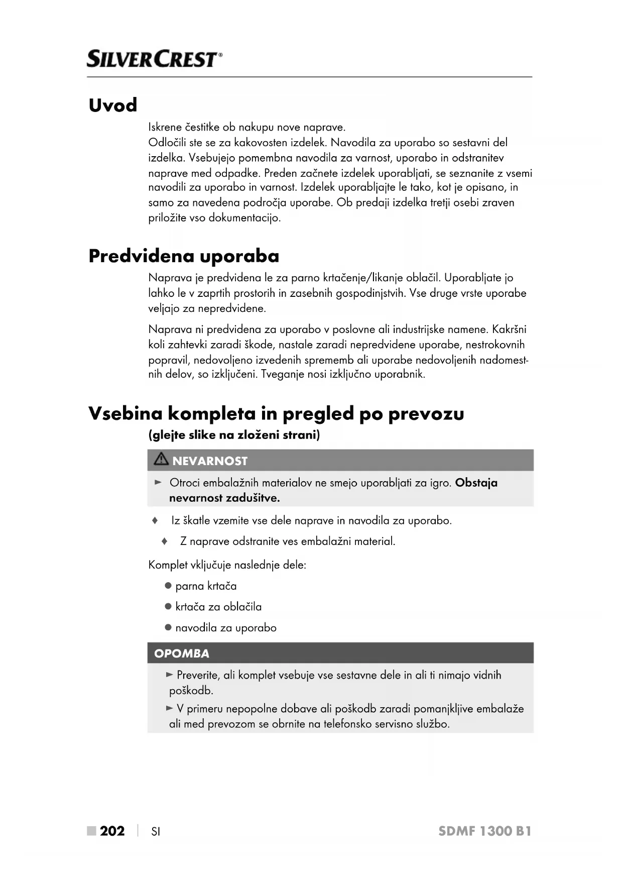 SI SDMF 1300 B1 Uvod Iskrene čestitke ob nakupu nove naprave. Odločili ste se za kakovosten izdelek. Navodila za uporabo so sestavni del izdelka. Vsebujejo pomembna navodila za varnost, uporabo in odstranitev naprave med odpadke. Preden začnete izdelek uporabljati, se seznanite z vsemi navodili za uporabo in varnost. Izdelek uporabljajte le tako, kot je opisano, in samo za navedena področja uporabe. Ob predaji izdelka tretji osebi zraven priložite vso dokumentacijo. Predvidena uporaba Naprava je predvidena le za parno krtačenje/likanje oblačil. Uporabljate jo lahko le v zaprtih prostorih in zasebnih gospodinjstvih. Vse druge vrste uporabe veljajo za nepredvidene. Naprava ni predvidena za uporabo v poslovne ali industrijske namene. Kakršni koli zahtevki zaradi škode, nastale zaradi nepredvidene uporabe, nestrokovnih popravil, nedovoljeno izvedenih sprememb ali uporabe nedovoljenih nadomest- nih delov, so izključeni. Tveganje nosi izključno uporabnik. Vsebina kompleta in pregled po prevozu (glejte slike na zloženi strani) NEVARNOST ► Otroci embalažnih materialov ne smejo uporabljati za igro. Obstaja nevarnost zadušitve. Ƈ Iz škatle vzemite vse dele naprave in navodila za uporabo. Ƈ Z naprave odstranite ves embalažni material. Komplet vključuje naslednje dele: ▯ parna krtača ▯ krtača za oblačila ▯ navodila za uporabo OPOMBA ► Preverite, ali komplet vsebuje vse sestavne dele in ali ti nimajo vidnih poškodb. ► V primeru nepopolne dobave ali poškodb zaradi pomanjkljive embalaže ali med prevozom se obrnite na telefonsko servisno službo.SI