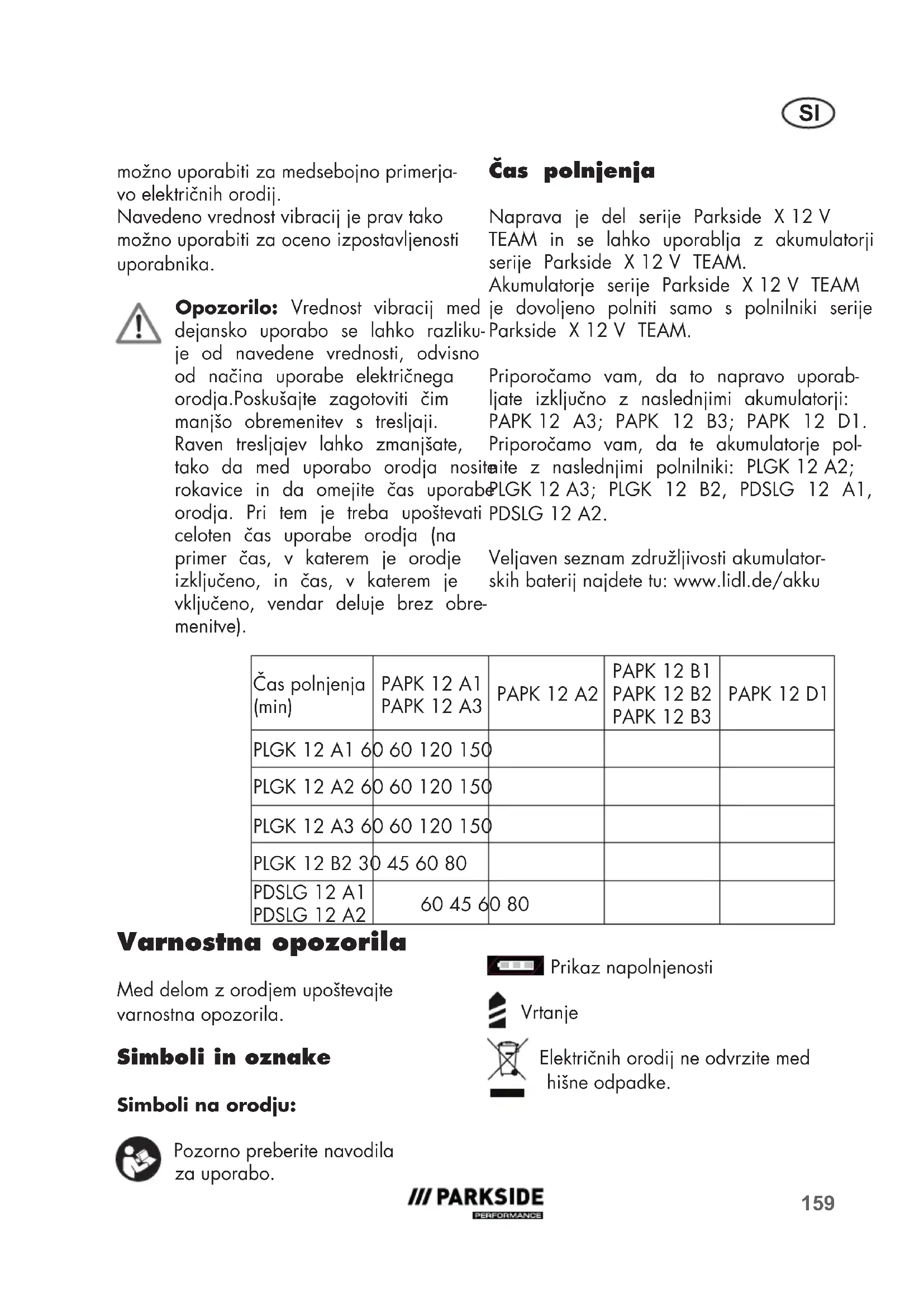 možno uporabiti za medsebojno primerja- vo električnih orodij. Navedeno vrednost vibracij je prav tako možno uporabiti za oceno izpostavljenosti uporabnika. Opozorilo: Vrednost vibracij med dejansko uporabo se lahko razliku- je od navedene vrednosti, odvisno od načina uporabe električnega orodja.Poskušajte zagotoviti čim manjšo obremenitev s tresljaji. Raven tresljajev lahko zmanjšate, tako da med uporabo orodja nosite rokavice in da omejite čas uporabe orodja. Pri tem je treba upoštevati celoten čas uporabe orodja (na primer čas, v katerem je orodje izključeno, in čas, v katerem je vključeno, vendar deluje brez obre- menitve). Čas polnjenja Naprava je del serije Parkside X12V TEAM in se lahko uporablja z akumulatorji serije Parkside X12V TEAM. Akumulatorje serije Parkside X12V TEAM je dovoljeno polniti samo s polnilniki serije Parkside X12V TEAM. Priporočamo vam, da to napravo uporab- ljate izključno z naslednjimi akumulatorji: PAPK12 A3; PAPK 12 B3; PAPK 12 D1. Priporočamo vam, da te akumulatorje pol- nite z naslednjimi polnilniki: PLGK12A2; PLGK12A3; PLGK 12 B2, PDSLG 12 A1, PDSLG 12 A2. Veljaven seznam združljivosti akumulator- skih baterij najdete tu: www.lidl.de/akku Čas polnjenja (min) PAPK12A1 PAPK12A3 PAPK12A2 PAPK12B1 PAPK12B2 PAPK12B3 PAPK12D1 PLGK12A1 60 60 120 150 PLGK12A2 60 60 120 150 PLGK12A3 60 60 120 150 PLGK12B2 30 45 60 80 PDSLG12A1 PDSLG12A2