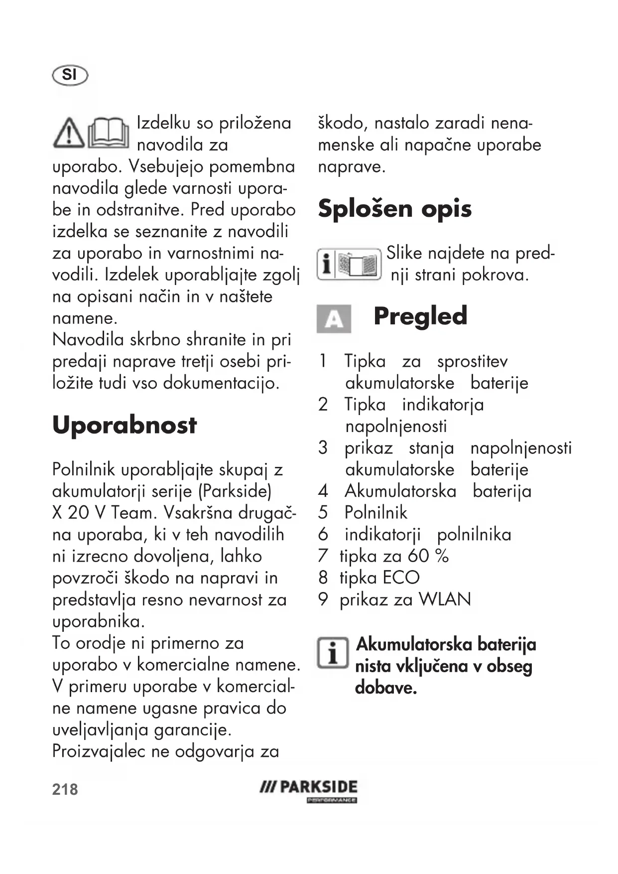 Izdelku so priložena navodila za uporabo. Vsebujejo pomembna navodila glede varnosti upora- be in odstranitve. Pred uporabo izdelka se seznanite z navodili za uporabo in varnostnimi na- vodili. Izdelek uporabljajte zgolj na opisani način in v naštete namene. Navodila skrbno shranite in pri predaji naprave tretji osebi pri- ložite tudi vso dokumentacijo. Uporabnost Polnilnik uporabljajte skupaj z akumulatorji serije (Parkside) X20V Team. Vsakršna drugač- na uporaba, ki v teh navodilih ni izrecno dovoljena, lahko povzroči škodo na napravi in predstavlja resno nevarnost za uporabnika. To orodje ni primerno za uporabo v komercialne namene. V primeru uporabe v komercial- ne namene ugasne pravica do uveljavljanja garancije. Proizvajalec ne odgovarja za škodo, nastalo zaradi nena- menske ali napačne uporabe naprave. Splošen opis Slike najdete na pred- nji strani pokrova. Pregled 1 Tipka za sprostitev akumulatorske baterije 2 Tipka indikatorja napolnjenosti 3 prikaz stanja napolnjenosti akumulatorske baterije 4 Akumulatorska baterija 5 Polnilnik 6 indikatorji polnilnika 7 tipka za 60% 8 tipka ECO 9 prikaz za WLAN Akumulatorska baterija nista vključena v obseg dobave.219