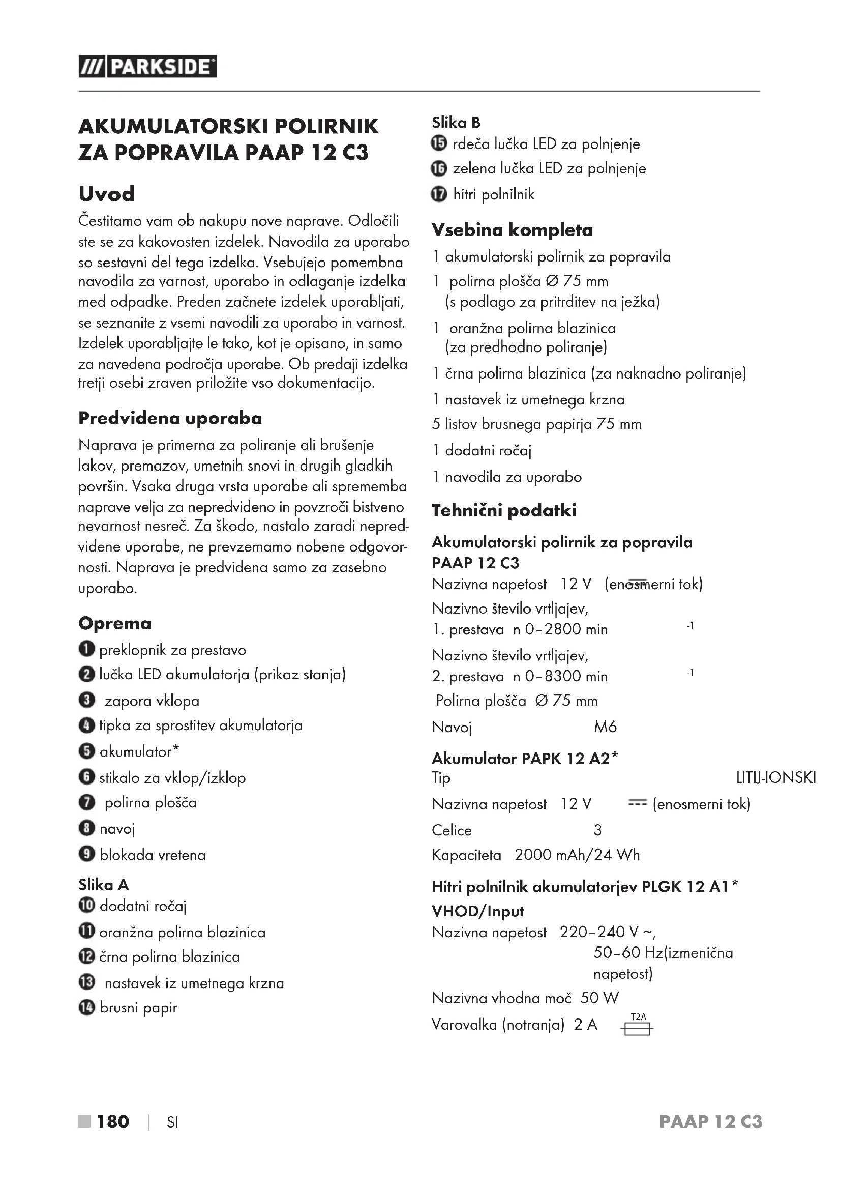 Uvod Čestitamo vam ob nakupu nove naprave. Odločili ste se za kakovosten izdelek. Navodila za uporabo so sestavni del tega izdelka. Vsebujejo pomembna navodila za varnost, uporabo in odlaganje izdelka med odpadke. Preden začnete izdelek uporabljati, se seznanite z vsemi navodili za uporabo in varnost. Izdelek uporabljajte le tako, kot je opisano, in samo za navedena področja uporabe. Ob predaji izdelka tretji osebi zraven priložite vso dokumentacijo. Predvidena uporaba Naprava je primerna za poliranje ali brušenje lakov, premazov, umetnih snovi in drugih gladkih površin. Vsaka druga vrsta uporabe ali sprememba naprave velja za nepredvideno in povzroči bistveno nevarnost nesreč. Za škodo, nastalo zaradi nepred- videne uporabe, ne prevzemamo nobene odgovor- nosti. Naprava je predvidena samo za zasebno uporabo. Oprema preklopnik za prestavo lučka LED akumulatorja (prikaz stanja) zapora vklopa tipka za sprostitev akumulatorja akumulator* stikalo za vklop/izklop polirna plošča navoj blokada vretena Slika A dodatni ročaj oranžna polirna blazinica črna polirna blazinica nastavek iz umetnega krzna brusni papir Slika B rdeča lučka LED za polnjenje zelena lučka LED za polnjenje hitri polnilnik Vsebina kompleta 1 akumulatorski polirnik za popravila 1 polirna plošča Ø 75 mm (s podlago za pritrditev na ježka) 1 oranžna polirna blazinica (za predhodno poliranje) 1 črna polirna blazinica (za naknadno poliranje) 1 nastavek iz umetnega krzna 5 listov brusnega papirja 75 mm 1 dodatni ročaj 1 navodila za uporabo Tehnični podatki Akumulatorski polirnik za popravila PAAP 12 C3 Nazivna napetost 12 V (enosmerni tok) Nazivno število vrtljajev,