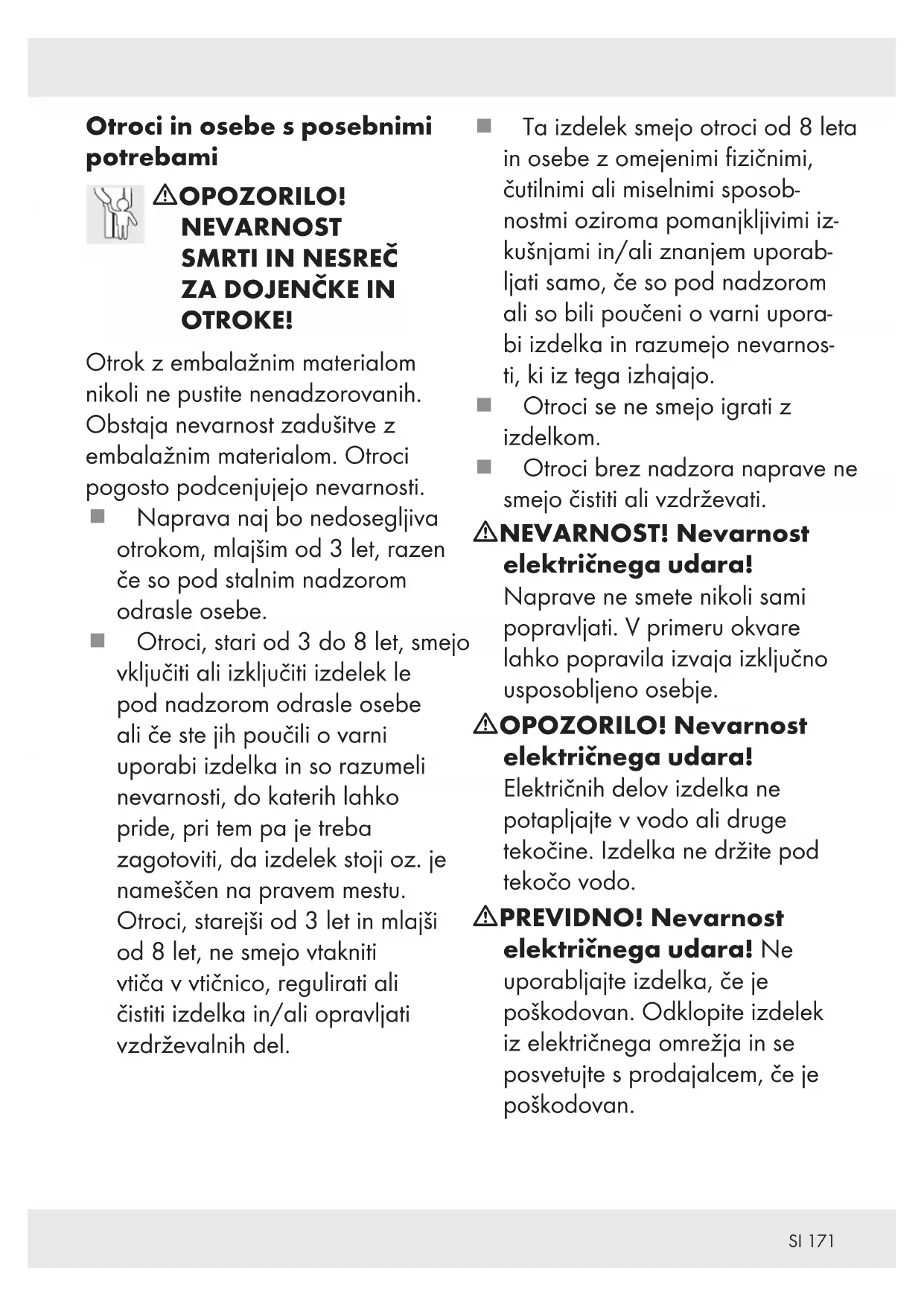 OTROKE! Otrok z embalažnim materialom nikoli ne pustite nenadzorovanih. Obstaja nevarnost zadušitve z embalažnim materialom. Otroci pogosto podcenjujejo nevarnosti. Naprava naj bo nedosegljiva otrokom, mlajšim od 3let, razen če so pod stalnim nadzorom odrasle osebe. Otroci, stari od 3do 8let, smejo vključiti ali izključiti izdelek le pod nadzorom odrasle osebe ali če ste jih poučili o varni uporabi izdelka in so razumeli nevarnosti, do katerih lahko pride, pri tem pa je treba zagotoviti, da izdelek stoji oz. je nameščen na pravem mestu. Otroci, starejši od 3let in mlajši od 8let, ne smejo vtakniti vtiča v vtičnico, regulirati ali čistiti izdelka in/ali opravljati vzdrževalnih del. Ta izdelek smejo otroci od 8leta in osebe z omejenimi fizičnimi, čutilnimi ali miselnimi sposob- nostmi oziroma pomanjkljivimi iz- kušnjami in/ali znanjem uporab- ljati samo, če so pod nadzorom ali so bili poučeni o varni upora- bi izdelka in razumejo nevarnos- ti, ki iz tega izhajajo. Otroci se ne smejo igrati z izdelkom. Otroci brez nadzora naprave ne smejo čistiti ali vzdrževati. mNEVARNOST! Nevarnost električnega udara! Naprave ne smete nikoli sami popravljati. V primeru okvare lahko popravila izvaja izključno usposobljeno osebje. mOPOZORILO! Nevarnost električnega udara! Električnih delov izdelka ne potapljajte v vodo ali druge tekočine. Izdelka ne držite pod tekočo vodo. mPREVIDNO! Nevarnost električnega udara! Ne uporabljajte izdelka, če je poškodovan. Odklopite izdelek iz električnega omrežja in se posvetujte s prodajalcem, če je poškodovan.172