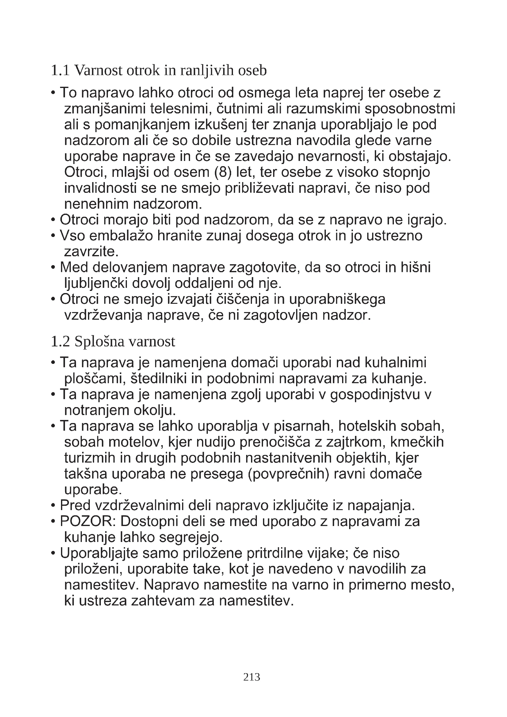 - To napravo lahko otroci od osmega leta naprej ter osebe z zmanjšanimi telesnimi, čutnimi ali razumskimi sposobnostmi ali s pomanjkanjem izkušenj ter znanja uporabljajo le pod nadzorom ali če so dobile ustrezna navodila glede varne uporabe naprave in če se zavedajo nevarnosti, ki obstajajo. Otroci, mlajši od osem (8) let, ter osebe z visoko stopnjo invalidnosti se ne smejo približevati napravi, če niso pod nenehnim nadzorom.