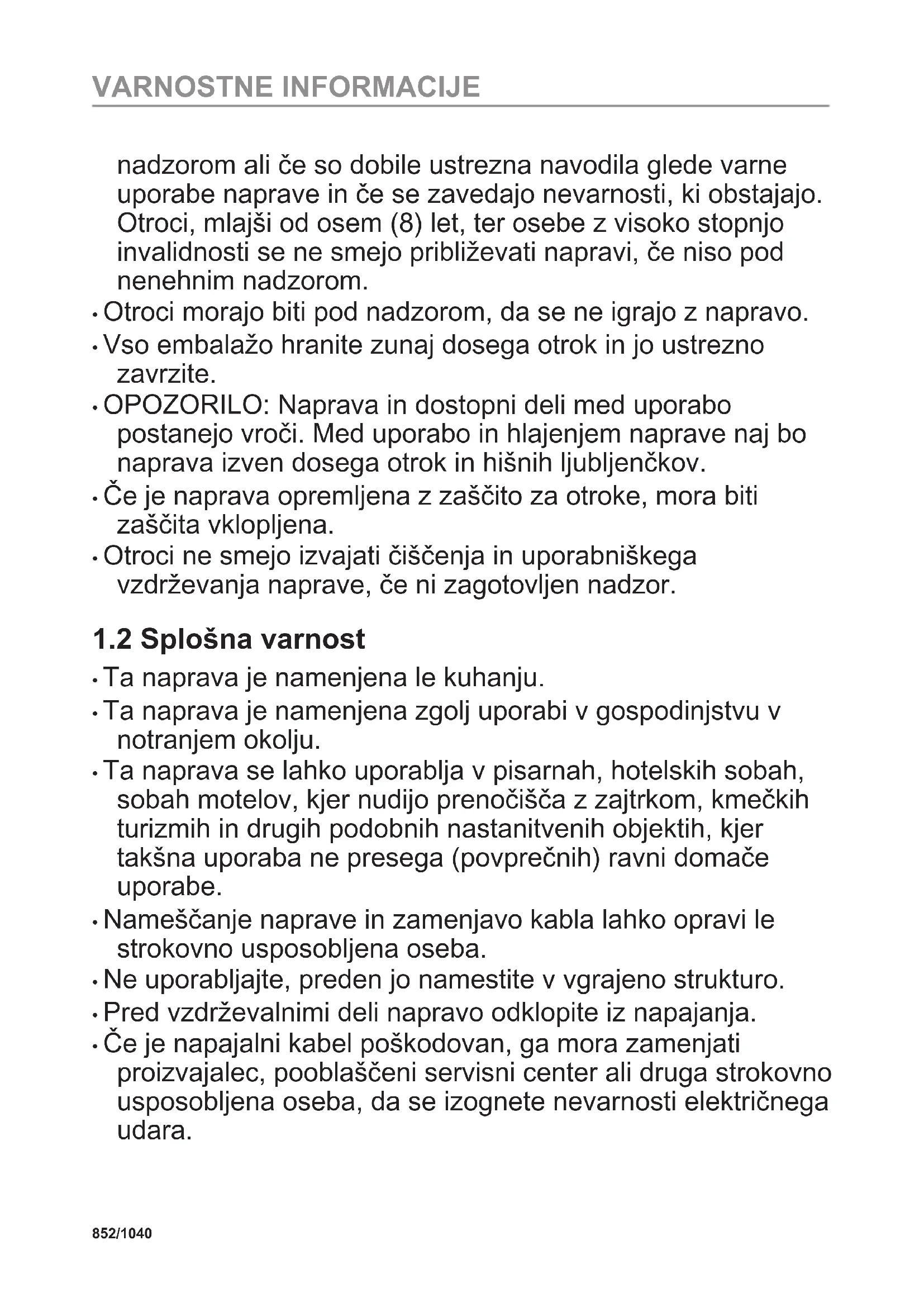 - To napravo lahko otroci od osmega leta naprej ter osebe z zmanjšanimi telesnimi, čutnimi ali razumskimi sposobnostmi ali s pomanjkanjem izkušenj ter znanja uporabljajo le pod 851/1040 VARNOSTNE INFORMACIJEnadzorom ali če so dobile ustrezna navodila glede varne uporabe naprave in če se zavedajo nevarnosti, ki obstajajo. Otroci, mlajši od osem (8) let, ter osebe z visoko stopnjo invalidnosti se ne smejo približevati napravi, če niso pod nenehnim nadzorom.