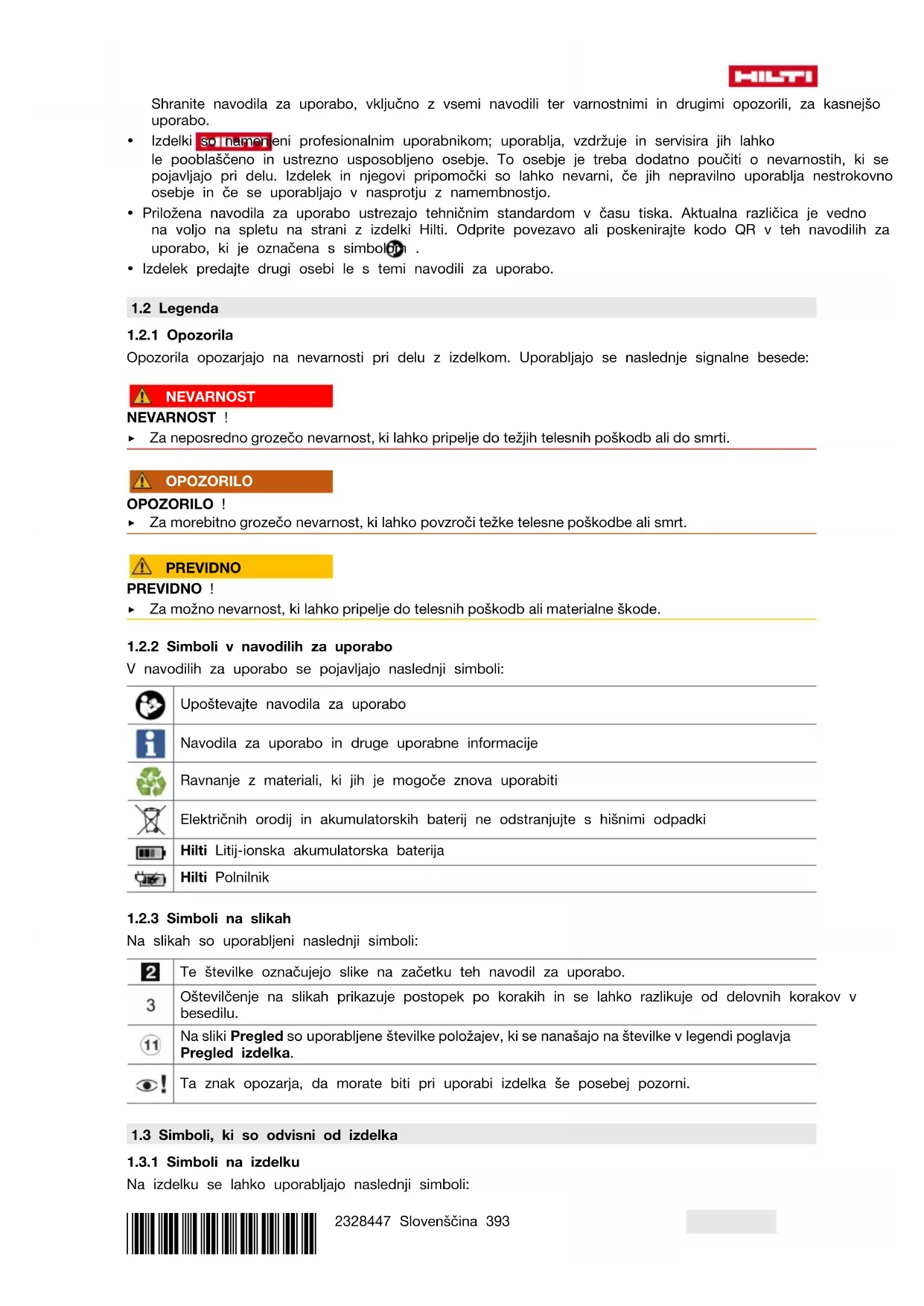 V navodilih za uporabo se pojavljajo naslednji simboli: Upoštevajte navodila za uporabo Navodila za uporabo in druge uporabne informacije Ravnanje z materiali, ki jih je mogoče znova uporabiti Električnih orodij in akumulatorskih baterij ne odstranjujte s hišnimi odpadki Hilti Litij-ionska akumulatorska baterija Hilti Polnilnik