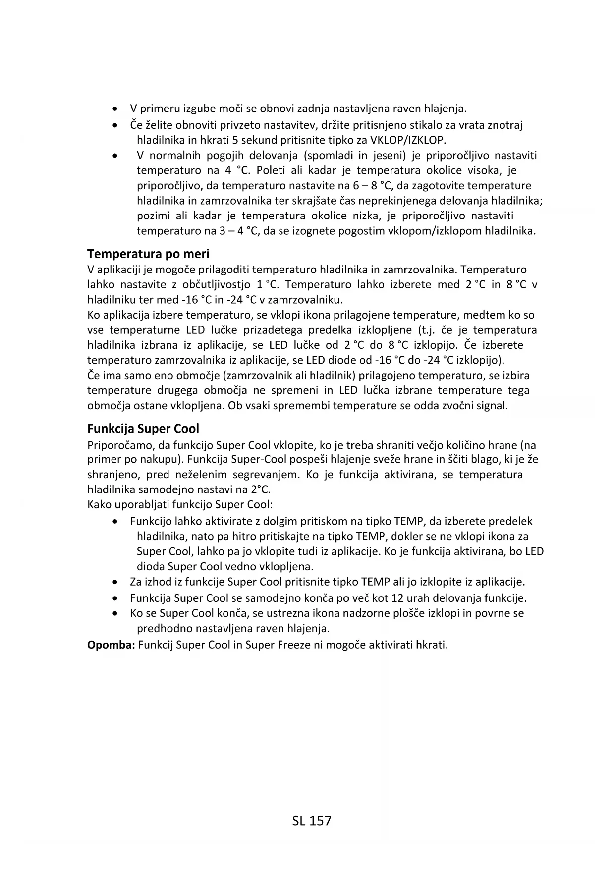 - V normalnih pogojih delovanja (spomladi in jeseni) je priporočljivo nastaviti temperaturo na 4 °C. Poleti ali kadar je temperatura okolice visoka, je priporočljivo, da temperaturo nastavite na 6 – 8 °C, da zagotovite temperature hladilnika in zamrzovalnika ter skrajšate čas neprekinjenega delovanja hladilnika; pozimi ali kadar je temperatura okolice nizka, je priporočljivo nastaviti temperaturo na 3 – 4 °C, da se izognete pogostim vklopom/izklopom hladilnika. Temperatura po meri V aplikaciji je mogoče prilagoditi temperaturo hladilnika in zamrzovalnika. Temperaturo lahko nastavite z občutljivostjo 1 °C. Temperaturo lahko izberete med 2 °C in 8 °C v hladilniku ter med -16 °C in -24 °C v zamrzovalniku. Ko aplikacija izbere temperaturo, se vklopi ikona prilagojene temperature, medtem ko so vse temperaturne LED lučke prizadetega predelka izklopljene (t.j. če je temperatura hladilnika izbrana iz aplikacije, se LED lučke od 2 °C do 8 °C izklopijo. Če izberete temperaturo zamrzovalnika iz aplikacije, se LED diode od -16 °C do -24 °C izklopijo). Če ima samo eno območje (zamrzovalnik ali hladilnik) prilagojeno temperaturo, se izbira temperature drugega območja ne spremeni in LED lučka izbrane temperature tega območja ostane vklopljena. Ob vsaki spremembi temperature se odda zvočni signal. Funkcija Super Cool Priporočamo, da funkcijo Super Cool vklopite, ko je treba shraniti večjo količino hrane (na primer po nakupu). Funkcija Super-Cool pospeši hlajenje sveže hrane in ščiti blago, ki je že shranjeno, pred neželenim segrevanjem. Ko je funkcija aktivirana, se temperatura hladilnika samodejno nastavi na 2°C. Kako uporabljati funkcijo Super Cool: