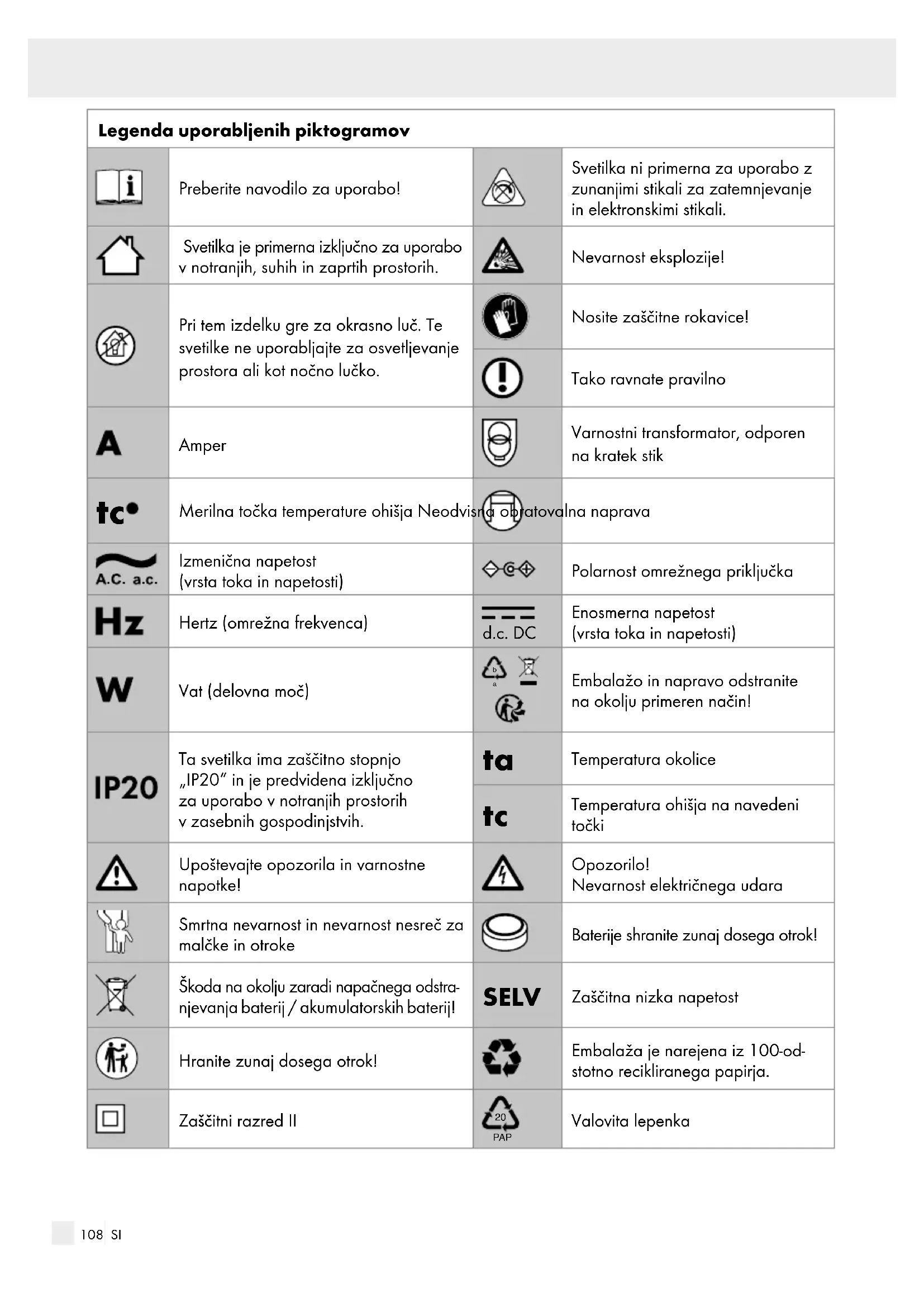 Temperatura ohišja na navedeni točki Upoštevajte opozorila in varnostne napotke! Opozorilo! Nevarnost električnega udara Smrtna nevarnost in nevarnost nesreč za malčke in otroke Baterije shranite zunaj dosega otrok! Škoda na okolju zaradi napačnega odstra- njevanja baterij / akumulatorskih baterij! SELV Zaščitna nizka napetost Hranite zunaj dosega otrok! Embalaža je narejena iz 100-od- stotno recikliranega papirja. Zaščitni razred II