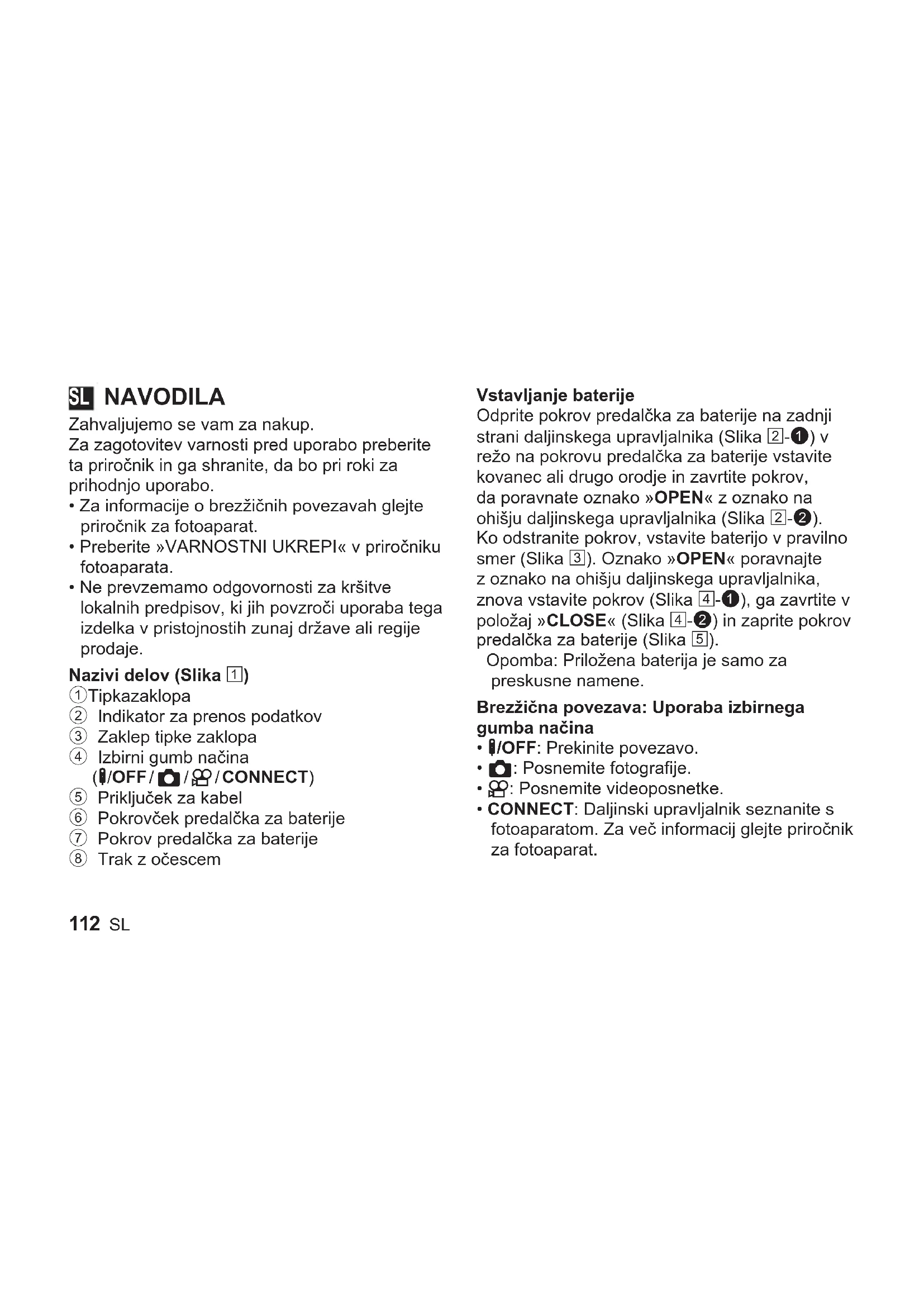 - Ne prevzemamo odgovornosti za kršitve lokalnih predpisov, ki jih povzroči uporaba tega izdelka v pristojnostih zunaj države ali regije prodaje. Nazivi delov (Slika 1) 1 Tipka zaklopa 2 Indikator za prenos podatkov 3 Zaklep tipke zaklopa 4 Izbirni gumb načina (b/OFF / K / n / CONNECT) 5 Priključek za kabel 6 Pokrovček predalčka za baterije 7 Pokrov predalčka za baterije 8 Trak z očescem Vstavljanje baterije Odprite pokrov predalčka za baterije na zadnji strani daljinskega upravljalnika (Slika 2-1) v režo na pokrovu predalčka za baterije vstavite kovanec ali drugo orodje in zavrtite pokrov, da poravnate oznako »OPEN« z oznako na ohišju daljinskega upravljalnika (Slika 2-2). Ko odstranite pokrov, vstavite baterijo v pravilno smer (Slika 3). Oznako »OPEN« poravnajte z oznako na ohišju daljinskega upravljalnika, znova vstavite pokrov (Slika 4-1), ga zavrtite v položaj »CLOSE« (Slika 4-2) in zaprite pokrov predalčka za baterije (Slika 5). Opomba: Priložena baterija je samo za preskusne namene. Brezžična povezava: Uporaba izbirnega gumba načina
