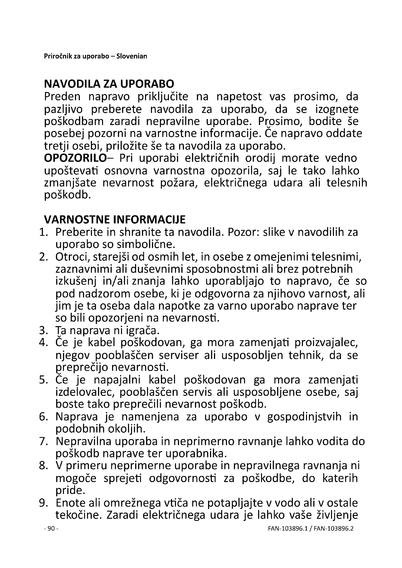tekočine. Zaradi električnega udara je lahko vaše življenje- 91 - FAN-103896.1 / FAN-103896.2 ogroženo! Če do udara vseeno pride, takoj izvlecite omrežni vtič, enoto pa naj pred ponovno uporabo pregleda strokovnjak.