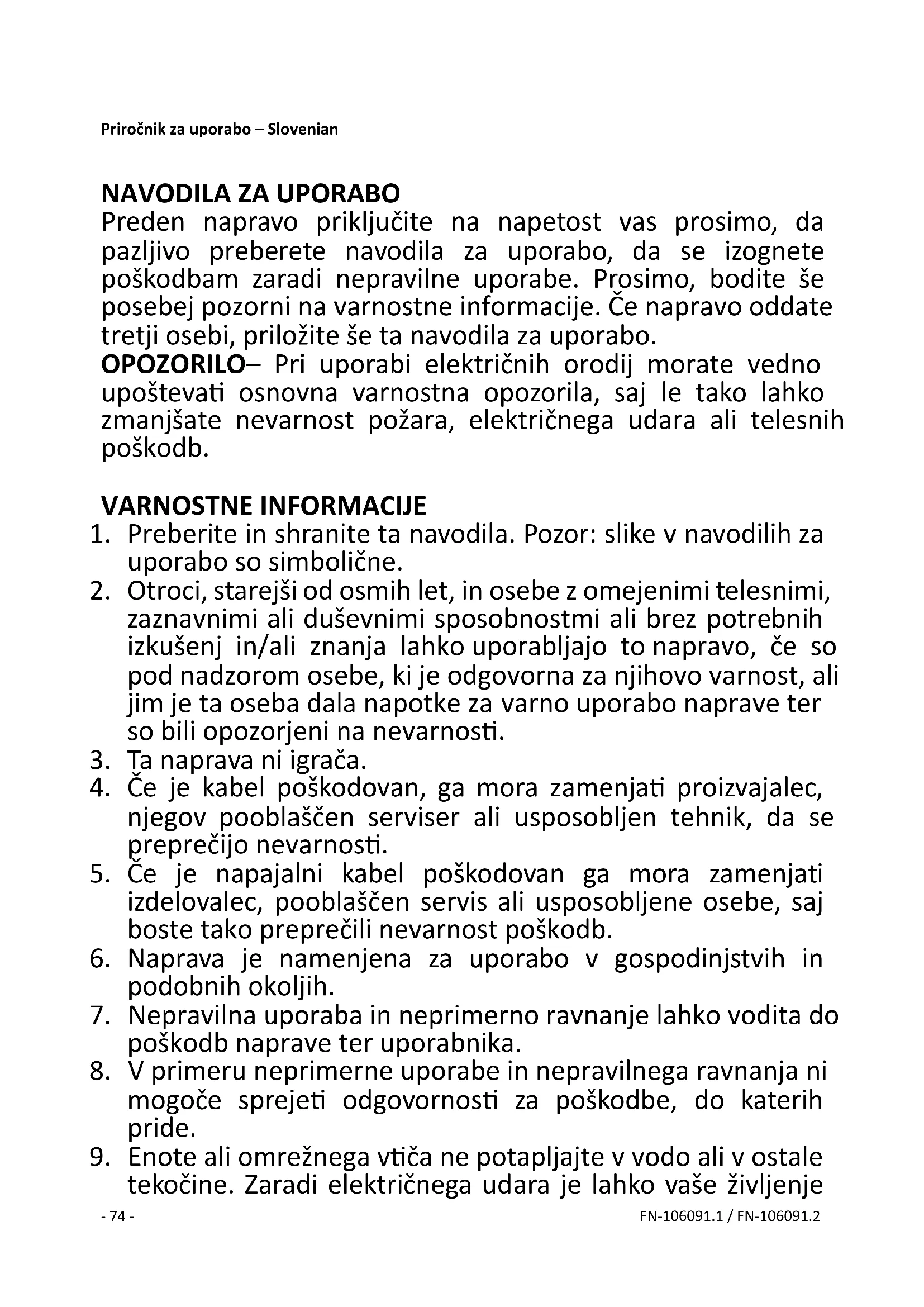 tekočine. Zaradi električnega udara je lahko vaše življenje- 75 - FN-106091.1 / FN-106091.2 ogroženo! Če do udara vseeno pride, takoj izvlecite omrežni vtič, enoto pa naj pred ponovno uporabo pregleda strokovnjak.