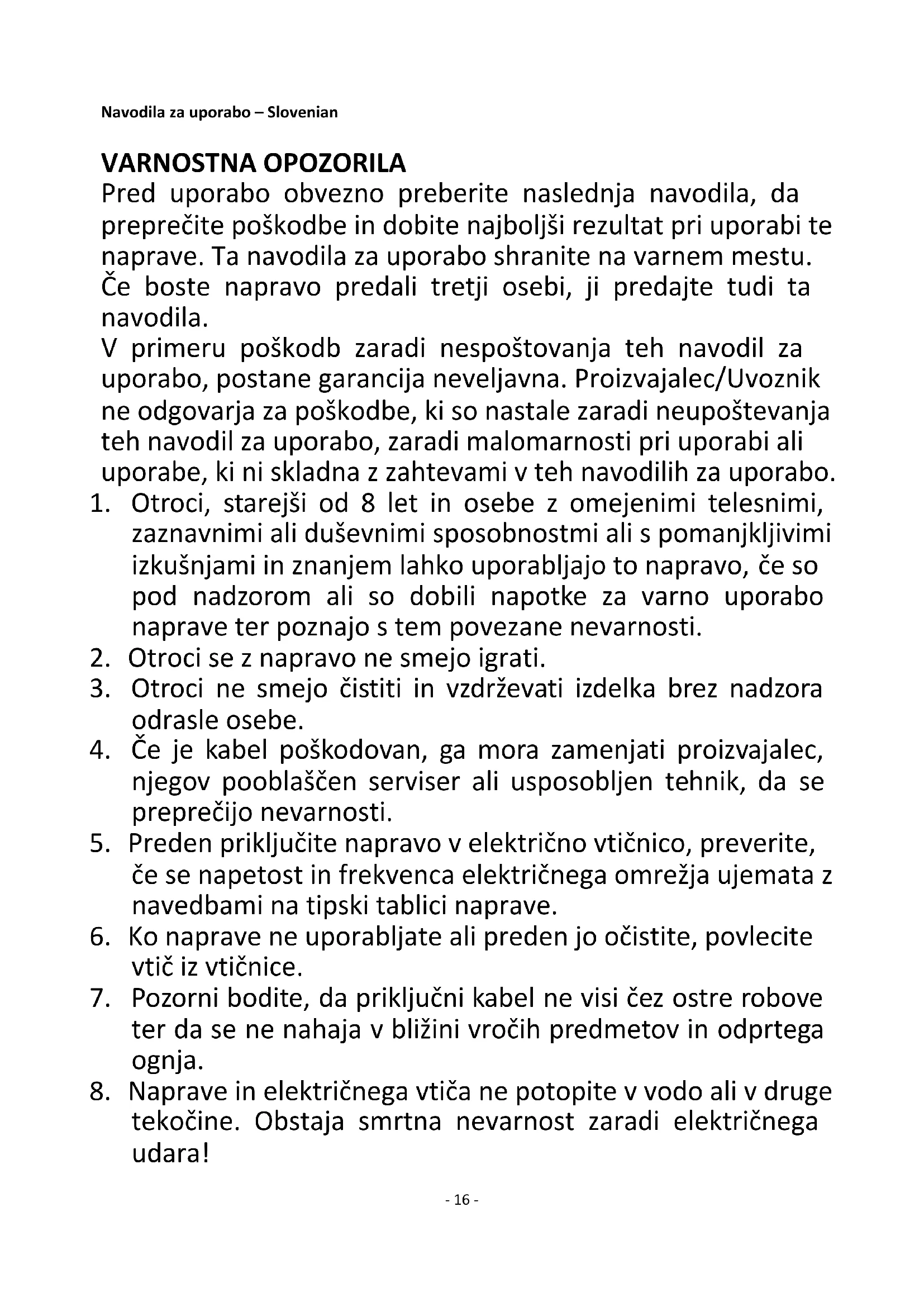 8. Naprave in električnega vtiča ne potopite v vodo ali v druge