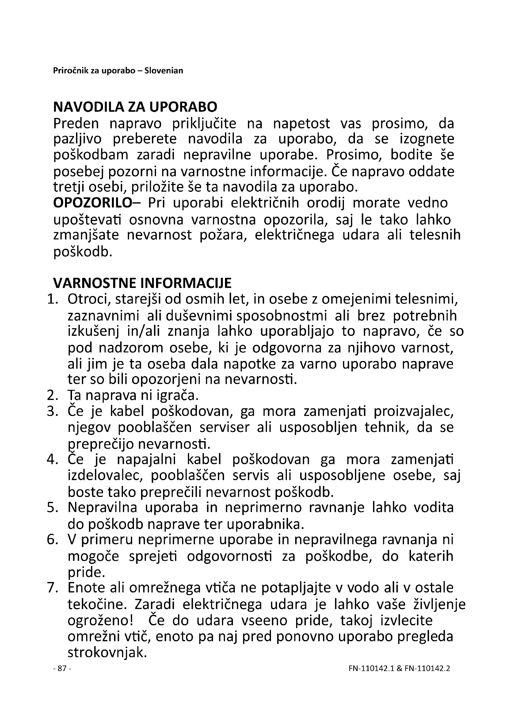 tekočine. Zaradi električnega udara je lahko vaše življenje ogroženo! Če do udara vseeno pride, takoj izvlecite omrežni vtič, enoto pa naj pred ponovno uporabo pregleda strokovnjak.- 88 - FN-110142.1 & FN-110142.2