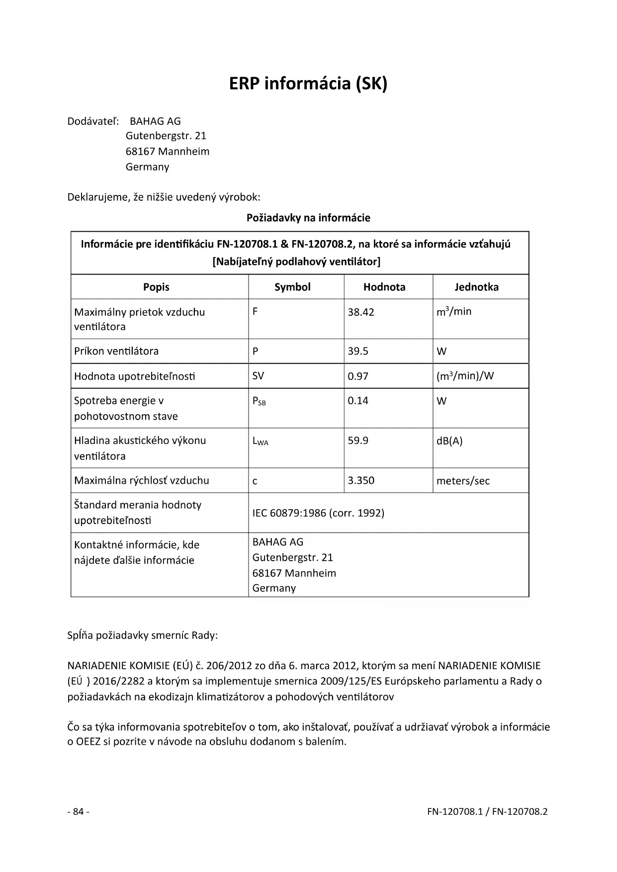 Vhod za adapter: 100-240V~, 50/60Hz, 1A Izhod za adapter: 24V 1.5A Dovod energije ventilatorja: 24V 1A Uporabljajte samo z napajalno enoto TP04-240150E Recikliranje – Evropska direktiva 2012/19/EU Ta simbol označuje, da tega izdelka ni dovoljeno odložiti med druge gospodinjske odpadke. Da bi preprečili negativne vplive na zdravje ljudi in okolje, odpadke reciklirajte, saj tako pospešujete ponovno uporabo materialnih virov. Rabljeno napravo odvrzite v skladu s postopki za vračanje in zbiranje ali pa stopite v stik s trgovcem, pri katerem ste izdelek kupili. Oni ta izdelek lahko pošljejo v okolju prijazno reciklažo.- 88 - FN-120708.1 / FN-120708.2 Podatki ERP (SI) Dobavitelj: BAHAG AG Gutenbergstr. 21 68167 Mannheim Germany Izjavljamo, da spodaj opisani izdelek: Potrebni podatki Podatki za identifikacijo FN-120708.1 & FN-120708.2, na kar se nanašajo ti podatki [Akumulatorski samostoječi ventilator] Opis Simbol Vrednost Enota Maksimalna stopnja pretoka ventilatorja