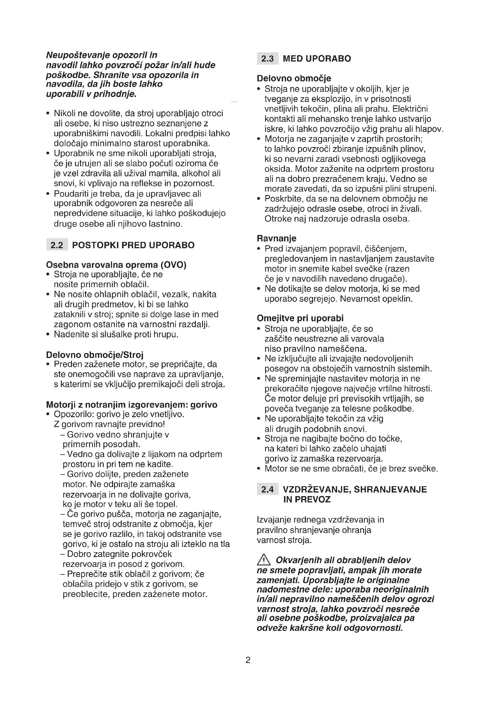 Varnostni predpisi, ki jih morate upoštevati med vzdrževalnimi postopki, so opisani v odst. 2.4. Vse pregledi in vzdrževalni posegi se morajo izvajati pri ustavljenem stroju in ugasnjenem motorju. Pred vsakim čiščenjem in vzdrževanjem odklopite svečko in preberite ustrezna navodila. Pred vzdrževanjem si nadenite ustrezna oblačila, rokavice in očala.