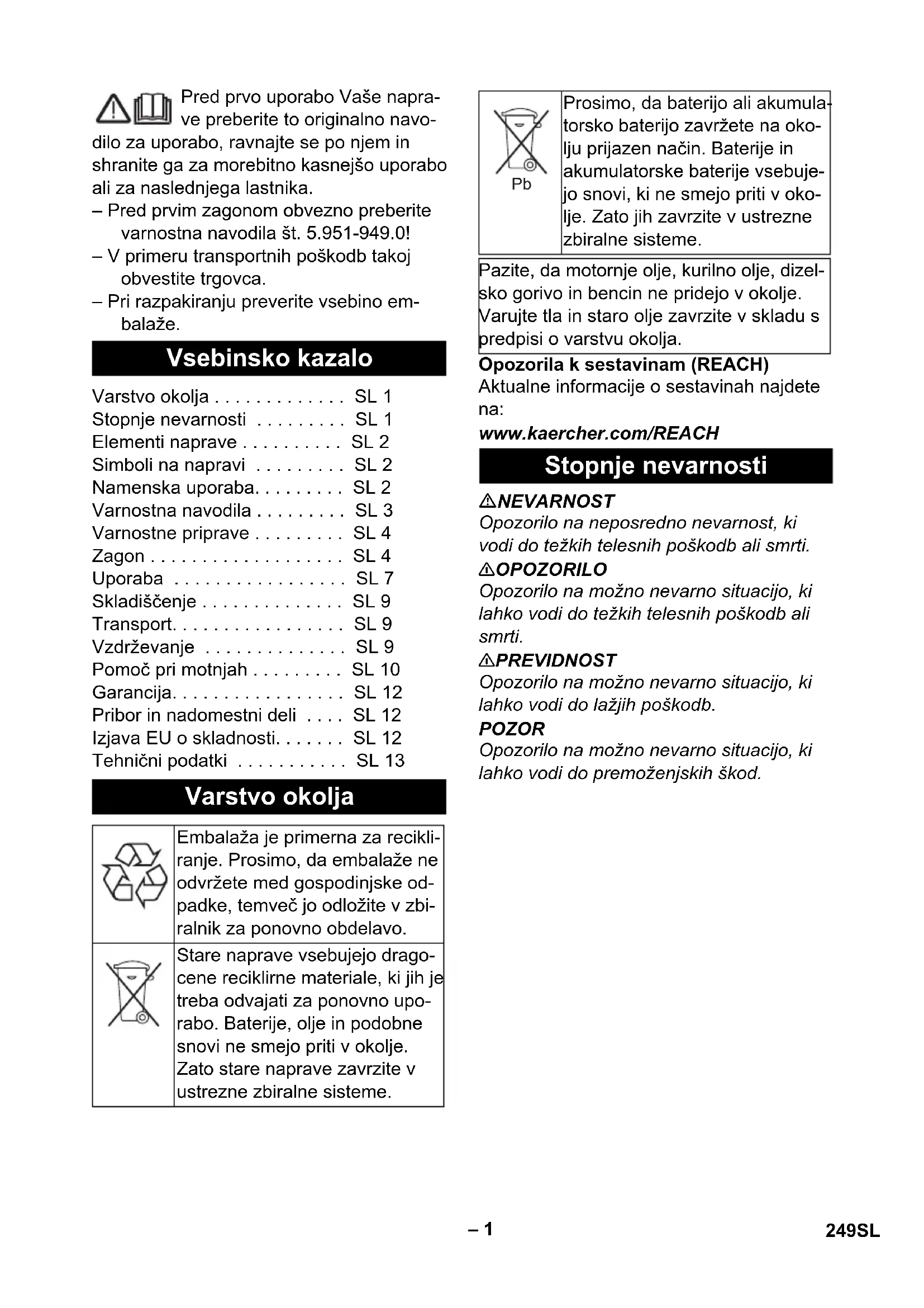 248 CS– 1 Pred prvo uporabo Vaše napra- ve preberite to originalno navo- dilo za uporabo, ravnajte se po njem in shranite ga za morebitno kasnejšo uporabo ali za naslednjega lastnika. – Pred prvim zagonom obvezno preberite varnostna navodila št. 5.951-949.0! – V primeru transportnih poškodb takoj obvestite trgovca. – Pri razpakiranju preverite vsebino em- balaže. Opozorila k sestavinam (REACH) Aktualne informacije o sestavinah najdete na: www.kaercher.com/REACH NEVARNOST Opozorilo na neposredno nevarnost, ki vodi do težkih telesnih poškodb ali smrti. 몇 OPOZORILO Opozorilo na možno nevarno situacijo, ki lahko vodi do težkih telesnih poškodb ali smrti. 몇 PREVIDNOST Opozorilo na možno nevarno situacijo, ki lahko vodi do lažjih poškodb. POZOR Opozorilo na možno nevarno situacijo, ki lahko vodi do premoženjskih škod. Vsebinsko kazalo Varstvo okolja . . . . . . . . . . . . . SL 1 Stopnje nevarnosti . . . . . . . . . SL 1 Elementi naprave . . . . . . . . . . SL 2 Simboli na napravi . . . . . . . . . SL 2 Namenska uporaba. . . . . . . . . SL 2 Varnostna navodila . . . . . . . . . SL 3 Varnostne priprave . . . . . . . . . SL 4 Zagon . . . . . . . . . . . . . . . . . . . SL 4 Uporaba . . . . . . . . . . . . . . . . . SL 7 Skladiščenje . . . . . . . . . . . . . . SL 9 Transport. . . . . . . . . . . . . . . . . SL 9 Vzdrževanje . . . . . . . . . . . . . . SL 9 Pomoč pri motnjah . . . . . . . . . SL 10 Garancija. . . . . . . . . . . . . . . . . SL 12 Pribor in nadomestni deli . . . . SL 12 Izjava EU o skladnosti. . . . . . . SL 12 Tehnični podatki . . . . . . . . . . . SL 13 Varstvo okolja Embalaža je primerna za recikli- ranje. Prosimo, da embalaže ne odvržete med gospodinjske od- padke, temveč jo odložite v zbi- ralnik za ponovno obdelavo. Stare naprave vsebujejo drago- cene reciklirne materiale, ki jih je treba odvajati za ponovno upo- rabo. Baterije, olje in podobne snovi ne smejo priti v okolje. Zato stare naprave zavrzite v ustrezne zbiralne sisteme. Prosimo, da baterijo ali akumula- torsko baterijo zavržete na oko- lju prijazen način. Baterije in akumulatorske baterije vsebuje- jo snovi, ki ne smejo priti v oko- lje. Zato jih zavrzite v ustrezne zbiralne sisteme. Pazite, da motornje olje, kurilno olje, dizel- sko gorivo in bencin ne pridejo v okolje. Varujte tla in staro olje zavrzite v skladu s predpisi o varstvu okolja. Stopnje nevarnosti