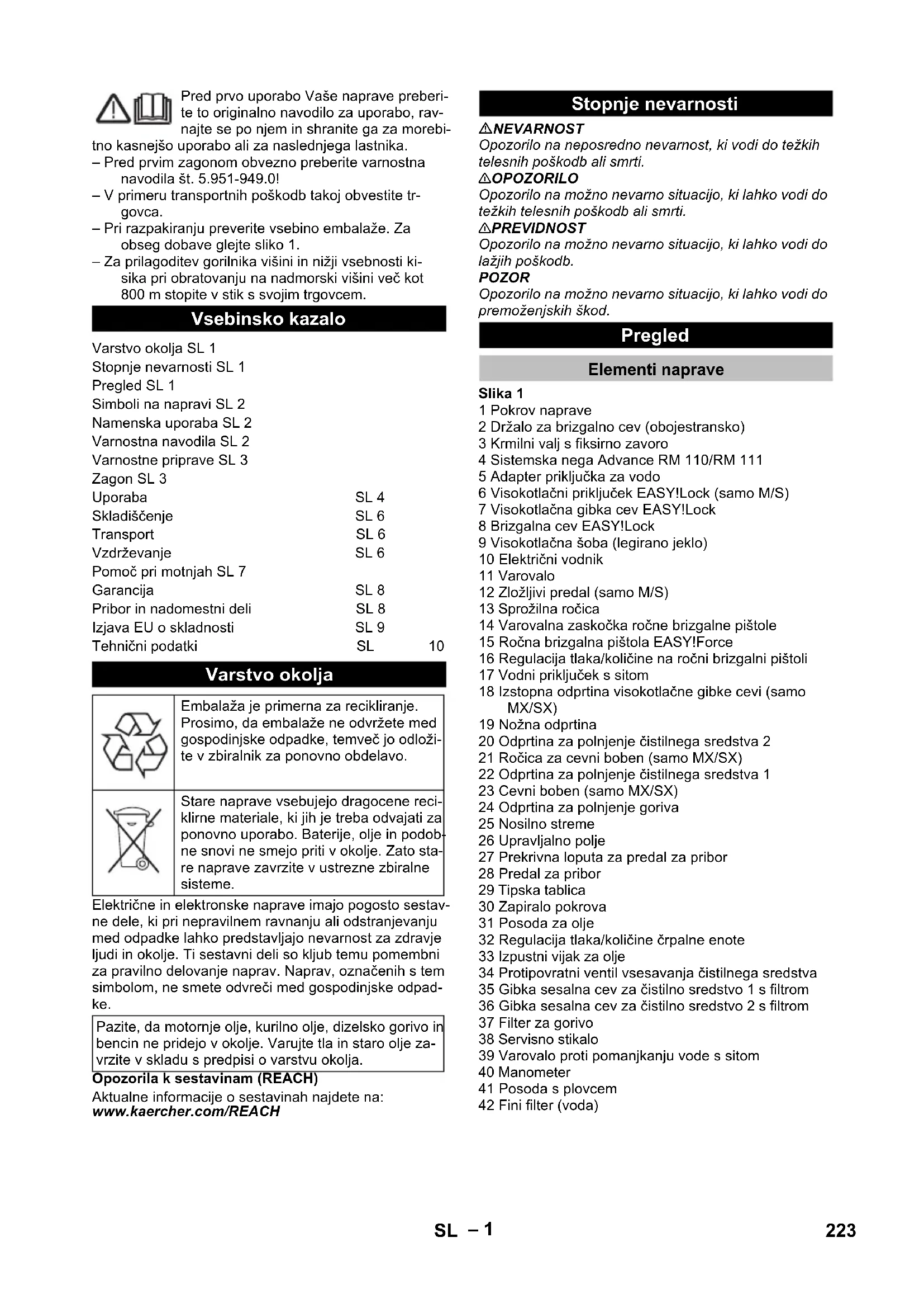 1,0 1,0 Provozní látky Palivo -- Topný olej EL nebo nafta Topný olej EL nebo nafta Množství l 1,0 1,0 Druh -- SAE 90 SAE 90 Rozměry a hmotnost Délka x Šířka x Výška mm 1330 x 750 x 1060 1330 x 750 x 1060 Typická provozní hmotnost, S kg 200 200 Typická provozní hmotnost, SX kg 205 205 Palivová nádrž l 25 25 Čistidlová nádrž l 10+20 10+20 222 CS– 1 Pred prvo uporabo Vaše naprave preberi- te to originalno navodilo za uporabo, rav- najte se po njem in shranite ga za morebi- tno kasnejšo uporabo ali za naslednjega lastnika. – Pred prvim zagonom obvezno preberite varnostna navodila št. 5.951-949.0! – V primeru transportnih poškodb takoj obvestite tr- govca. – Pri razpakiranju preverite vsebino embalaže. Za obseg dobave glejte sliko 1. – Za prilagoditev gorilnika višini in nižji vsebnosti ki- sika pri obratovanju na nadmorski višini več kot 800 m stopite v stik s svojim trgovcem. Električne in elektronske naprave imajo pogosto sestav- ne dele, ki pri nepravilnem ravnanju ali odstranjevanju med odpadke lahko predstavljajo nevarnost za zdravje ljudi in okolje. Ti sestavni deli so kljub temu pomembni za pravilno delovanje naprav. Naprav, označenih s tem simbolom, ne smete odvreči med gospodinjske odpad- ke. Opozorila k sestavinam (REACH) Aktualne informacije o sestavinah najdete na: www.kaercher.com/REACH NEVARNOST Opozorilo na neposredno nevarnost, ki vodi do težkih telesnih poškodb ali smrti. 몇 OPOZORILO Opozorilo na možno nevarno situacijo, ki lahko vodi do težkih telesnih poškodb ali smrti. 몇 PREVIDNOST Opozorilo na možno nevarno situacijo, ki lahko vodi do lažjih poškodb. POZOR Opozorilo na možno nevarno situacijo, ki lahko vodi do premoženjskih škod. Slika 1 1 Pokrov naprave 2 Držalo za brizgalno cev (obojestransko) 3 Krmilni valj s fiksirno zavoro 4 Sistemska nega Advance RM 110/RM 111 5 Adapter priključka za vodo 6 Visokotlačni priključek EASY!Lock (samo M/S) 7 Visokotlačna gibka cev EASY!Lock 8 Brizgalna cev EASY!Lock 9 Visokotlačna šoba (legirano jeklo) 10 Električni vodnik 11 Varovalo 12 Zložljivi predal (samo M/S) 13 Sprožilna ročica 14 Varovalna zaskočka ročne brizgalne pištole 15 Ročna brizgalna pištola EASY!Force 16 Regulacija tlaka/količine na ročni brizgalni pištoli 17 Vodni priključek s sitom 18 Izstopna odprtina visokotlačne gibke cevi (samo MX/SX) 19 Nožna odprtina 20 Odprtina za polnjenje čistilnega sredstva 2 21 Ročica za cevni boben (samo MX/SX) 22 Odprtina za polnjenje čistilnega sredstva 1 23 Cevni boben (samo MX/SX) 24 Odprtina za polnjenje goriva 25 Nosilno streme 26 Upravljalno polje 27 Prekrivna loputa za predal za pribor 28 Predal za pribor 29 Tipska tablica 30 Zapiralo pokrova 31 Posoda za olje 32 Regulacija tlaka/količine črpalne enote 33 Izpustni vijak za olje 34 Protipovratni ventil vsesavanja čistilnega sredstva 35 Gibka sesalna cev za čistilno sredstvo 1 s filtrom 36 Gibka sesalna cev za čistilno sredstvo 2 s filtrom 37 Filter za gorivo 38 Servisno stikalo 39 Varovalo proti pomanjkanju vode s sitom 40 Manometer 41 Posoda s plovcem 42 Fini filter (voda) Vsebinsko kazalo Varstvo okolja SL 1 Stopnje nevarnosti SL 1 Pregled SL 1 Simboli na napravi SL 2 Namenska uporaba SL 2 Varnostna navodila SL 2 Varnostne priprave SL 3 Zagon SL 3 Uporaba SL 4 Skladiščenje SL 6 Transport SL 6 Vzdrževanje SL 6 Pomoč pri motnjah SL 7 Garancija SL 8 Pribor in nadomestni deli SL 8 Izjava EU o skladnosti SL 9 Tehnični podatki SL 10 Varstvo okolja Embalaža je primerna za recikliranje. Prosimo, da embalaže ne odvržete med gospodinjske odpadke, temveč jo odloži- te v zbiralnik za ponovno obdelavo. Stare naprave vsebujejo dragocene reci- klirne materiale, ki jih je treba odvajati za ponovno uporabo. Baterije, olje in podob- ne snovi ne smejo priti v okolje. Zato sta- re naprave zavrzite v ustrezne zbiralne sisteme. Pazite, da motornje olje, kurilno olje, dizelsko gorivo in bencin ne pridejo v okolje. Varujte tla in staro olje za- vrzite v skladu s predpisi o varstvu okolja. Stopnje nevarnosti Pregled Elementi naprave 223SL– 2 Slika 2 A Stikalo naprave B Regulator temperature C Dozirni ventil za čistilo 1 Način obratovanja: obratovanje s hladno vodo 2 Način obratovanja: način Eco (temperatura vroče vode največ 60 °C) 3 Način obratovanja: obratovanje z vročo vodo/paro 4 Kontrolna lučka črpalke 5 Kontrolna lučka za smer vrtenja (ne pri HDS 7/9, HDS 7/10, HDS 7/12) 6 Kontrolna lučka pripravljenosti za obratovanje 7 Kontrolna lučka za gorivo 8 Kontrolna lučka za čistilo 1 (samo pri HDS 12/18, HDS 13/20) 9 Kontrolna lučka za motor 10 Kontrolna lučka motnje gorilnika 11 Kontrolna lučka za servis 12 Kontrolna lučka za sistemsko nego 13 Kontrolna lučka za čistilo 2 (samo pri HDS 12/18, HDS 13/20) – Upravljalni elementi za proces čiščenja so rumeni. – Upravljalni elementi za vzdrževanje in servisiranje so svetlo sivi. Visokotlačni curki so lahko pri nestrokovni uporabi nevarni. Curka ne smete usmerja- ti na osebe, živali, aktivno električno opre- mo ali na samo napravo. Čiščenje: strojev, vozil, zgradb, orodja, fasad, teras, vr- tnega orodja, itd. NEVARNOST Nevarnost poškodb! Pri uporabi na bencinskih črpalkah ali drugih nevarnih območjih upoštevajte ustrezne var- nostne predpise. Zahteve za kakovost vode: POZOR Kot visokotlačni medij uporabljajte samo čisto vodo. Umazanija povzroči predčasno obrabo ali nastanek oblog v napravi. Če se uporabi reciklirana voda, se naslednjih mejnih vrednsoti ne sme prekoračiti. – Upoštevajte ustrezne nacionalne predpise zakono- dajalca za škropilnike tekočin. – Upoštevajte ustrezne nacionalne predpise zakono- dajalca za preprečevanje nesreč. Škropilnik teko- čin je potrebno redno pregledovati in o rezultatu pregleda je potrebno podati pismeno izjavo. – Ogrevalnik naprave je gorilna naprava. Gorilne na- prave morajo biti redno pčregledovane v skladu z ustreznimi nacionalnimi predpisi zakonodajalca. – V skl
