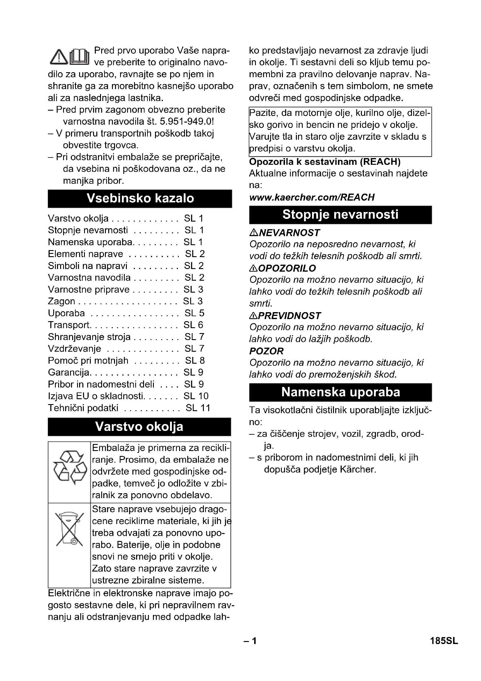 Vodni priključek Parameter Vrednost pH vrednost 6,5...9,5 električna prevodnost max. 2000 μS/cm Ogljikovodiki < 0,01 mg/l Klorid < 250 mg/l Kalcij < 200 mg/l Skupna trdota < 28 °dH Železo < 0,2 mg/l Mangan < 0,05 mg/l Baker < 0,02 mg/l Sulfat < 240 mg/l Aktivni klor < 0,1 mg/l brez neprijetnih vonjev 188 SL– 5 Gibko cev priključite na vodni priključek naprave. Gibko cev priključite na pipo. NEVARNOST Nikoli ne sesajte vode iz posode s pitno vo- do. Ta visokotlačni čistilnik je z ustreznim pri- borom primeren za sesanje površinske vode npr. iz sodov za deževnico ali ribnikov (sesalna višina maks. 0,5 m). NEVARNOST Nikoli ne sesajte tekočin, ki vsebujejo topi- la, ali nerazredčenih kislin in topil! Sem spadajo npr. bencin, razredčila ali kurilno olje. Razpršena meglica je visoko vnetljiva, eksplozivna in strupena. Ne uporabljajte acetona, nerazredčenih kislin in topil, ker le-ti uničujejo materiale, uporabljene na na- pravi. Standardni vodni priključek ni primeren za sesanje, zato uporabite Kärcher se- salno cev (premer najmanj 1 cola) s fil- trom (pribor). Odprite dovod vode. Odvijte šobo. Pritisnite ročico ročne brizgalne pištole. Napravo vklopite in pustite teči tako dol- go, da voda iz brizgalne cevi izstopa brez mehurčkov. Napravo izklopite in šobo ponovno pri- vijte. NEVARNOST – Nevarnost poškodbe! Naprave nikoli ne uporabljajte brez montirane brizgalne cevi. Pred vsako uporabo preverite tr- dnost naseda brizgalne cevi. Privijače- nje brizgalne cevi mora biti trdno privito. – Pri uporabi naprave v območjih nevarno- sti (npr. bencinske črpalke) je treba upo- števati ustrezne varnostne predpise. – Nevarnost poškodb! Sprožilna ročica in varnostna ročica med obratovanjem ne smeta biti zagozdeni. – Nevarnost poškodb! Pri poškodovani var- nostni ročici poiščite servisno službo. – Nevarnost poškodb zaradi visokotlač- nega vodnega curka. Varnostno za- skočko na ročni brizgalni pištoli pred vsemi deli na napravi potisnite naprej. 몇 PREVIDNOST Motorje čistite le na mestih z ustreznim iz- ločevalnikom olja (zaščita okolja). Odpiranje ročne brizgalne pištole: Po- vlecite za varnostno in sprožilno ročico. Zapiranje ročne brizgalne pištol: Spusti- te varnostno in sprožilno ročico. Odprite dovod vode. Vtaknite omrežni vtič. Stikalo naprave obrnite na "I". Sprostite ročno brizgalno pištolo. V ta namen varnostno zaskočko potisnite nazaj. Odprite ročno brizgalno pištolo. Naprava je opremljena s sledečimi šobami: – Močna šoba, 25° brizgalni kot – Vrtljiva šoba – Za običajne čistilne naloge – za trdovratno umazanijo NEVARNOST Pri nastavljanju regulatorja tlaka in količine pazite na to, da se privijačenje brizgalne cevi ne odvije. Delovni tlak in pretok se lahko nastavita na črpalki ali na ročni brizgalni pištoli. Reduciranje tlaka/količine se ne sme izva- jati na obeh regulatorjih hkrati. Zato se mora obvezno upoštevati sledeč postopek: Sesanje vode iz posod Odzračenje naprave Uporaba Odpiranje/zapiranje ročne brizgalne pištole Vklop naprave Delo z visokom tlakom Močna šoba Vrtljiva šoba Nastavitev delovnega pritiska in pretočne količine 189SL– 6 Regulator tlaka/količine na ročni bri- zgalni pištoli nastavite na maksimalen delovni tlak in pretok (+). Delovni tlak in pretok nastavite z obra- čanjem regulatorja tlaka/količine na čr- palki. Delovni tlak lahko odčitate na manometru. Odprite ročno brizgalno pištolo. Regulator tlaka/količine na črpalki z obračanjem v smeri urnega kazalca na- stavite na maksimalen delovni tlak in pretok. Delovni tlak in pretok nastavite z obra- čanjem regulatorja tlaka/količine na roč- ni brizgalni pištoli (+/-). Odprite ročno brizgalno pištolo. Zaprite ročno brizgalno pištolo. Naprava se izklopi po 30 sekundah. Zavarujte ročno brizgalno pištolo. V ta namen varnostno zaskočko potisnite naprej. Ročno brizgalno pištolo skupaj z bri- zgalno cevjo odložite v predal za bri- zgalno cev. Po prekinitvi: Sprostite ročno brizgalno pištolo. V ta namen varnostno zaskočko potisnite nazaj. Odprite ročno brizgalno pištolo. Naprava se ponovno vklopi. Po obratovanju s slano vodo (morsko vodo) napravo z odprto ročno brizgalno pištolo najmanj 2–3 minute izpirajte z vodovodno vodo. Zaprite dovod vode. Odprite ročno brizgalno pištolo. Črpalko vklopite s stikalom naprave in jo pustite teči 5–10 sekund. Zaprite ročno brizgalno pištolo. Stikalo stroja na "0/OFF". Omrežni vtič izvlecite iz vtičnice le s su- himi rokami. Odstranite vodni priključek. Pritiskajte ročno brizgalno pištolo, do- kler naprava ni več pod pritiskom. Zavarujte ročno brizgalno pištolo. V ta namen varnostno zaskočko potisnite naprej. Omrežni priključni kabel, visokotlačno gibko cev in pribor pospravite na napravo. POZOR Nevarnost poškodbe! Zmrznjena voda v napravi lahko uniči njene dele. Pozimi shranjujte napravo v ogrevanem prostoru ali pa jo izpraznite. Pri daljših obratovalnih premorih je priporočljivo skozi napravo prečrpati sredstvo proti zamrznitvi. Dovodno cev za vodo in visokotlačno cev odvijte. Stroj izpihajte s komprimiranim zrakom. Napotek: Uporabite običajno zaščitno sredstvo proti zmrzali za avtomobile na glikolni osnovi. Upoštevajte navodila za uporabo proizva- jalca sredstva proti zmrzovanju. 몇 PREVIDNOST Nevarnost osebnih poškodb in poškodb stvari! Pri transportu upoštevajte težo na- prave. POZOR Sprožilno ročico med transportom zaščitite pred poškodbami. Potisno streme pritisnite navzdol in po- tisnite napravo. Regulacija tlaka/količine na črpalki Regulacija tlaka/količine na ročni brizgalni pištoli Prekinitev obratovanja Izklop stroja Zaščita pred zamrznitvijo Izpust vode Izplakovanje naprave s sredstvom proti zmrznitvi Transport Vožnja 190 SL– 7 Dvižno napravo pritrdite v sredini opor- nika za nakladanje z žerjavom. NEVARNOST Nevarnost poškodb zaradi padajoče naprave. – Upoštevajte lokalne predpise o prepre