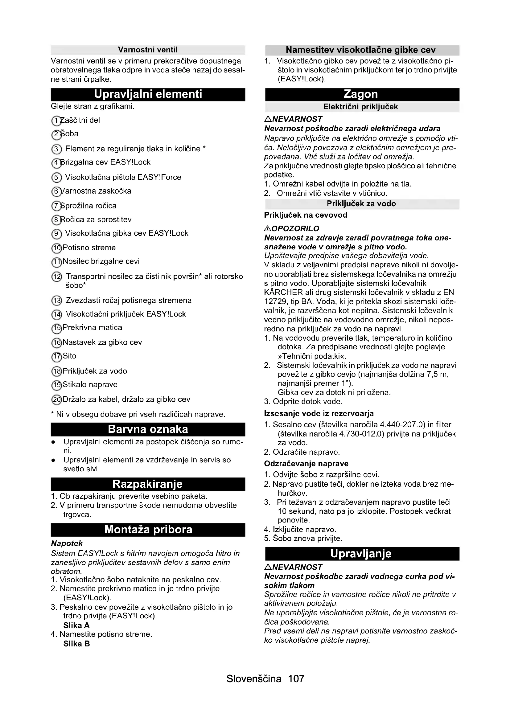 štolo in visokotlačnim priključkom ter jo trdno privijte (EASY!Lock). Zagon Električni priključek NEVARNOST Nevarnost poškodbe zaradi električnega udara Napravo priključite na električno omrežje s pomočjo vti- ča. Neločljiva povezava z električnim omrežjem je pre- povedana. Vtič služi za ločitev od omrežja. Za priključne vrednosti glejte tipsko ploščico ali tehnične podatke.