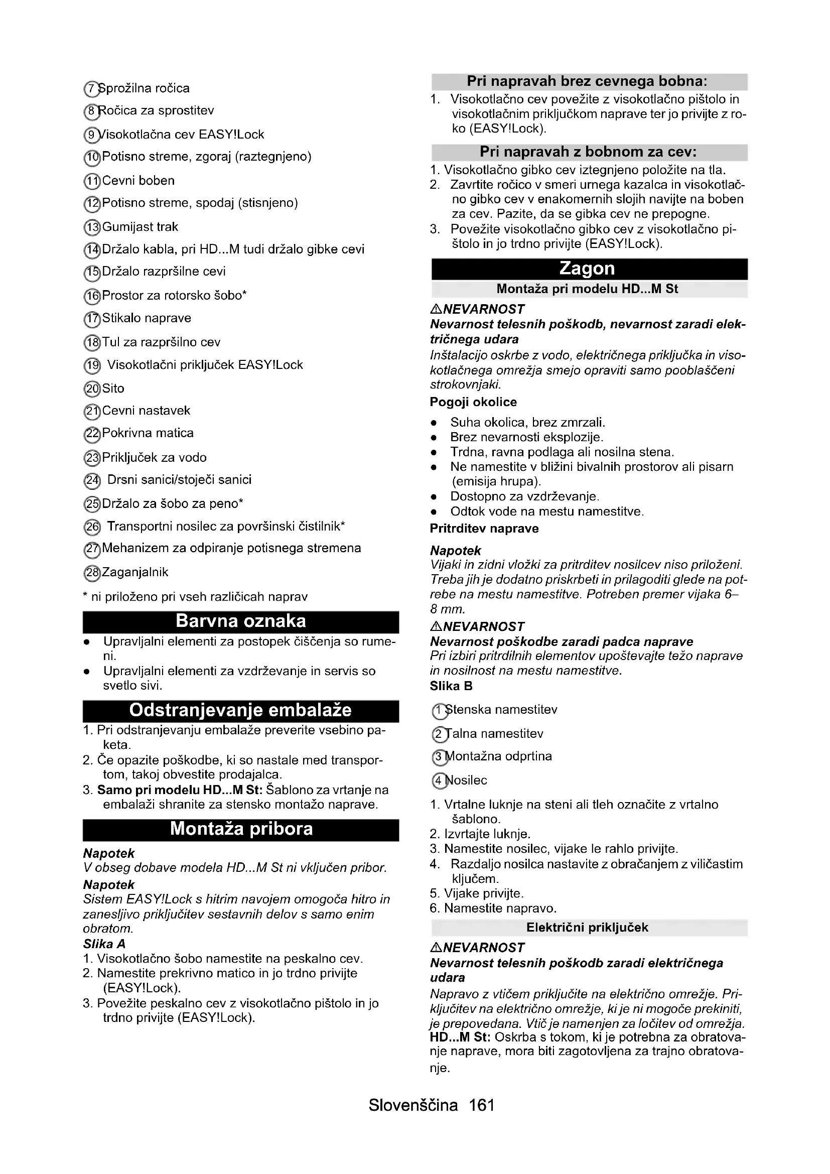 Električni priključek NEVARNOST Nevarnost telesnih poškodb zaradi električnega udara Napravo z vtičem priključite na električno omrežje. Pri- ključitev na električno omrežje, ki je ni mogoče prekiniti, je prepovedana. Vtič je namenjen za ločitev od omrežja. HD...M St: Oskrba s tokom, ki je potrebna za obratova- nje naprave, mora biti zagotovljena za trajno obratova- nje.162 Slovenščina HD...M St: Deli, kabli in naprave v delovnem območju, ki so pod električno napetostjo, morajo biti zaščiteni pred brizganjem vode.