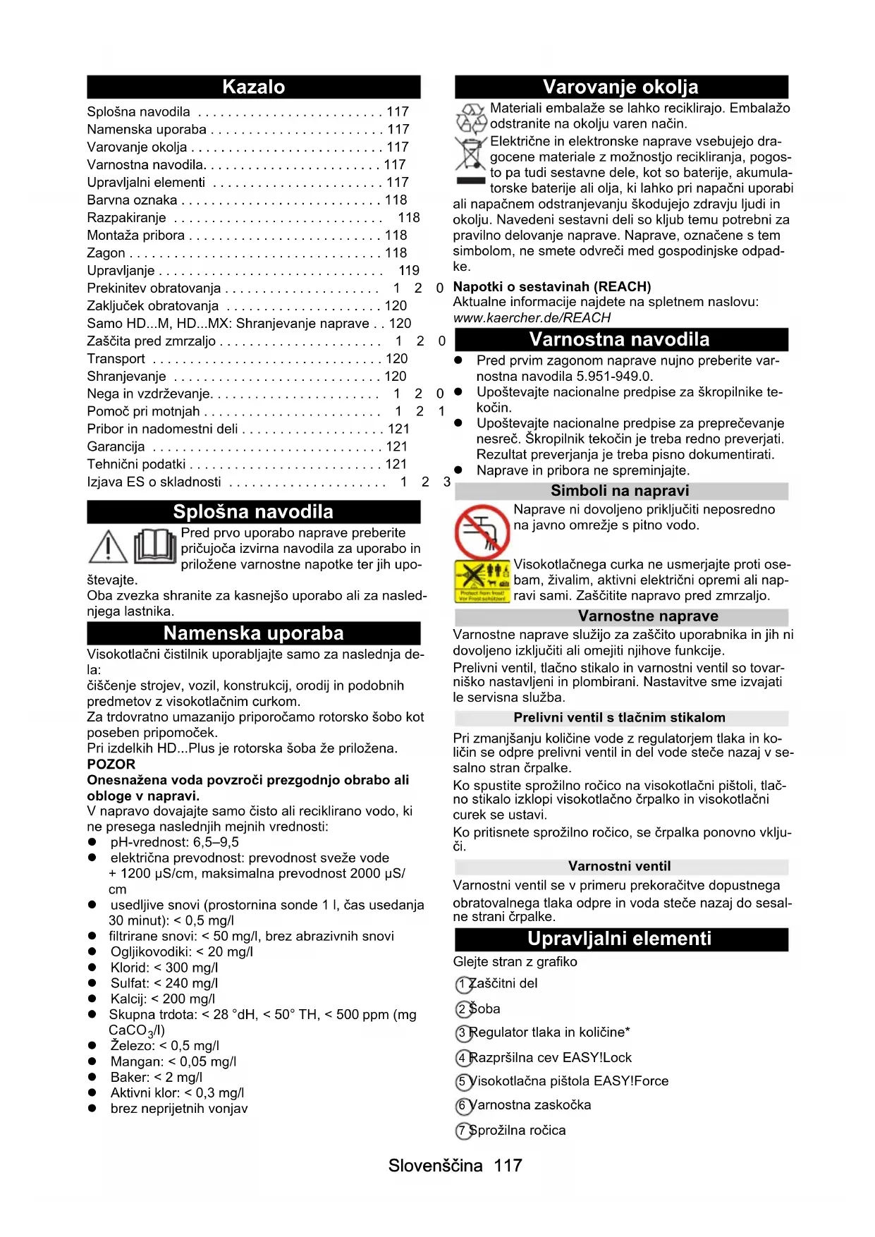 - /l) Železo: < 0,5 mg/l Mangan: < 0,05 mg/l Baker: < 2 mg/l Aktivni klor: < 0,3 mg/l brez neprijetnih vonjav Varovanje okolja Materiali embalaže se lahko reciklirajo. Embalažo odstranite na okolju varen način. Električne in elektronske naprave vsebujejo dra- gocene materiale z možnostjo recikliranja, pogos- to pa tudi sestavne dele, kot so baterije, akumula- torske baterije ali olja, ki lahko pri napačni uporabi ali napačnem odstranjevanju škodujejo zdravju ljudi in okolju. Navedeni sestavni deli so kljub temu potrebni za pravilno delovanje naprave. Naprave, označene s tem simbolom, ne smete odvreči med gospodinjske odpad- ke. Napotki o sestavinah (REACH) Aktualne informacije najdete na spletnem naslovu: www.kaercher.de/REACH Varnostna navodila Pred prvim zagonom naprave nujno preberite var- nostna navodila 5.951-949.0. Upoštevajte nacionalne predpise za škropilnike te- kočin. Upoštevajte nacionalne predpise za preprečevanje nesreč. Škropilnik tekočin je treba redno preverjati. Rezultat preverjanja je treba pisno dokumentirati. Naprave in pribora ne spreminjajte. Simboli na napravi Naprave ni dovoljeno priključiti neposredno na javno omrežje s pitno vodo. Visokotlačnega curka ne usmerjajte proti ose- bam, živalim, aktivni električni opremi ali nap- ravi sami. Zaščitite napravo pred zmrzaljo. Varnostne naprave Varnostne naprave služijo za zaščito uporabnika in jih ni dovoljeno izključiti ali omejiti njihove funkcije. Prelivni ventil, tlačno stikalo in varnostni ventil so tovar- niško nastavljeni in plombirani. Nastavitve sme izvajati le servisna služba. Prelivni ventil s tlačnim stikalom Pri zmanjšanju količine vode z regulatorjem tlaka in ko- ličin se odpre prelivni ventil in del vode steče nazaj v se- salno stran črpalke. Ko spustite sprožilno ročico na visokotlačni pištoli, tlač- no stikalo izklopi visokotlačno črpalko in visokotlačni curek se ustavi. Ko pritisnete sprožilno ročico, se črpalka ponovno vklju- či. Varnostni ventil Varnostni ventil se v primeru prekoračitve dopustnega obratovalnega tlaka odpre in voda steče nazaj do sesal- ne strani črpalke. Upravljalni elementi Glejte stran z grafiko 1 Zaščitni del 2 Šoba 3 Regulator tlaka in količine* 4 Razpršilna cev EASY!Lock 5 Visokotlačna pištola EASY!Force 6 Varnostna zaskočka 7 Sprožilna ročica Splošna navodila p. 117