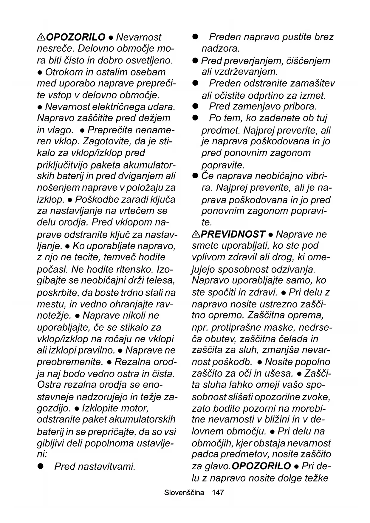 • Izjava EU o skladnosti Chairman of the Board of ManagementDirector Regulatory Affairs & Certification H. Jenner S. ReiserSlovenščina 147 몇 OPOZORILO ● Nevarnost nesreče. Delovno območje mo- ra biti čisto in dobro osvetljeno. ● Otrokom in ostalim osebam med uporabo naprave prepreči- te vstop v delovno območje. ● Nevarnost električnega udara. Napravo zaščitite pred dežjem in vlago. ● Preprečite nename- ren vklop. Zagotovite, da je sti- kalo za vklop/izklop pred priključitvijo paketa akumulator- skih baterij in pred dviganjem ali nošenjem naprave v položaju za izklop. ● Poškodbe zaradi ključa za nastavljanje na vrtečem se delu orodja. Pred vklopom na- prave odstranite ključ za nastav- ljanje. ● Ko uporabljate napravo, z njo ne tecite, temveč hodite počasi. Ne hodite ritensko. Izo- gibajte se neobičajni drži telesa, poskrbite, da boste trdno stali na mestu, in vedno ohranjajte rav- notežje. ● Naprave nikoli ne uporabljajte, če se stikalo za vklop/izklop na ročaju ne vklopi ali izklopi pravilno. ● Naprave ne preobremenite. ● Rezalna orod- ja naj bodo vedno ostra in čista. Ostra rezalna orodja se eno- stavneje nadzorujejo in težje za- gozdijo. ● Izklopite motor, odstranite paket akumulatorskih baterij in se prepričajte, da so vsi gibljivi deli popolnoma ustavlje- ni: Pred nastavitvami. Preden napravo pustite brez nadzora. Pred preverjanjem, čiščenjem ali vzdrževanjem. Preden odstranite zamašitev ali očistite odprtino za izmet. Pred zamenjavo pribora. Po tem, ko zadenete ob tuj predmet. Najprej preverite, ali je naprava poškodovana in jo pred ponovnim zagonom popravite. Če naprava neobičajno vibri- ra. Najprej preverite, ali je na- prava poškodovana in jo pred ponovnim zagonom popravi- te. 몇 PREVIDNOST ● Naprave ne smete uporabljati, ko ste pod vplivom zdravil ali drog, ki ome- jujejo sposobnost odzivanja. Napravo uporabljajte samo, ko ste spočiti in zdravi. ● Pri delu z napravo nosite ustrezno zašči- tno opremo. Zaščitna oprema, npr. protiprašne maske, nedrse- ča obutev, zaščitna čelada in zaščita za sluh, zmanjša nevar- nost poškodb. ● Nosite popolno zaščito za oči in ušesa. ● Zašči- ta sluha lahko omeji vašo spo- sobnost slišati opozorilne zvoke, zato bodite pozorni na morebi- tne nevarnosti v bližini in v de- lovnem območju. ● Pri delu na območjih, kjer obstaja nevarnost padca predmetov, nosite zaščito za glavo.OPOZORILO ● Pri de- lu z napravo nosite dolge težke148 Slovenščina hlače, oblačila z dolgimi rokavi in nedrseče čevlje. Nikoli ne de- lajte bosi. Ne nosite sandal ali kratkih hlač. Izogibajte se ohlap- nim oblačilom ali oblačilom s čipkami in trakovi.PREVI- DNOST ● Obstaja nevarnost poškodb, če gibljivi deli naprave zagrabijo ohlapna oblačila, lase ali nakit. Preprečite stik oblačil in nakita z gibljivimi deli stroja. Dol- ge lase spnite nazaj. ● Napravo in pribor uporabljajte samo v skladu s temi navodili. Upošte- vajte delovne pogoje in delo, ki ga je treba opraviti, da se izog- nete nevarnim situacijam. Varna uporaba NEVARNOST ● Hude teles- ne poškodbe, ki nastanejo pri iz- metu predmetov iz območja rezila ali ko se žica ali kabel uja- me v rezalno orodje. Pred upo- rabo temeljito preglejte delovno območje in odstranite predmete, kot so kamni, palice, kovina, ži- ce, kosti ali igrače. 몇 OPOZORILO ● Osebe ali ot- roci z zmanjšanimi telesnimi, čutnimi ali duševnimi sposob- nostmi oziroma osebe, ki niso seznanjene s temi navodili, ne smejo uporabljati naprave. ● Napravo uporabljajte samo pri dnevni svetlobi ali dobri umetni osvetlitvi. ● Naprave ne upo- rabljajte, ko je trava mokra, ali ko dežuje. ● Ohranjajte minimal- no razdaljo do oseb in živali, ki znaša 15 m. Če kdo vstopi v to območje, ustavite napravo. ● Rezalnega nastavka ne dvi- gajte nad višino bokov. ● Napra- ve nikoli ne uporabljajte s poškodovanimi zaščitnimi na- pravami ali brez nameščenih zaščitnih naprav. ● Nikoli ne uporabljajte kovinske rezalne nitke. ● Napravo uporabljajte sa- mo na prostem. ● Rok in nog ne približajte rezalni delovni površi- ni, zlasti pri vklopu motorja. ● Nevarnost telesnih poškodb, rezalna orodja se po izklopu mo- torja še nekaj časa vrtijo. ● Ne- varnost telesnih poškodb. Nož za krajšanje rezalne nitke na za- ščitnem pokrovu je zelo oster, zato se ga ne dotikajte. To upo- števajte zlasti pri čiščenju. ● Za- gotovite, da so vse odprtine za prezračevanje brez oblog. ● Pred vsako uporabo in po vsa- kem udarcu preverite, ali je na- prava poškodovana. Poškodovane sestavne dele, npr. stikalo, mora popraviti ali zamenjati pooblaščena servisna služba. ● Prepričajte se, da je nastavek za pogonsko glavo pravilno nameščen. ● Prepričaj- te se, da so vse varnostne na- prave, deflektorji in ročaji pravilno in varno pritrjeni. ● Pred vsako uporabo se prepričajte, da je nož za nitko v pravilnem položaju in zavarovan. ● Upo-Slovenščina 149 rabljajte samo nadomestno re- zalno nitko proizvajalca. Ne uporabljajte ostalih rezalnih na- stavkov. ● Nevarnost telesnih poškodb. Naprave ne spremi- njajte. Napotek ● V nekaterih regijah lahko predpisi omejujejo upora- bo te naprave. Posvetujte se z lokalnimi organi. Varno vzdrževanje in nega 몇 OPOZORILO ● Napravo po potisku nove nitke navzven najprej postavite v običajen po- ložaj za delovanje in jo šele nato vklopite. ● Prepričajte se, da je naprava v varnem stanju, tako da v rednih časovnih presledkih preverjate, ali so vijaki, matice in sorniki tesno priviti. ● Preverite, ali gibljivi deli brezhibno delujejo in se ne zatikajo. Preverite, ali so deli zlomljeni ali poškodova- ni. Pred uporabo poskrbite za popravilo poškodovane napra- ve. ● Izklopite motor, odstranite paket akumulatorskih baterij in se prepričajte, da so vsi gibljivi deli popolnoma usta