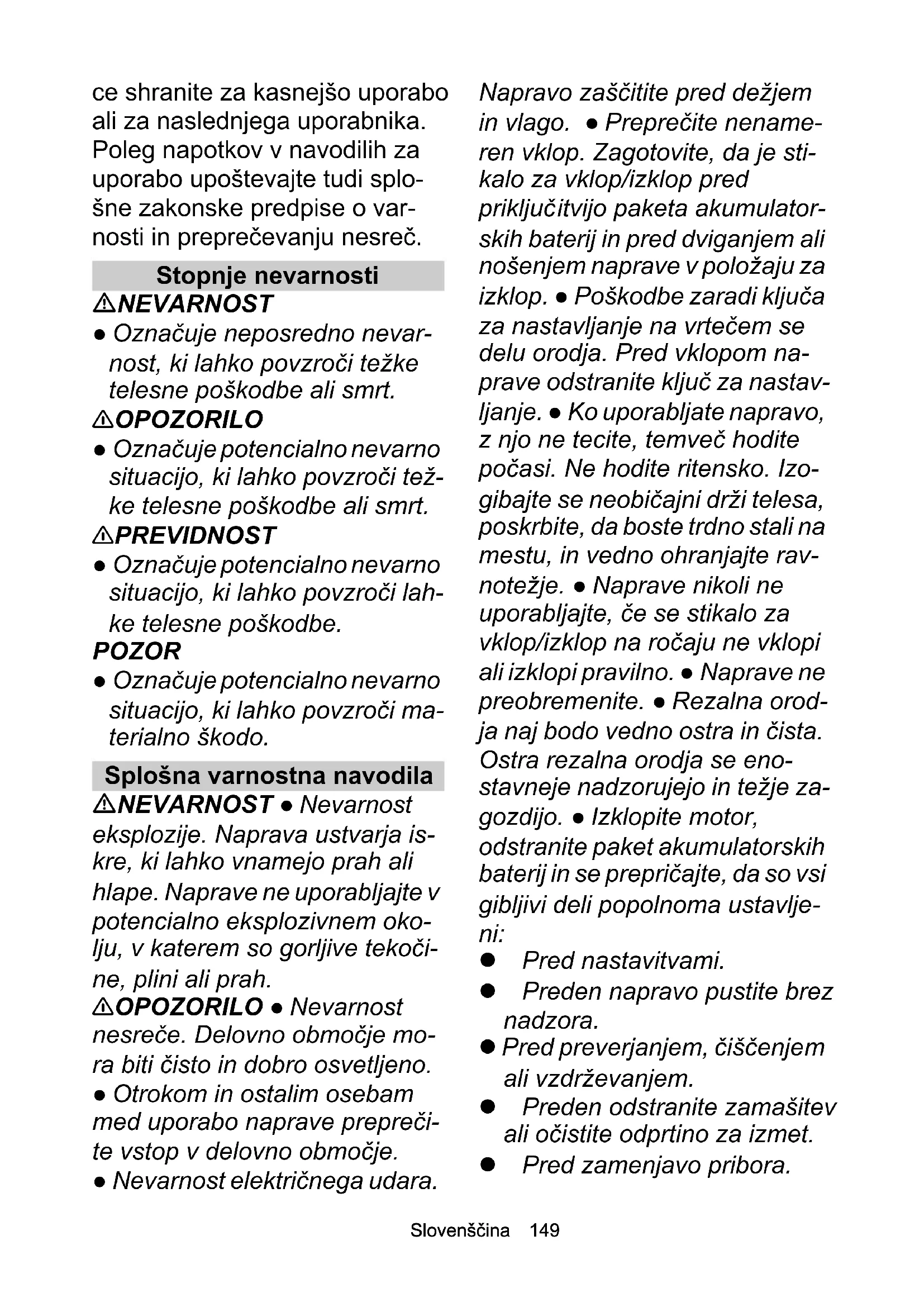 - Izjava EU o skladnosti Chairman of the Board of ManagementDirector Regulatory Affairs & Certification H. Jenner S. ReiserSlovenščina 149 ce shranite za kasnejšo uporabo ali za naslednjega uporabnika. Poleg napotkov v navodilih za uporabo upoštevajte tudi splo- šne zakonske predpise o var- nosti in preprečevanju nesreč. Stopnje nevarnosti NEVARNOST ● Označuje neposredno nevar- nost, ki lahko povzroči težke telesne poškodbe ali smrt. 몇 OPOZORILO ● Označuje potencialno nevarno situacijo, ki lahko povzroči tež- ke telesne poškodbe ali smrt. 몇 PREVIDNOST ● Označuje potencialno nevarno situacijo, ki lahko povzroči lah- ke telesne poškodbe. POZOR ● Označuje potencialno nevarno situacijo, ki lahko povzroči ma- terialno škodo. Splošna varnostna navodila NEVARNOST ● Nevarnost eksplozije. Naprava ustvarja is- kre, ki lahko vnamejo prah ali hlape. Naprave ne uporabljajte v potencialno eksplozivnem oko- lju, v katerem so gorljive tekoči- ne, plini ali prah. 몇 OPOZORILO ● Nevarnost nesreče. Delovno območje mo- ra biti čisto in dobro osvetljeno. ● Otrokom in ostalim osebam med uporabo naprave prepreči- te vstop v delovno območje. ● Nevarnost električnega udara. Napravo zaščitite pred dežjem in vlago. ● Preprečite nename- ren vklop. Zagotovite, da je sti- kalo za vklop/izklop pred priključ itvijo paketa akumulator- skih baterij in pred dviganjem ali nošenjem naprave v položaju za izklop. ● Poškodbe zaradi ključa za nastavljanje na vrtečem se delu orodja. Pred vklopom na- prave odstranite ključ za nastav- ljanje. ● Ko uporabljate napravo, z njo ne tecite, temveč hodite počasi. Ne hodite ritensko. Izo- gibajte se neobičajni drži telesa, poskrbite, da boste trdno stali na mestu, in vedno ohranjajte rav- notežje. ● Naprave nikoli ne uporabljajte, če se stikalo za vklop/izklop na ročaju ne vklopi ali izklopi pravilno. ● Naprave ne preobremenite. ● Rezalna orod- ja naj bodo vedno ostra in čista. Ostra rezalna orodja se eno- stavneje nadzorujejo in težje za- gozdijo. ● Izklopite motor, odstranite paket akumulatorskih baterij in se prepričajte, da so vsi gibljivi deli popolnoma ustavlje- ni: Pred nastavitvami. Preden napravo pustite brez nadzora. Pred preverjanjem, čiščenjem ali vzdrževanjem. Preden odstranite zamašitev ali očistite odprtino za izmet. Pred zamenjavo pribora.150 Slovenščina Po tem, ko zadenete ob tuj predmet. Najprej preverite, ali je naprava poškodovana in jo pred ponovnim zagonom popravite. Če naprava neobičajno vibri- ra. Najprej preverite, ali je na- prava poškodovana in jo pred ponovnim zagonom popravi- te. 몇 PREVIDNOST ● Naprave ne smete uporabljati, ko ste pod vplivom zdravil ali drog, ki ome- jujejo sposobnost odzivanja. Napravo uporabljajte samo, ko ste spočiti in zdravi. ● Pri delu z napravo nosite ustrezno zašči- tno opremo. Zaščitna oprema, npr. protiprašne maske, nedrse- ča obutev, zaščitna čelada in zaščita za sluh, zmanjša nevar- nost poškodb. ● Nosite popolno zaščito za oči in ušesa. ● Zašči- ta sluha lahko omeji vašo spo- sobnost slišati opozorilne zvoke, zato bodite pozorni na morebi- tne nevarnosti v bližini in v de- lovnem območju. ● Pri delu na območjih, kjer obstaja nevarnost padca predmetov, nosite zaščito za glavo.OPOZORILO ● Pri de- lu z napravo nosite dolge težke hlače, oblačila z dolgimi rokavi in nedrseče čevlje. Nikoli ne de- lajte bosi. Ne nosite sandal ali kratkih hlač. Izogibajte se ohlap- nim oblačilom ali oblačilom s čipkami in trakovi.PREVI- DNOST ● Obstaja nevarnost poškodb, če gibljivi deli naprave zagrabijo ohlapna oblačila, lase ali nakit. Preprečite stik oblačil in nakita z gibljivimi deli stroja. Dol- ge lase spnite nazaj. ● Napravo in pribor uporabljajte samo v skladu s temi navodili. Upošte- vajte delovne pogoje in delo, ki ga je treba opraviti, da se izog- nete nevarnim situacijam. Varna uporaba NEVARNOST ● Hude teles- ne poškodbe, ki nastanejo pri iz- metu predmetov iz območja rezila ali ko se žica ali kabel uja- me v rezalno orodje. Pred upo- rabo temeljito preglejte delovno območje in odstranite predmete, kot so kamni, palice, kovina, ži- ce, kosti ali igrače. 몇 OPOZORILO ● Osebe ali ot- roci z zmanjšanimi telesnimi, čutnimi ali duševnimi sposob- nostmi oziroma osebe, ki niso seznanjene s temi navodili, ne smejo uporabljati naprave. ● Napravo uporabljajte samo pri dnevni svetlobi ali dobri umetni osvetlitvi. ● Naprave ne upo- rabljajte, ko je trava mokra, ali ko dežuje. ● Ohranjajte minimal- no razdaljo do oseb in živali, ki znaša 15 m. Če kdo vstopi v to območje, ustavite napravo. ● Rezalnega nastavka ne dvi- gajte nad višino bokov. ● Napra- ve nikoli ne uporabljajte s poškodovanimi zaščitnimi na-Slovenščina 151 pravami ali brez nameščenih zaščitnih naprav. ● Nikoli ne uporabljajte kovinske rezalne nitke. ● Napravo uporabljajte sa- mo na prostem. ● Rok in nog ne približajte rezalni delovni površi- ni, zlasti pri vklopu motorja. ● Nevarnost telesnih poškodb, rezalna orodja se po izklopu mo- torja še nekaj časa vrtijo. ● Ne- varnost telesnih poškodb. Nož za krajšanje rezalne nitke na za- ščitnem pokrovu je zelo oster, zato se ga ne dotikajte. To upo- števajte zlasti pri čiščenju. ● Za- gotovite, da so vse odprtine za prezračevanje brez oblog. ● Pred vsako uporabo in po vsa- kem udarcu preverite, ali je na- prava poškodovana. Poškodovane sestavne dele, npr. stikalo, mora popraviti ali zamenjati pooblaščena servisna služba. ● Prepričajte se, da je nastavek za pogonsko glavo pravilno nameščen. ● Prepričaj- te se, da so vse varnostne na- prave, deflektorji in ročaji pravilno in varno pritrjeni. ● Pred vsako uporabo se prepričajte, da je nož za nitko v pravilnem položaju in zavarovan. ● Upo- rabljajte samo nadomestno re- zalno nitko proizvajalca. Ne uporabljajte ostalih rezalnih na- stavkov. ● Nevarnost tele