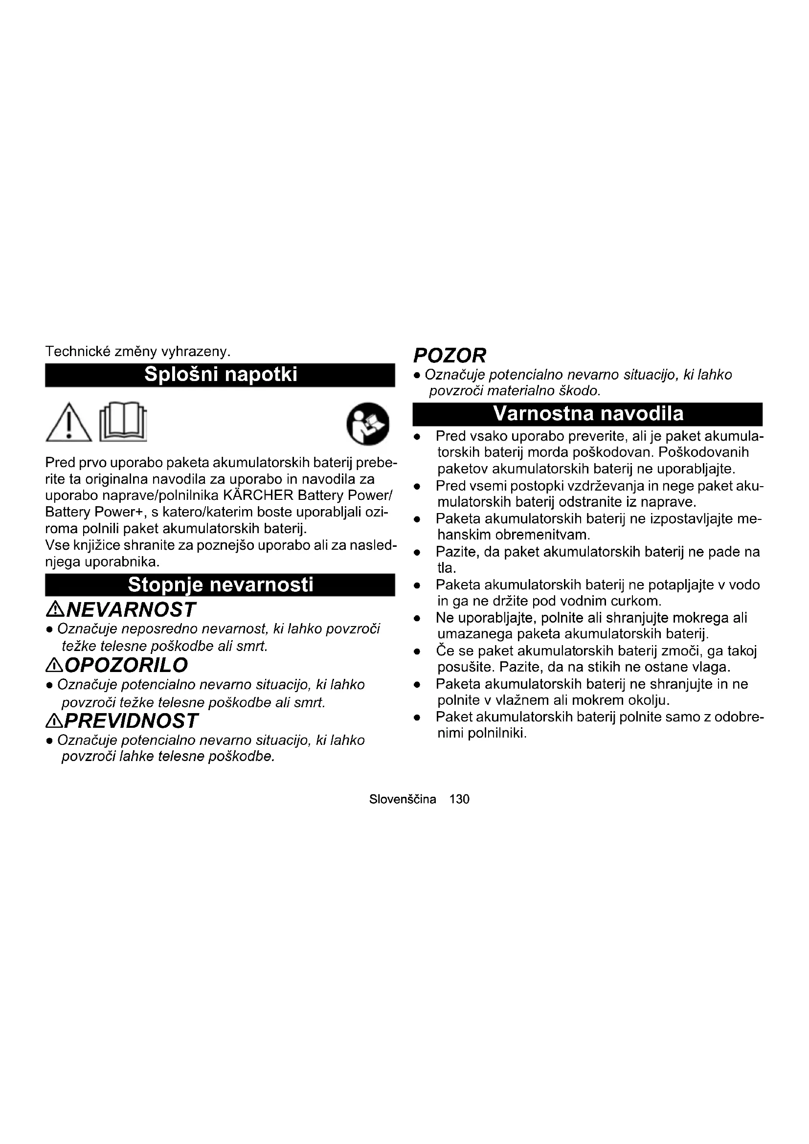 plnou úroveň. Technické údaje 18/25 18/50 36/25 36/50 Elektrické připojení Jmenovité napětí akumulátorového bloku V 18 18 36 36 Akumulátorová platforma Battery Power Battery Power Battery Power Battery Power Kompatibilní s platformou baterií Battery Power + Battery Power + Battery Power + Battery Power + Typ akupacku Li-ION Li-ION Li-ION Li-ION Jmenovitá kapacita (podle IEC/EN 61960) Ah 2,5 5,0 2,5 5,0 Jmenovitá energie Wh 45 90 90 180 Max. dobíjecí proud A 3,5 7,5 3,5 7,5 Rozměry a hmotnosti Hmotnost kg 0,5 0,8 0,9 1,5 Provozní teplota °C -20 - 40 -20 - 40 -20 - 40 -20 - 40 Teplota dobíjení °C 4 - 40 4 - 40 4 - 40 4 - 40 Teplota skladování °C -20 - 60 -20 - 60 -20 - 60 -20 - 60 Délka x šířka x výška mm 133 x 88 x 50 133 x 88 x 72 133 x 88 x 72 133 x 88 x 117,5Slovenščina 130 Technické změny vyhrazeny. Splošni napotki Pred prvo uporabo paketa akumulatorskih baterij prebe- rite ta originalna navodila za uporabo in navodila za uporabo naprave/polnilnika KÄRCHER Battery Power/ Battery Power+, s katero/katerim boste uporabljali ozi- roma polnili paket akumulatorskih baterij. Vse knjižice shranite za poznejšo uporabo ali za nasled- njega uporabnika. Stopnje nevarnosti NEVARNOST ● Označuje neposredno nevarnost, ki lahko povzroči težke telesne poškodbe ali smrt. 몇 OPOZORILO ● Označuje potencialno nevarno situacijo, ki lahko povzroči težke telesne poškodbe ali smrt. 몇 PREVIDNOST ● Označuje potencialno nevarno situacijo, ki lahko povzroči lahke telesne poškodbe. POZOR ● Označuje potencialno nevarno situacijo, ki lahko povzroči materialno škodo. Varnostna navodila ● Pred vsako uporabo preverite, ali je paket akumula- torskih baterij morda poškodovan. Poškodovanih paketov akumulatorskih baterij ne uporabljajte. ● Pred vsemi postopki vzdrževanja in nege paket aku- mulatorskih baterij odstranite iz naprave. ● Paketa akumulatorskih baterij ne izpostavljajte me- hanskim obremenitvam. ● Pazite, da paket akumulatorskih baterij ne pade na tla. ● Paketa akumulatorskih baterij ne potapljajte v vodo in ga ne držite pod vodnim curkom. ● Ne uporabljajte, polnite ali shranjujte mokrega ali umazanega paketa akumulatorskih baterij. ●Če se paket akumulatorskih baterij zmoči, ga takoj posušite. Pazite, da na stikih ne ostane vlaga. ● Paketa akumulatorskih baterij ne shranjujte in ne polnite v vlažnem ali mokrem okolju. ● Paket akumulatorskih baterij polnite samo z odobre- nimi polnilniki.131 Slovenščina ● Paketa akumulatorskih baterij ne polnite brez nad- zora. Med postopkom polnjenja redno preverjajte stanje paketa akumulatorskih baterij in polnilnika. ●Če med polnjenjem opazite napako, nenavaden vonj ali sproščanje vročine, polnilnik odklopite iz omrežja, paket akumulatorskih baterij pa iz polnilni- ka. Paket akumulatorskih baterij in polnilnik takoj odstranite in upoštevajte veljavne predpise o tran- sportu in odstranjevanju. ● Paketa akumulatorskih baterij ne uporabljajte, polni- te ali shranjujte v eksplozivnem okolju ali v bližini gorljivih predmetov. ● Paketov akumulatorskih baterij ne vrzite v ogenj. ● Paket akumulatorskih baterij zaščitite pred vročino, ostrimi robovi, oljem, topili, čistili in premikajočimi se deli naprave. ● Nevarnost kratkega stika. Stike paketa akumulator- skih baterij zaščitite pred kovinskimi deli in ga ne shranjujte skupaj s kovinskimi deli. ● Paketa akumulatorskih baterij ne odpirajte. Popravi- la naj izvajajo samo strokovnjaki. ● Ne dotikajte se tekočine, ki izteka iz okvarjenih aku- mulatorskih baterij. Tekočino ob stiku nemudoma sperite z vodo. Ob stiku z očmi dodatno poiščite zdravniško pomoč. ● Paket akumulatorskih baterij po koncu njegove ži- vljenjske dobe odstranite v skladu z veljavnimi pred- pisi. Varnostna navodila za transport Litij-ionska akumulatorska baterija je skladna z zahteva- mi za prevoz nevarnih snovi. Nepoškodovan in delujoč paket akumulatorskih baterij lahko uporabnik brez dodatnih zahtev prevaža po javnih prometnih poteh. Kadar izdelek pošiljajo tretje osebe (transportna podje- tja), je treba upoštevati posebne zahteve glede pakira- nja in označevanja. Paket akumulatorskih baterij pošiljajte samo, če je ohiš- je nepoškodovano. Izpostavljene stike prelepite. Paket akumulatorskih baterij dobro zapakirajte. Paket akumulatorskih baterij se ne sme premikati v embalaži. NEVARNOST ● Poškodovanega ali nedelujočega paketa akumulator- skih baterij ni dovoljeno pošiljati in ga je treba ustre- zno odstraniti na kraju samem v skladu z veljavnimi predpisi. Upoštevajte nacionalne predpise.Slovenščina 132 Namenska uporaba 몇 PREVIDNOST Nevarnost eksplozije! Telesne poškodbe in materialna škoda zaradi eksplozije paketa akumulatorskih baterij. Polnite, uporabljajte in shranjujte samo nepoškodovane in popolnoma delujoče pakete akumulatorskih baterij. Predelave ali spremembe, ki jih ni odobril proizvajalec, so prepovedane. Vsaka druga uporaba je nedovoljena. Za nevarnosti, ki nastanejo zaradi nedovoljene uporabe, odgovarja upo- rabnik. Paket akumulatorskih baterij polnite in uporabljajte sa- mo z napravami sistema KÄRCHER 18 V/36 V Battery Power/Battery Power+. POZOR Paket akumulatorskih baterij lahko uporabljate samo z napravami iste napetosti (18 V ali 36 V)! Paketa akumu- latorskih baterij ne uporabljajte ali polnite z napravami z drugačno napetostjo. Pred uporabo preverite, ali se ujema napetost (18 V/36