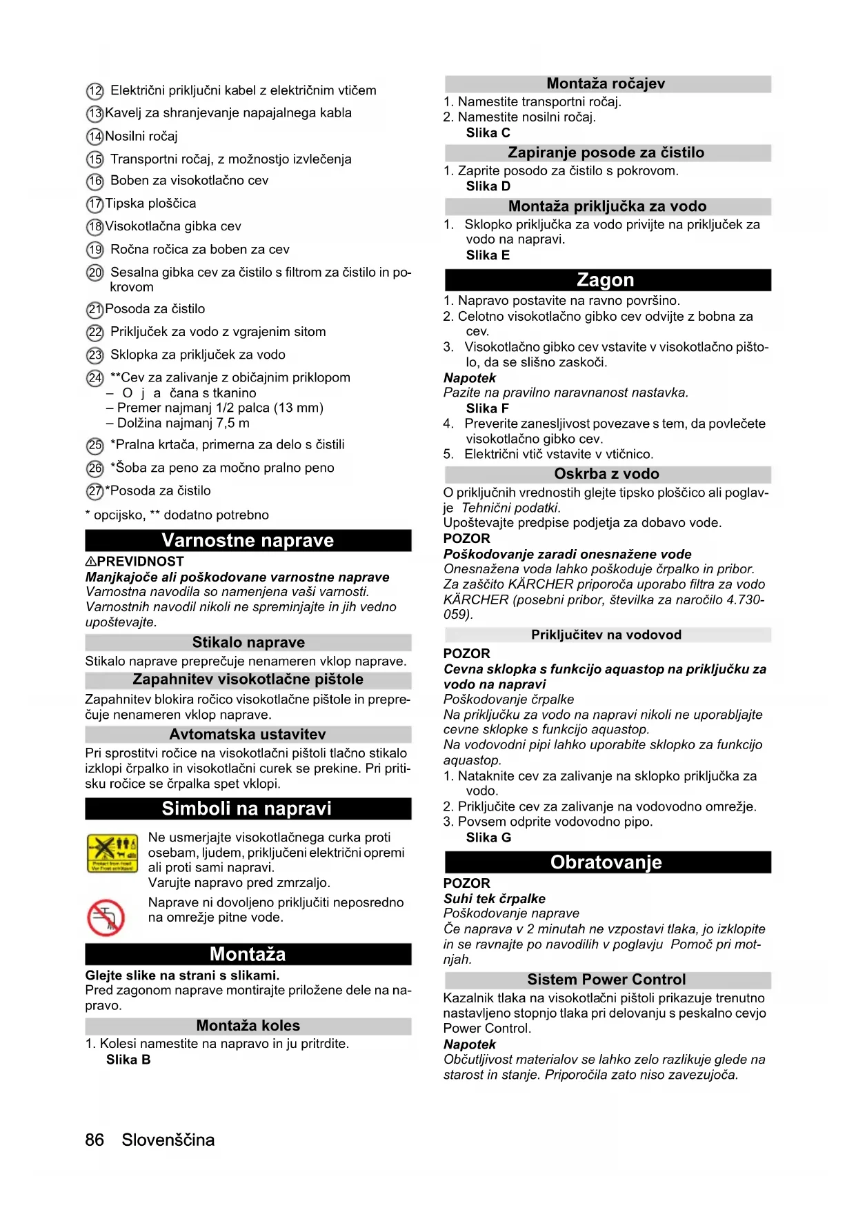 sta blagovni znamki ali regi- strirani blagovni znamki družbe Apple Inc. Zaščita okolja Pakirni material je mogoče reciklirati. Embalažo odstranite na okolju varen način. Električne in elektronske naprave vsebujejo dra- gocene materiale z možnostjo recikliranja, pogos- to pa tudi sestavne dele, kot so baterije, akumulatorske baterije ali olja, ki lahko pri napač- ni uporabi ali napačnem odstranjevanju škodujejo zdravju ljudi in okolju. Navedeni sestavni deli so kljub te- mu potrebni za pravilno delovanje naprave. Naprave, označene s tem simbolom, ne smete odvreči med go- spodinjske odpadke. Čistilna dela, pri katerih nastaja odpadna voda z vsebnostjo olja, npr. pri čiščenju motorjev ali podvo- zij, je dovoljeno opravljati samo na mestih za pranje, ki so opremljena z izločevalnikom olja. Delo s čistili je dovoljeno izvajati samo na delovnih površinah, ki so neprepustne za tekočine in imajo priključek na kanalizacijo za umazano vodo. Ne dovoli- te, da čistila prodrejo v vodo ali zemljo. Napotki o sestavinah (REACH) Aktualne informacije najdete na spletnem naslovu: www.kaercher.de/REACH Namenska uporaba Visokotlačni čistilnik uporabljajte izključno v zasebnem gospodinjstvu. Visokotlačni čistilnik je namenjen za čiščenje strojev, vozil, zgradb, orodja, fasad, teras, vrtnih naprav itd. z vi- sokotlačnim curkom. Pribor in nadomestni deli Uporabljajte samo originalni pribor in originalne nado- mestne dele, ki zagotavljajo varno in nemoteno delova- nje naprave. Informacije o priboru in nadomestnih delih najdete na spletnem naslovu www.kaercher.com. Obseg dobave Obseg dobave je upodobljen na embalaži. Pri odstra- njevanju embalaže preverite, ali je vsebina popolna. Če manjka pribor ali če so med transportom nastale po- škodbe, obvestite prodajalca. Opis naprave V teh navodilih za uporabo je opisana vsa možna opre- ma. Odvisno od modela se obsegi dobave razlikujejo (glejte pakiranje). Slike si oglejte na strani s slikami. Slika A 1 Transportno kolo 2 Mesto za shranjevanje brizgalnih cevi 3 Mesto za shranjevanje visokotlačne pištole 4 Peskalna cev cev Power Control za rezkar blata za trdovratno umazanijo, raven tlaka: HARD 5 Peskalna cev Power Control Vario Power za najpo- membnejša čistilna opravila, ravni tlaka: HARD /