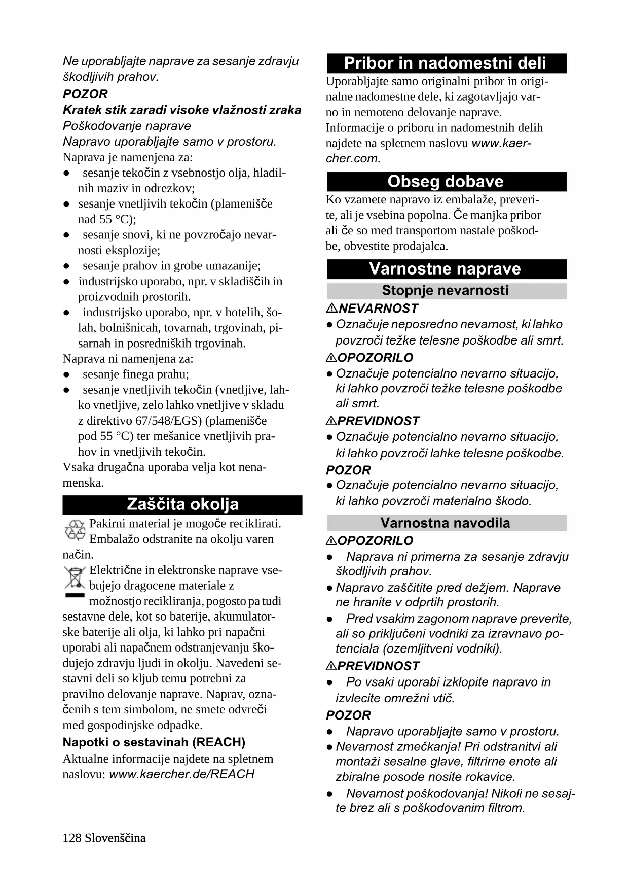 - Izjava EU o skladnosti 28 Slovenščina Ne uporabljajte naprave za sesanje zdravju škodljivih prahov. POZOR Kratek stik zaradi visoke vlažnosti zraka Poškodovanje naprave Napravo uporabljajte samo v prostoru. Naprava je namenjena za: ● sesanje tekočin z vsebnostjo olja, hladil- nih maziv in odrezkov; ● sesanje vnetljivih tekočin (plamenišče nad 55 °C); ● sesanje snovi, ki ne povzročajo nevar- nosti eksplozije; ● sesanje prahov in grobe umazanije; ● industrijsko uporabo, npr. v skladiščih in proizvodnih prostorih. ● industrijsko uporabo, npr. v hotelih, šo- lah, bolnišnicah, tovarnah, trgovinah, pi- sarnah in posredniških trgovinah. Naprava ni namenjena za: ● sesanje finega prahu; ● sesanje vnetljivih tekočin (vnetljive, lah- ko vnetljive, zelo lahko vnetljive v skladu z direktivo 67/548/EGS) (plamenišče pod 55 °C) ter mešanice vnetljivih pra- hov in vnetljivih tekočin. Vsaka drugačna uporaba velja kot nena- menska. Zaščita okolja Pakirni material je mogoče reciklirati. Embalažo odstranite na okolju varen način. Električne in elektronske naprave vse- bujejo dragocene materiale z možnostjo recikliranja, pogosto pa tudi sestavne dele, kot so baterije, akumulator- ske baterije ali olja, ki lahko pri napačni uporabi ali napačnem odstranjevanju ško- dujejo zdravju ljudi in okolju. Navedeni se- stavni deli so kljub temu potrebni za pravilno delovanje naprave. Naprav, ozna- čenih s tem simbolom, ne smete odvreči med gospodinjske odpadke. Napotki o sestavinah (REACH) Aktualne informacije najdete na spletnem naslovu: www.kaercher.de/REACH Pribor in nadomestni deli Uporabljajte samo originalni pribor in origi- nalne nadomestne dele, ki zagotavljajo var- no in nemoteno delovanje naprave. Informacije o priboru in nadomestnih delih najdete na spletnem naslovu www.kaer- cher.com. Obseg dobave Ko vzamete napravo iz embalaže, preveri- te, ali je vsebina popolna. Če manjka pribor ali če so med transportom nastale poškod- be, obvestite prodajalca. Varnostne naprave Stopnje nevarnosti NEVARNOST ● Označuje neposredno nevarnost, ki lahko povzroči težke telesne poškodbe ali smrt. 몇 OPOZORILO ● Označuje potencialno nevarno situacijo, ki lahko povzroči težke telesne poškodbe ali smrt. 몇 PREVIDNOST ● Označuje potencialno nevarno situacijo, ki lahko povzroči lahke telesne poškodbe. POZOR ● Označuje potencialno nevarno situacijo, ki lahko povzroči materialno škodo. Varnostna navodila 몇 OPOZORILO ● Naprava ni primerna za sesanje zdravju škodljivih prahov. ● Napravo zaščitite pred dežjem. Naprave ne hranite v odprtih prostorih. ● Pred vsakim zagonom naprave preverite, ali so priključeni vodniki za izravnavo po- tenciala (ozemljitveni vodniki). 몇 PREVIDNOST ● Po vsaki uporabi izklopite napravo in izvlecite omrežni vtič. POZOR ● Napravo uporabljajte samo v prostoru. ● Nevarnost zmečkanja! Pri odstranitvi ali montaži sesalne glave, filtrirne enote ali zbiralne posode nosite rokavice. ● Nevarnost poškodovanja! Nikoli ne sesaj- te brez ali s poškodovanim filtrom.Slovenščina 129 ● Pri upravljanju naprave nosite varnostne rokavice. ● Napravo premikajte samo s hitrostjo hoje in na strmih poteh po možnosti v dvoje. ● Pri menjavanju delov pribora pazite, da ne izhaja prah. Naprave z nagibnim prevoznim ogrodjem (Tc) POZOR Nevarnost telesnih poškodb Nevarnost zmečkanin zaradi nagiba poso- de za tekočino Po nagibu pustite, da se zapah zaskoči. Ravnanje v sili NEVARNOST Pri sesanju gorljivih materialov, kratkem stiku ali drugih električnih napakah obstaja nevarnost telesnih poškodb in materialne škode. Nevarnost vdihavanja zdravju škodljivih pli- nov, nevarnost električnega udara, nevar- nost zaradi opeklin. V sili izklopite napravo in izvlecite omrežni vtič. Električni priključek Napravo je dovoljeno priključiti samo na električni priključek, ki ga izdela elektroin- štalater v skladu z IEC 60364. O priključnih vrednostih glejte Tehnični podatki in tipsko nalepko. Uporaba podaljševalnega kabla ni dovoljena. NEVARNOST Nevarnost električnega udara Smrtna nevarnost Ne poškodujte električnih priključnih kablov npr. s povoženjem, zmečkanjem ali pretr- ganjem. Kable zaščitite pred vročino, oljem in ostri- mi robovi. Pred vsako uporabo preglejte omrežni na- pajalni kabel naprave. Ne zaženite napra- ve, če je kabel poškodovan. Poškodovan kabel naj zamenja strokovnjak za elektro- tehniko. Simboli na napravi Oznaka za najvišjo dopustno raven te- kočine Glejte poglavje Preverjanje prikazovalnika polnitve. POZOR Nevarnost poškodovanja naprave Iztekanje vode zaradi prekoračitve najvišje dovoljene ravni tekočine. Izpraznite napravo, preden je dosežena najvišja dovoljena raven tekočine. Opis naprave Glejte sliko na straneh s slikami Slika A 1 Krmilni kolesci s parkirno zavoro 2 Označitev najvišje ravni polnitve 3 Izpustna gibka cev 4 Posoda za tekočino 5 Potisno streme 6 Prestrezna pločevina 7 Mala prestrezna pločevina 8 Filter 9 Sesalna glava 10 Priključek sesalne cevi 11 Stikalo naprave 12 Zapah sesalne glave 13 Omrežni kabel 14 Ušesca za žerjav na posodi za tekočino 15 Nagibno prevozno ogrodje 16 Držalo za pribor 17 Ročica za sprostitev Zagon Glejte sliko na straneh s slikami p. 1331