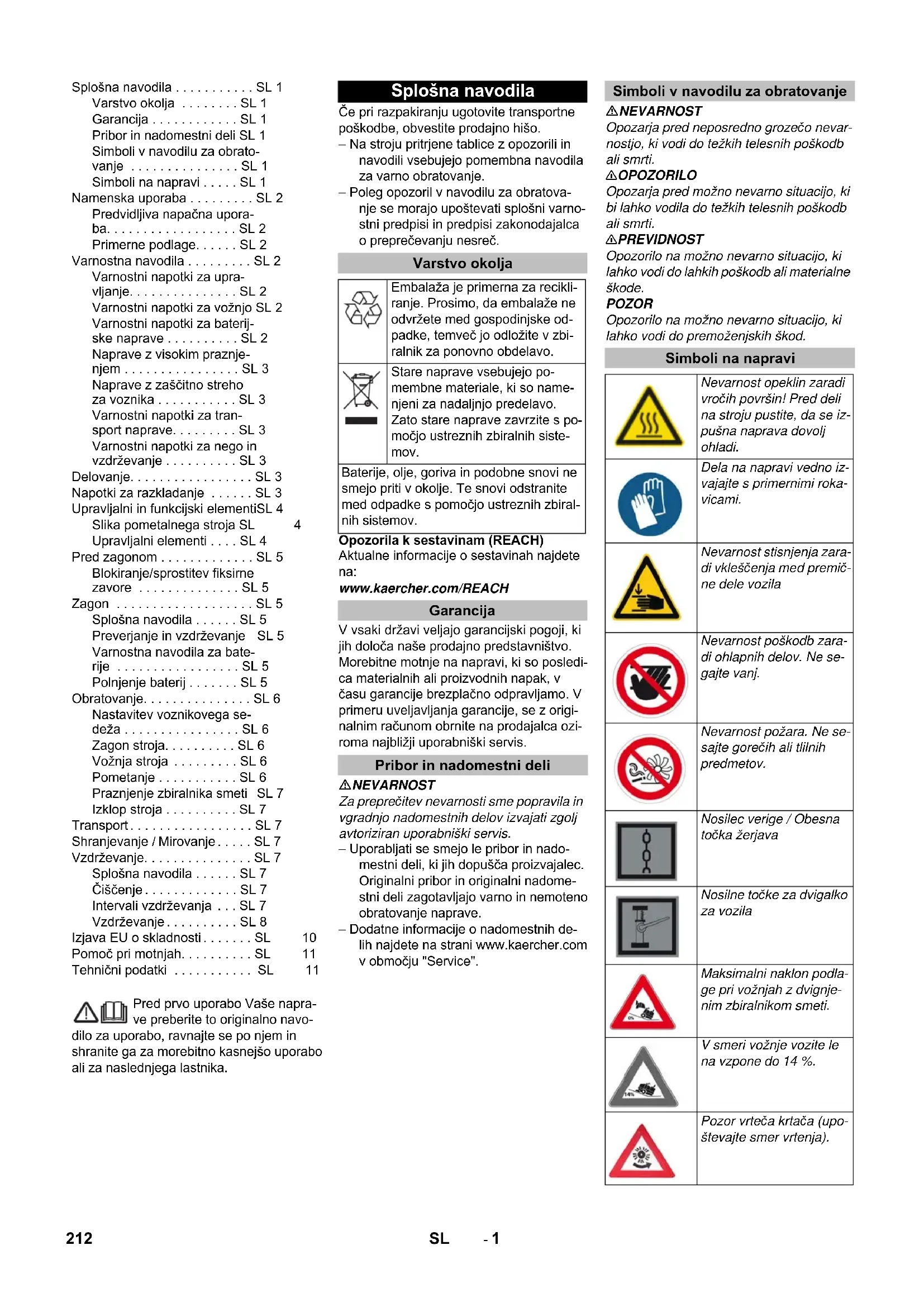 0,1 0,1 Rozměry a hmotnost Délka x Šířka x Výška mm 1847 x 1065 x 1388 1847 x 1065 x 1388 Poloměr otáčení vpravo mm 2470 2470 Poloměr otáčení vlevo mm 2470 2470 Prázdný (bez/s baterií) kg 560/860 560/860 Povolená celková hmotnost kg 1224 1224 Přípustné zatížení přední nápravy kg 734 734 Přípustné zatížení zadní nápravy kg 490 490 Technické změny vyhrazeny. 211CS- 1 Pred prvo uporabo Vaše napra- ve preberite to originalno navo- dilo za uporabo, ravnajte se po njem in shranite ga za morebitno kasnejšo uporabo ali za naslednjega lastnika. Če pri razpakiranju ugotovite transportne poškodbe, obvestite prodajno hišo. – Na stroju pritrjene tablice z opozorili in navodili vsebujejo pomembna navodila za varno obratovanje. – Poleg opozoril v navodilu za obratova- nje se morajo upoštevati splošni varno- stni predpisi in predpisi zakonodajalca o preprečevanju nesreč. Opozorila k sestavinam (REACH) Aktualne informacije o sestavinah najdete na: www.kaercher.com/REACH V vsaki državi veljajo garancijski pogoji, ki jih določa naše prodajno predstavništvo. Morebitne motnje na napravi, ki so posledi- ca materialnih ali proizvodnih napak, v času garancije brezplačno odpravljamo. V primeru uveljavljanja garancije, se z origi- nalnim računom obrnite na prodajalca ozi- roma najbližji uporabniški servis. NEVARNOST Za preprečitev nevarnosti sme popravila in vgradnjo nadomestnih delov izvajati zgolj avtoriziran uporabniški servis. – Uporabljati se smejo le pribor in nado- mestni deli, ki jih dopušča proizvajalec. Originalni pribor in originalni nadome- stni deli zagotavljajo varno in nemoteno obratovanje naprave. – Dodatne informacije o nadomestnih de- lih najdete na strani www.kaercher.com v območju "Service". NEVARNOST Opozarja pred neposredno grozečo nevar- nostjo, ki vodi do težkih telesnih poškodb ali smrti. 몇 OPOZORILO Opozarja pred možno nevarno situacijo, ki bi lahko vodila do težkih telesnih poškodb ali smrti. 몇 PREVIDNOST Opozorilo na možno nevarno situacijo, ki lahko vodi do lahkih poškodb ali materialne škode. POZOR Opozorilo na možno nevarno situacijo, ki lahko vodi do premoženjskih škod. Splošna navodila . . . . . . . . . . . SL 1 Varstvo okolja . . . . . . . . SL 1 Garancija . . . . . . . . . . . . SL 1 Pribor in nadomestni deli SL 1 Simboli v navodilu za obrato- vanje . . . . . . . . . . . . . . . SL 1 Simboli na napravi . . . . . SL 1 Namenska uporaba . . . . . . . . . SL 2 Predvidljiva napačna upora- ba. . . . . . . . . . . . . . . . . . SL 2 Primerne podlage. . . . . . SL 2 Varnostna navodila . . . . . . . . . SL 2 Varnostni napotki za upra- vljanje. . . . . . . . . . . . . . . SL 2 Varnostni napotki za vožnjo SL 2 Varnostni napotki za baterij- ske naprave . . . . . . . . . . SL 2 Naprave z visokim praznje- njem . . . . . . . . . . . . . . . . SL 3 Naprave z zaščitno streho za voznika . . . . . . . . . . . SL 3 Varnostni napotki za tran- sport naprave. . . . . . . . . SL 3 Varnostni napotki za nego in vzdrževanje . . . . . . . . . . SL 3 Delovanje. . . . . . . . . . . . . . . . . SL 3 Napotki za razkladanje . . . . . . SL 3 Upravljalni in funkcijski elementiSL 4 Slika pometalnega stroja SL 4 Upravljalni elementi . . . . SL 4 Pred zagonom . . . . . . . . . . . . . SL 5 Blokiranje/sprostitev fiksirne zavore . . . . . . . . . . . . . . SL 5 Zagon . . . . . . . . . . . . . . . . . . . SL 5 Splošna navodila . . . . . . SL 5 Preverjanje in vzdrževanje SL 5 Varnostna navodila za bate- rije . . . . . . . . . . . . . . . . . SL 5 Polnjenje baterij . . . . . . . SL 5 Obratovanje. . . . . . . . . . . . . . . SL 6 Nastavitev voznikovega se- deža . . . . . . . . . . . . . . . . SL 6 Zagon stroja. . . . . . . . . . SL 6 Vožnja stroja . . . . . . . . . SL 6 Pometanje . . . . . . . . . . . SL 6 Praznjenje zbiralnika smeti SL 7 Izklop stroja . . . . . . . . . . SL 7 Transport . . . . . . . . . . . . . . . . . SL 7 Shranjevanje / Mirovanje. . . . . SL 7 Vzdrževanje. . . . . . . . . . . . . . . SL 7 Splošna navodila . . . . . . SL 7 Čiščenje . . . . . . . . . . . . . SL 7 Intervali vzdrževanja . . . SL 7 Vzdrževanje . . . . . . . . . . SL 8 Izjava EU o skladnosti . . . . . . . SL 10 Pomoč pri motnjah. . . . . . . . . . SL 11 Tehnični podatki . . . . . . . . . . . SL 11 Splošna navodila Varstvo okolja Embalaža je primerna za recikli- ranje. Prosimo, da embalaže ne odvržete med gospodinjske od- padke, temveč jo odložite v zbi- ralnik za ponovno obdelavo. Stare naprave vsebujejo po- membne materiale, ki so name- njeni za nadaljnjo predelavo. Zato stare naprave zavrzite s po- močjo ustreznih zbiralnih siste- mov. Baterije, olje, goriva in podobne snovi ne smejo priti v okolje. Te snovi odstranite med odpadke s pomočjo ustreznih zbiral- nih sistemov. Garancija Pribor in nadomestni deli Simboli v navodilu za obratovanje Simboli na napravi Nevarnost opeklin zaradi vročih površin! Pred deli na stroju pustite, da se iz- pušna naprava dovolj ohladi. Dela na napravi vedno iz- vajajte s primernimi roka- vicami. Nevarnost stisnjenja zara- di vkleščenja med premič- ne dele vozila Nevarnost poškodb zara- di ohlapnih delov. Ne se- gajte vanj. Nevarnost požara. Ne se- sajte gorečih ali tlilnih predmetov. Nosilec verige / Obesna točka žerjava Nosilne točke za dvigalko za vozila Maksimalni naklon podla- ge pri vožnjah z dvignje- nim zbiralnikom smeti. V smeri vožnje vozite le na vzpone do 14 %. Pozor vrteča krtača (upo- števajte smer vrtenja). 212 SL- 2 Pometalni stroj je predviden za čiščenje tal- nih površin za komercialno uporabo in za npr. naslednja področja uporabe: parkirišča proizvodni objekti logistična področja hotel trgovina na drobno skladiščna področja pločniki – Ta stroj za pometanje je namenjen po- metanju umazanih površin v notranjem in zunanjem območju. – Pred uporabo se mora preizkusiti neo- porečno stanje stroja z delovnimi pripo- močki in obratovalna varnost. Če s