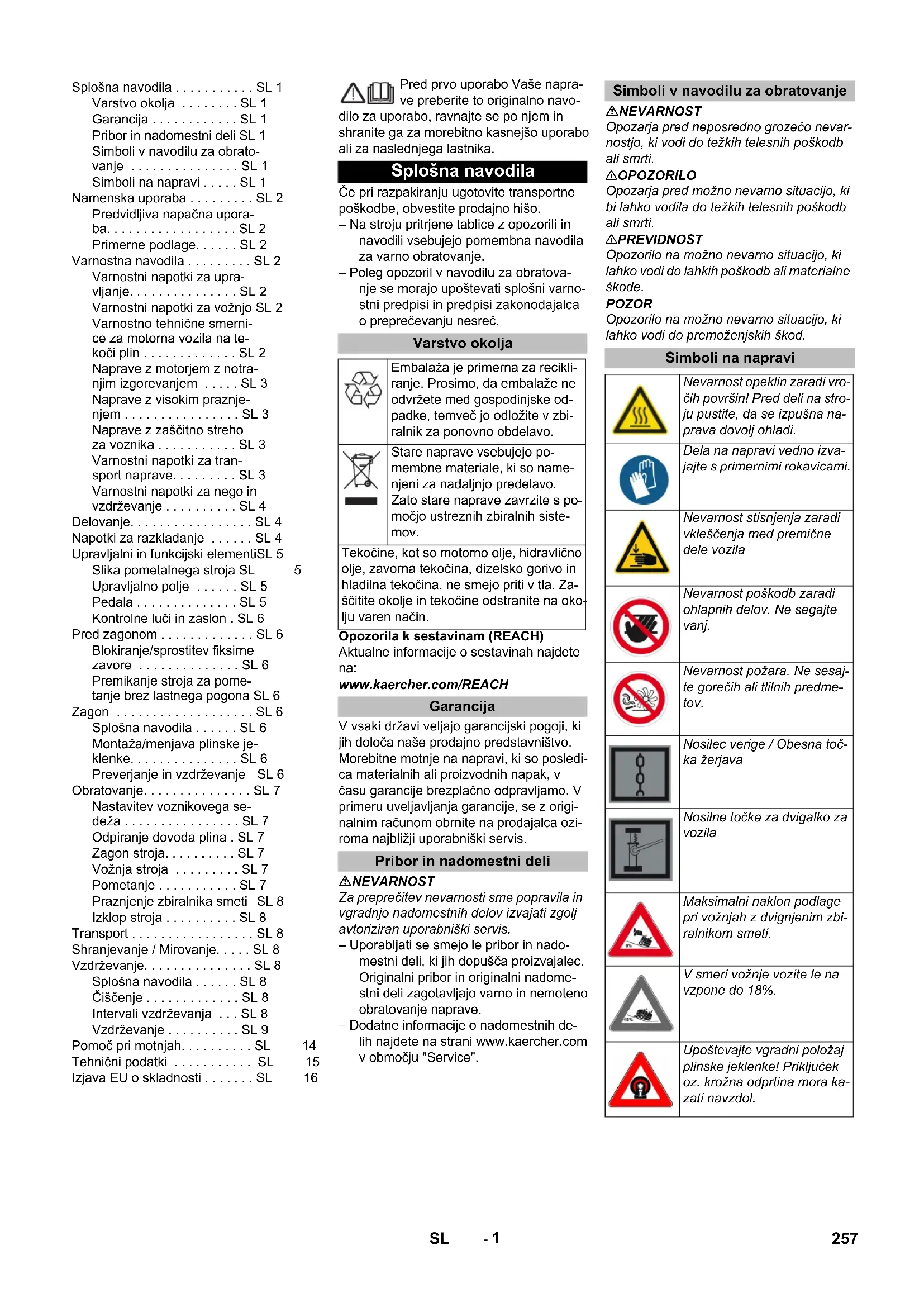 Chairman of the Board of Management Director Regulatory Affairs & Certification 256 CS- 1 Pred prvo uporabo Vaše napra- ve preberite to originalno navo- dilo za uporabo, ravnajte se po njem in shranite ga za morebitno kasnejšo uporabo ali za naslednjega lastnika. Če pri razpakiranju ugotovite transportne poškodbe, obvestite prodajno hišo. – Na stroju pritrjene tablice z opozorili in navodili vsebujejo pomembna navodila za varno obratovanje. – Poleg opozoril v navodilu za obratova- nje se morajo upoštevati splošni varno- stni predpisi in predpisi zakonodajalca o preprečevanju nesreč. Opozorila k sestavinam (REACH) Aktualne informacije o sestavinah najdete na: www.kaercher.com/REACH V vsaki državi veljajo garancijski pogoji, ki jih določa naše prodajno predstavništvo. Morebitne motnje na napravi, ki so posledi- ca materialnih ali proizvodnih napak, v času garancije brezplačno odpravljamo. V primeru uveljavljanja garancije, se z origi- nalnim računom obrnite na prodajalca ozi- roma najbližji uporabniški servis. NEVARNOST Za preprečitev nevarnosti sme popravila in vgradnjo nadomestnih delov izvajati zgolj avtoriziran uporabniški servis. – Uporabljati se smejo le pribor in nado- mestni deli, ki jih dopušča proizvajalec. Originalni pribor in originalni nadome- stni deli zagotavljajo varno in nemoteno obratovanje naprave. – Dodatne informacije o nadomestnih de- lih najdete na strani www.kaercher.com v območju "Service". NEVARNOST Opozarja pred neposredno grozečo nevar- nostjo, ki vodi do težkih telesnih poškodb ali smrti. 몇 OPOZORILO Opozarja pred možno nevarno situacijo, ki bi lahko vodila do težkih telesnih poškodb ali smrti. 몇 PREVIDNOST Opozorilo na možno nevarno situacijo, ki lahko vodi do lahkih poškodb ali materialne škode. POZOR Opozorilo na možno nevarno situacijo, ki lahko vodi do premoženjskih škod. Splošna navodila . . . . . . . . . . . SL 1 Varstvo okolja . . . . . . . . SL 1 Garancija . . . . . . . . . . . . SL 1 Pribor in nadomestni deli SL 1 Simboli v navodilu za obrato- vanje . . . . . . . . . . . . . . . SL 1 Simboli na napravi . . . . . SL 1 Namenska uporaba . . . . . . . . . SL 2 Predvidljiva napačna upora- ba. . . . . . . . . . . . . . . . . . SL 2 Primerne podlage. . . . . . SL 2 Varnostna navodila . . . . . . . . . SL 2 Varnostni napotki za upra- vljanje. . . . . . . . . . . . . . . SL 2 Varnostni napotki za vožnjo SL 2 Varnostno tehnične smerni- ce za motorna vozila na te- koči plin . . . . . . . . . . . . . SL 2 Naprave z motorjem z notra- njim izgorevanjem . . . . . SL 3 Naprave z visokim praznje- njem . . . . . . . . . . . . . . . . SL 3 Naprave z zaščitno streho za voznika . . . . . . . . . . . SL 3 Varnostni napotki za tran- sport naprave. . . . . . . . . SL 3 Varnostni napotki za nego in vzdrževanje . . . . . . . . . . SL 4 Delovanje. . . . . . . . . . . . . . . . . SL 4 Napotki za razkladanje . . . . . . SL 4 Upravljalni in funkcijski elementiSL 5 Slika pometalnega stroja SL 5 Upravljalno polje . . . . . . SL 5 Pedala . . . . . . . . . . . . . . SL 5 Kontrolne luči in zaslon . SL 6 Pred zagonom . . . . . . . . . . . . . SL 6 Blokiranje/sprostitev fiksirne zavore . . . . . . . . . . . . . . SL 6 Premikanje stroja za pome- tanje brez lastnega pogona SL 6 Zagon . . . . . . . . . . . . . . . . . . . SL 6 Splošna navodila . . . . . . SL 6 Montaža/menjava plinske je- klenke. . . . . . . . . . . . . . . SL 6 Preverjanje in vzdrževanje SL 6 Obratovanje. . . . . . . . . . . . . . . SL 7 Nastavitev voznikovega se- deža . . . . . . . . . . . . . . . . SL 7 Odpiranje dovoda plina . SL 7 Zagon stroja. . . . . . . . . . SL 7 Vožnja stroja . . . . . . . . . SL 7 Pometanje . . . . . . . . . . . SL 7 Praznjenje zbiralnika smeti SL 8 Izklop stroja . . . . . . . . . . SL 8 Transport . . . . . . . . . . . . . . . . . SL 8 Shranjevanje / Mirovanje. . . . . SL 8 Vzdrževanje. . . . . . . . . . . . . . . SL 8 Splošna navodila . . . . . . SL 8 Čiščenje . . . . . . . . . . . . . SL 8 Intervali vzdrževanja . . . SL 8 Vzdrževanje . . . . . . . . . . SL 9 Pomoč pri motnjah. . . . . . . . . . SL 14 Tehnični podatki . . . . . . . . . . . SL 15 Izjava EU o skladnosti . . . . . . . SL 16 Splošna navodila Varstvo okolja Embalaža je primerna za recikli- ranje. Prosimo, da embalaže ne odvržete med gospodinjske od- padke, temveč jo odložite v zbi- ralnik za ponovno obdelavo. Stare naprave vsebujejo po- membne materiale, ki so name- njeni za nadaljnjo predelavo. Zato stare naprave zavrzite s po- močjo ustreznih zbiralnih siste- mov. Tekočine, kot so motorno olje, hidravlično olje, zavorna tekočina, dizelsko gorivo in hladilna tekočina, ne smejo priti v tla. Za- ščitite okolje in tekočine odstranite na oko- lju varen način. Garancija Pribor in nadomestni deli Simboli v navodilu za obratovanje Simboli na napravi Nevarnost opeklin zaradi vro- čih površin! Pred deli na stro- ju pustite, da se izpušna na- prava dovolj ohladi. Dela na napravi vedno izva- jajte s primernimi rokavicami. Nevarnost stisnjenja zaradi vkleščenja med premične dele vozila Nevarnost poškodb zaradi ohlapnih delov. Ne segajte vanj. Nevarnost požara. Ne sesaj- te gorečih ali tlilnih predme- tov. Nosilec verige / Obesna toč- ka žerjava Nosilne točke za dvigalko za vozila Maksimalni naklon podlage pri vožnjah z dvignjenim zbi- ralnikom smeti. V smeri vožnje vozite le na vzpone do 18%. Upoštevajte vgradni položaj plinske jeklenke! Priključek oz. krožna odprtina mora ka- zati navzdol. 257SL- 2 Ta pometalni stroj uporabljajte izključno v skladu s podatki v tem navodilu za obrato- vanje. – Ta stroj za pometanje je namenjen po- metanju umazanih površin v zunanjem območju. – Stroj ni dovoljen za javni cestni promet. – Vsaka uporaba izven teh okvirjev velja kot nenamenska. Proizvajalec ne odgo- varja za tako nastalo škodo; tveganje nosi izključno uporabnik. – (Plinski motor) Obratovanje naprave v zaprtih prostorih je dovoljeno sam