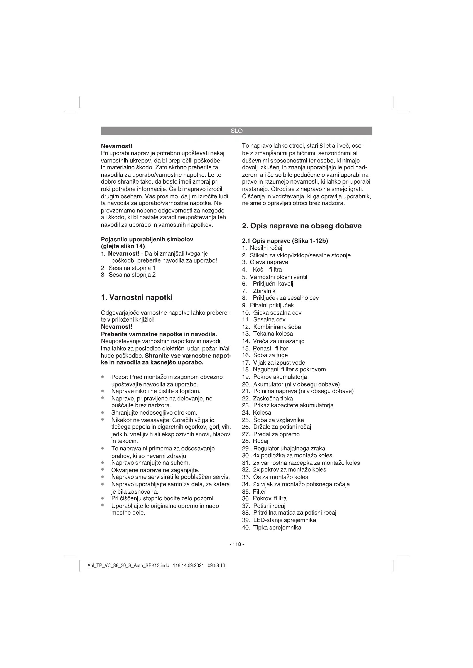in baterijski vložek naši službi za stranke. Za pravilno pošiljanje se obrnite na našo službo za stranke ali prodajno mesto, kjer ste napravo kupili. Pri pošiljanju ali odstranjevanju morate akumulatorje oz. akumulatorske naprave posamično zapakirati v plastične vrečke, da ne prihaja do kratkih stikov in požara! V interesu dolge življenjske dobe baterijskega vložka poskrbite za pravočasno polnjenje bate- rijskega vložka. To je potrebno v vsakem primeru, če opazite, da moč naprave peša. Baterijskega vložka nikoli ne izpraznite popolnoma. S tem poškodujete baterijski vložek! Napotek! Najboljše rezultate glede trajanja in sesalne moči dosežete vedno, če uporabljate akumulatorje z Anl_TP_VC_36_30_S_Auto_SPK13.indb 120 14.09.2021 09:58:13SLO