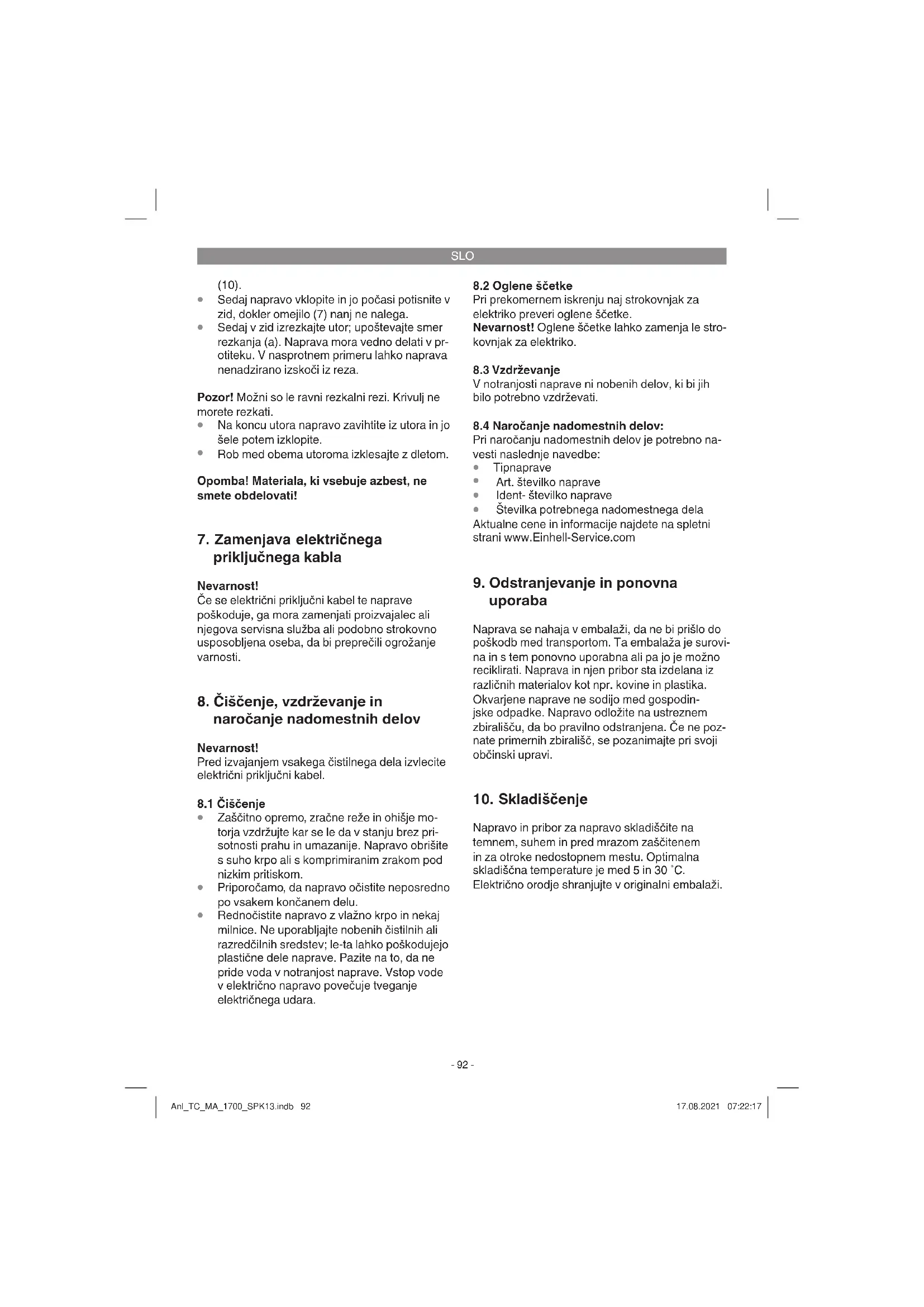Samo za dežele EU Električnega orodja ne mečite med gospodinjske odpadke! V skladu z evropsko smernico 2012/19/EG o starih električnih in elektronskih napravah in v skladu z iz- vajanjem nacionalne zakonodaje morate ločeno zbirati izrabljena električna orodja in jih predati v okoljs- ko varno ponovno predelavo. Reciklažna alternativa za poziv za vračanje: Lastnik električne naprave je alternativno zavezan, da namesto vračanja sodeluje pri pri strokovno ustreznem recikliranju v primeru predaje lastnine. Staro napravo se lahko v ta namen tudi prepusti na odvzemnem mestu, ki izvaja odstranjevanje v smislu nacionalne zakonodaje o odstranjevanju takšnih odpadkov. To se ne nanaša na starim napravam priložene dele pribora in opreme brez električnih kom- ponent. Ponatis ali kakršnokoli razmnoževanje dokumentacije in spremljajočih papirjev o proizvodu, tudi po izvlečkih, je dovoljeno samo z izrecnim soglasjem Einhell Germany AG. Pridržana pravica do tehničnih sprememb Anl_TC_MA_1700_SPK13.indb 93Anl_TC_MA_1700_SPK13.indb 93 17.08.2021 07:22:1717.08.2021 07:22:17SLO