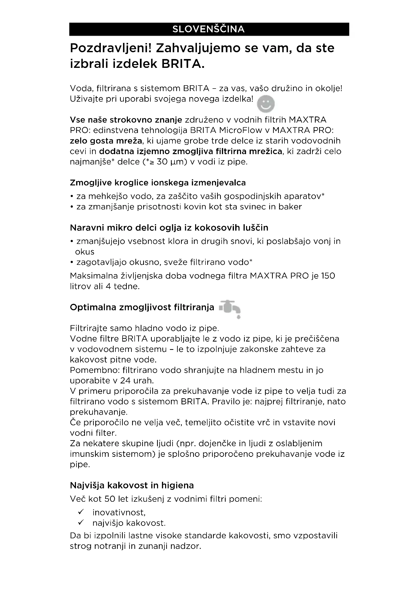 - zagotavljajo okusno, sveže filtrirano vodo* Maksimalna življenjska doba vodnega filtra MAXTRA PRO je 150 litrov ali 4 tedne. Optimalna zmogljivost filtriranja Filtrirajte samo hladno vodo iz pipe. Vodne filtre BRITA uporabljajte le z vodo iz pipe, ki je prečiščena v vodovodnem sistemu – le to izpolnjuje zakonske zahteve za kakovost pitne vode. Pomembno: filtrirano vodo shranjujte na hladnem mestu in jo uporabite v 24 urah. V primeru priporočila za prekuhavanje vode iz pipe to velja tudi za filtrirano vodo s sistemom BRITA. Pravilo je: najprej filtriranje, nato prekuhavanje. Če priporočilo ne velja več, temeljito očistite vrč in vstavite novi vodni filter. Za nekatere skupine ljudi (npr. dojenčke in ljudi z oslabljenim imunskim sistemom) je splošno priporočeno prekuhavanje vode iz pipe. Najvišja kakovost in higiena Več kot 50 let izkušenj z vodnimi filtri pomeni: 9 inovativnost, 9 najvišjo kakovost. Da bi izpolnili lastne visoke standarde kakovosti, smo vzpostavili strog notranji in zunanji nadzor.Vsak vodni filter MAXTRA PRO je med proizvodnjo obdelan z vročo vodno paro, za higienično neoporečnost, nato pa zapakiran v zaščitno folijo. (Opomba: vodni filter je lahko vlažen zaradi kondenzacije pri obdelavi z vodno paro). Material vodnega filtra MAXTRA PRO je za zagotavljanje neoporečnosti dodatno obdelan s srebrom. Minimalna količina srebra se lahko sprosti v vodo. To je v skladu s priporočili Svetovne zdravstvene organizacije (WHO). BRITA priporoča redno menjavo vodnega filtra. Prosimo upoštevajte priporočene postopke čiščenja filtrirnega sistema in nasvete glede priprave filtrirnega vložka (poglavja 1−7). Vrč je treba redno čistiti. Opomba: Če vrč dlje časa ne bo v uporabi, odstranite vodni filter, izpraznite vrč in vodni filter ohlapno namestite na prazen lijak. Preberite 7. poglavje »Menjava vodnega filtra MAXTRA PRO«. Delovanje – zelo enostavno