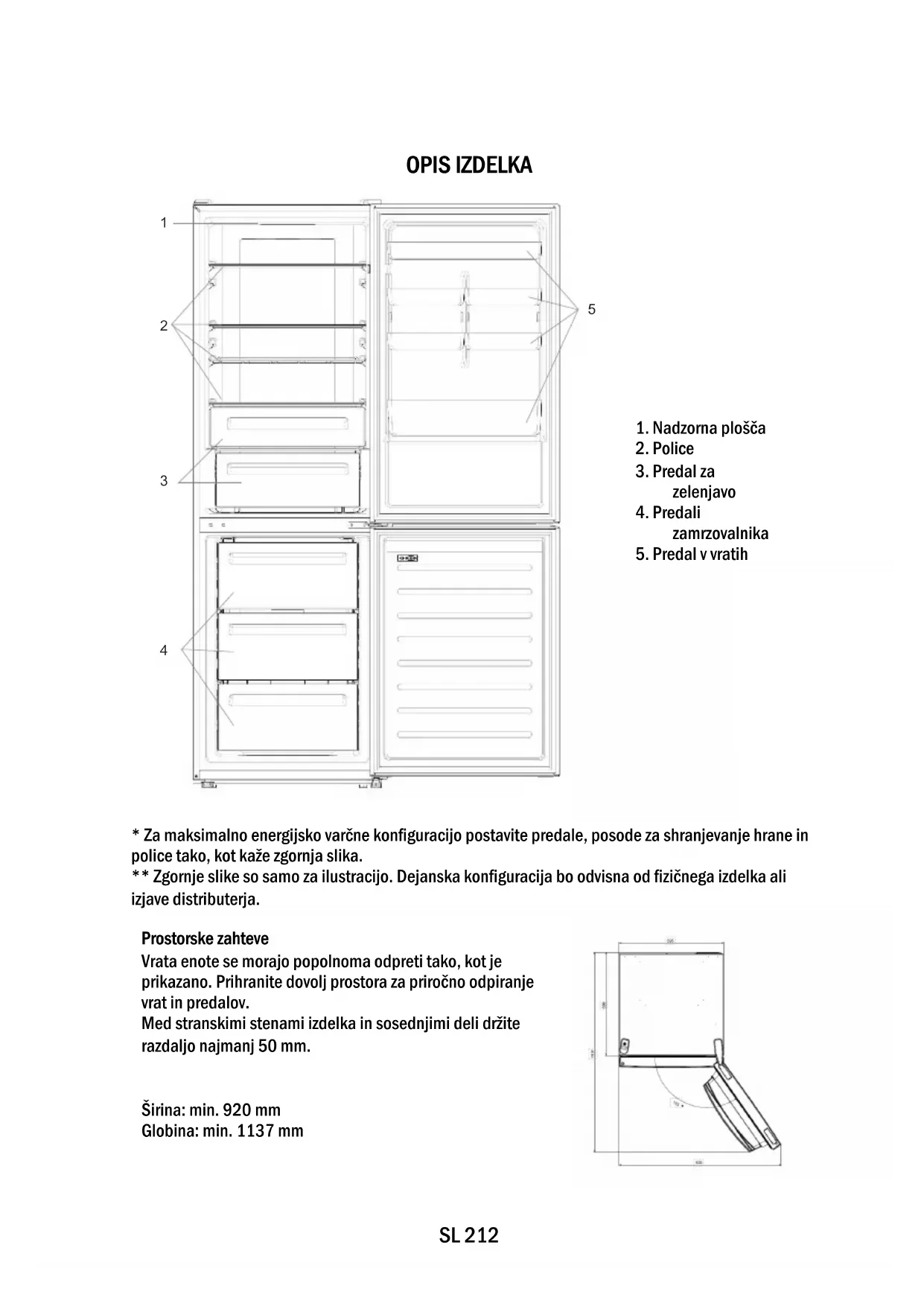 - Za maksimalno energijsko varčne konfiguracijo postavite predale, posode za shranjevanje hrane in police tako, kot kaže zgornja slika. ** Zgornje slike so samo za ilustracijo. Dejanska konfiguracija bo odvisna od fizičnega izdelka ali izjave distributerja.