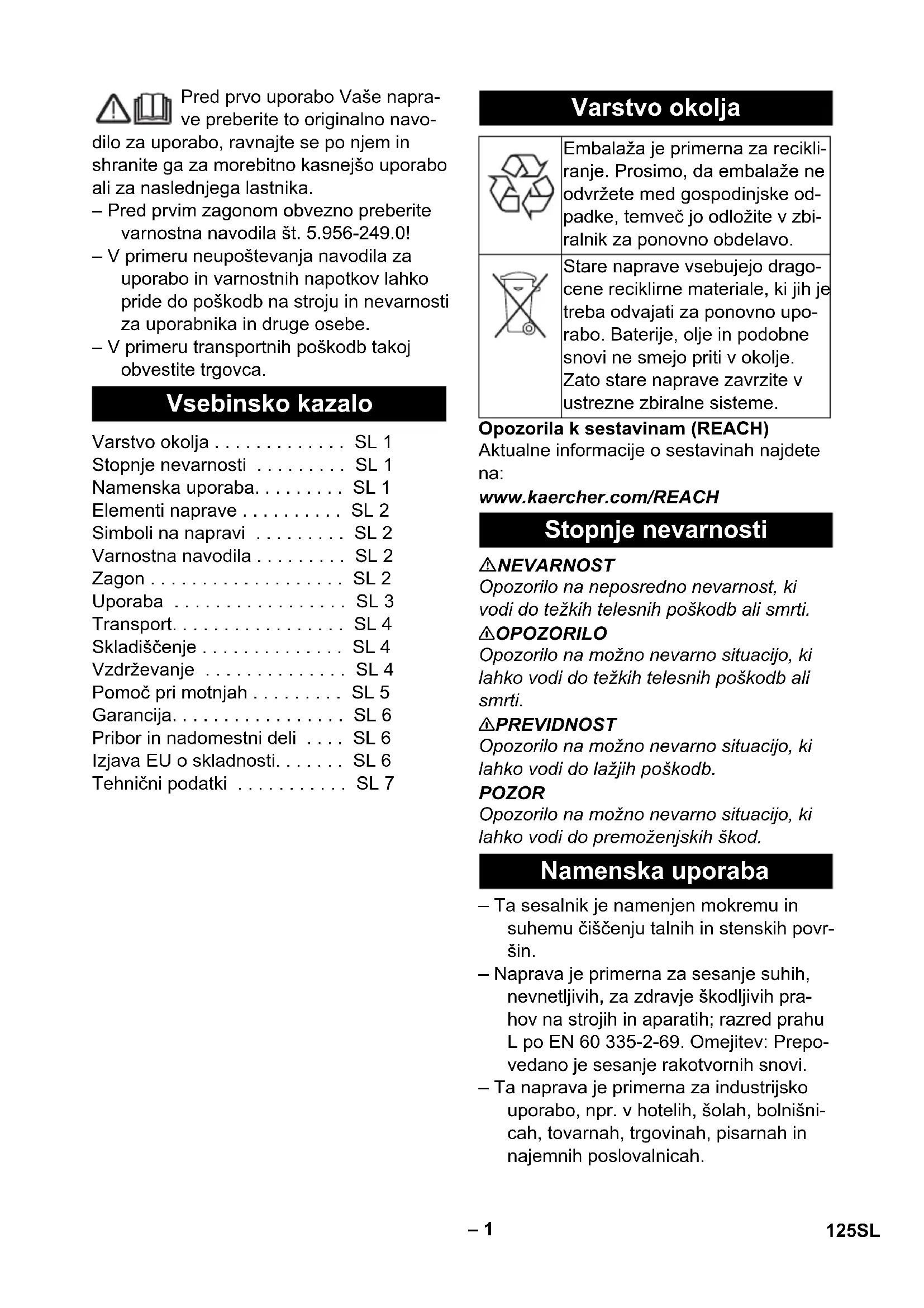 Ap Te L Č. dílu Délka kabelu EU 6.650-332.0 6 m 124 CS– 1 Pred prvo uporabo Vaše napra- ve preberite to originalno navo- dilo za uporabo, ravnajte se po njem in shranite ga za morebitno kasnejšo uporabo ali za naslednjega lastnika. – Pred prvim zagonom obvezno preberite varnostna navodila št. 5.956-249.0! – V primeru neupoštevanja navodila za uporabo in varnostnih napotkov lahko pride do poškodb na stroju in nevarnosti za uporabnika in druge osebe. – V primeru transportnih poškodb takoj obvestite trgovca. Opozorila k sestavinam (REACH) Aktualne informacije o sestavinah najdete na: www.kaercher.com/REACH NEVARNOST Opozorilo na neposredno nevarnost, ki vodi do težkih telesnih poškodb ali smrti. 몇 OPOZORILO Opozorilo na možno nevarno situacijo, ki lahko vodi do težkih telesnih poškodb ali smrti. 몇 PREVIDNOST Opozorilo na možno nevarno situacijo, ki lahko vodi do lažjih poškodb. POZOR Opozorilo na možno nevarno situacijo, ki lahko vodi do premoženjskih škod. – Ta sesalnik je namenjen mokremu in suhemu čiščenju talnih in stenskih povr- šin. – Naprava je primerna za sesanje suhih, nevnetljivih, za zdravje škodljivih pra- hov na strojih in aparatih; razred prahu L po EN 60 335-2-69. Omejitev: Prepo- vedano je sesanje rakotvornih snovi. – Ta naprava je primerna za industrijsko uporabo, npr. v hotelih, šolah, bolnišni- cah, tovarnah, trgovinah, pisarnah in najemnih poslovalnicah. Vsebinsko kazalo Varstvo okolja . . . . . . . . . . . . . SL 1 Stopnje nevarnosti . . . . . . . . . SL 1 Namenska uporaba. . . . . . . . . SL 1 Elementi naprave . . . . . . . . . . SL 2 Simboli na napravi . . . . . . . . . SL 2 Varnostna navodila . . . . . . . . . SL 2 Zagon . . . . . . . . . . . . . . . . . . . SL 2 Uporaba . . . . . . . . . . . . . . . . . SL 3 Transport. . . . . . . . . . . . . . . . . SL 4 Skladiščenje . . . . . . . . . . . . . . SL 4 Vzdrževanje . . . . . . . . . . . . . . SL 4 Pomoč pri motnjah . . . . . . . . . SL 5 Garancija. . . . . . . . . . . . . . . . . SL 6 Pribor in nadomestni deli . . . . SL 6 Izjava EU o skladnosti. . . . . . . SL 6 Tehnični podatki . . . . . . . . . . . SL 7 Varstvo okolja Embalaža je primerna za recikli- ranje. Prosimo, da embalaže ne odvržete med gospodinjske od- padke, temveč jo odložite v zbi- ralnik za ponovno obdelavo. Stare naprave vsebujejo drago- cene reciklirne materiale, ki jih je treba odvajati za ponovno upo- rabo. Baterije, olje in podobne snovi ne smejo priti v okolje. Zato stare naprave zavrzite v ustrezne zbiralne sisteme. Stopnje nevarnosti Namenska uporaba 125SL– 2 1 Nosilec za talno šobo 2 Gibka sesalna cev 3 Izstop zraka, delovni zrak 4 Sesalna glava 5 Blokiranje sesalne glave 6 Zbiralnik umazanije 7 Vrtljiva kolesca 8 Nosilna poglobitev 9 Vstop zraka, hladilni zrak motorja 10 Sesalni nastavek 11 Vtičnica (samo Ap Te L) 12 Šoba za pranje tal 13 Sesalna cev 14 Glavno stikalo 15 Tika za čiščenje filtra 16 Nosilni ročaj 17 Pritrdilno ušesce 18 Kavelj za gibko cev 19 Plovec 20 Koleno 21 Patronski filter (PES) 22 Pritrditvena matica 23 Držalo za sesalno cev 24 Omrežni kabel 25 Tipska tablica 26 Kljuka za kabel NEVARNOST – Če se odvajan zrak vrača v prostor, mora v prostoru obstajajti zadostna sto- pnja izmenjave zraka L. Za ohranjanje zahtevanih mejnih vrednosti sme vrnje- ni volumski tok znašati največ 50% vo- lumskega toka svežega zraka (prostor- ni volumen V