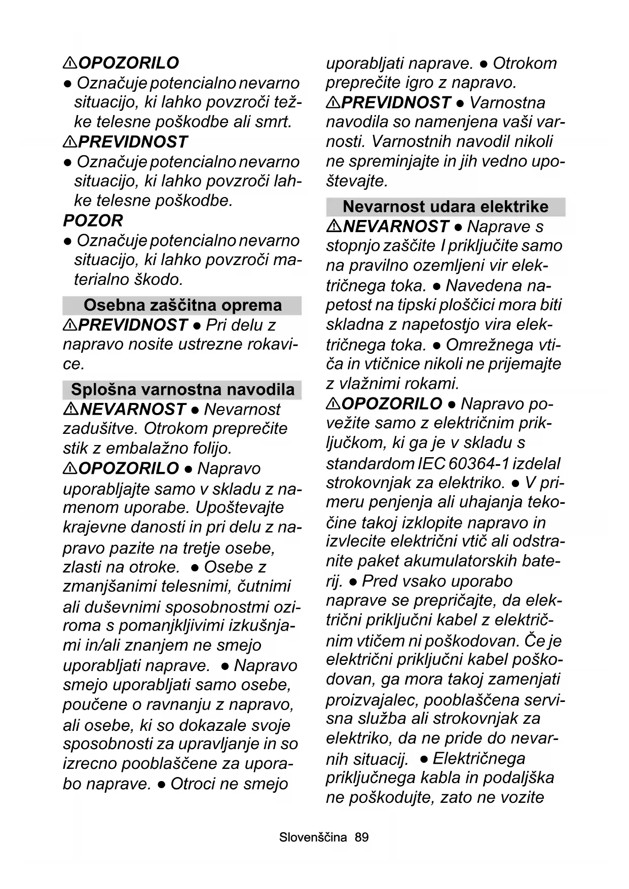 ● Ta naprava vsebuje zdravju škodljiv prah. Postopke praznje- nja in vzdrževanja, vključno z odstranjevanjem zbiralnika pra- hu, smejo izvajati samo strokov- njaki, ki nosijo ustrezno zaščitno opremo. ● Naprave ne upo- rabljajte brez celotnega sistema filtracije. ● Upoštevajte veljavne varnostne predpise, ki veljajo za materiale, ki jih je treba obdelati. ● Za varen položaj naprave za- tegnite parkirne zavore na krmil- nem kolesu. Ko je parkirna zavora odprta, se lahko naprava začne nenadzorovano premika- ti. ● Za vzdrževanje mora upo- rabnik napravo razstaviti, očistiti in servisirati, če je to izvedljivo brez povzročitve nevarnosti za servisno osebje in druge osebe. Ustrezni previdnostni ukrepi vključujejo razstrupljanje pred razstavljanjem, poskrbite za lo- kalno filtrirano prisilno odzrače- vanje, kjer se naprava razstavi, čiščenje vzdrževalne površine in ustrezno zaščito osebja. ● Pre- den napravo vzamete iz nevar- nega območja je njeno zunanjost treba razstrupiti s se- sanjem in očistiti z brisanjem, ali pa obdelati s tesnilnim sredstvom. Vse dele naprave je92 Slovenščina treba obravnavati kot onesnaže- ne, če se vzamejo iz nevarnega območja. Sprejeti je treba ustre- zne ukrepe za preprečevanje porazdelitve prahu. ● Pri opra- vljanju vzdrževalnih del in po- pravil je treba zavreči vse kontaminirane predmete, ki jih ni mogoče zadovoljivo očistiti. Takšne predmete je treba odstraniti v neprepustnih vrečah v skladu z veljavnimi predpisi za odstranjevanje takih odpadkov. ● Samo razreda prahu M in H: Med transportom in vzdrževa- njem naprave zaprite sesalno odprtino z zapiralnim čepom. ● Samo razred prahu H: Učinko- vitost filtracije naprave se lahko preskusi s preskusno metodo, kot je določeno v EN 60 335-2- 69 22.AA.201.2. Ta preskus je treba izvajati vsaj enkrat letno ali pogosteje, če je to določeno v nacionalnih predpisih. Če je re- zultat preskusa negativen, po- skus ponovite z novim ploskim nagubanim filtrom. 몇 OPOZORILO ● Proizvajalec ali usposobljena oseba mora najmanj enkrat letno preveriti, ali varnostne naprave za prepreče- vanje nevarnosti brezhibno de- lujejo iz varnostnotehničnega vidika, npr. tesnost naprave, po- škodba filtra, delovanje kontrol- nih enot (samo razreda prahu M in H). Naprave z vrtljivimi krtačami NEVARNOST ● Nevarnost električnega udara. Nikoli ne vo- zite čez električni priključni kabel ali kabelski podaljšek, ko se vrti- jo krtače na sesalni glavi. 몇 PREVIDNOST ● Neprimerne krtače ogrožajo vašo varnost. Uporabljajte samo krtače, ki so priložene napravi, ali krtače, pri- poročene v navodilih za upora- bo. Naprave s pnevmatikami 몇 PREVIDNOST ● Nikoli ne prekoračite najvišjega dovolje- nega tlaka v pnevmatikah. Tlak pnevmatik odčitajte na pnevma- tiki in po potrebi na platišču. Če so vrednosti različne, upoštevaj- te nižjo vrednost. ● Preden nastavite tlak v pnevmatiki, se prepričajte, da je reducirni ventil na kompresorju pravilno nastav- ljen. ● Pri napravah s privitimi platišči: Preden nastavite tlak v pnevmatiki, se prepričajte, da so vsi vijaki platišča trdno priviti. Nega in vzdrževanje 몇 OPOZORILO ● Pred čišče- njem, vzdrževanjem in menjavo delov je treba izklopiti napravo in izvleči električni vtič ali odstraniti paket akumulatorskih baterij. Preden preklopite na drugo funkcijo, izklopite napravo.