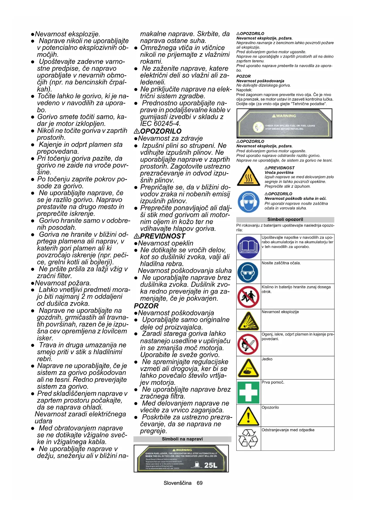 tite močan upor. Nega in vzdrževanje NEVARNOST Nevernost poškodb, nevarnost zaradi električnega udara. Na premikajočih delih se lahko poškodujete. Električna napetost, ki jo ustvari naprava, vas lahko poškoduje ali ubije. Pred vzdrževalnimi deli odstranite vžigalne svečke in prekinite povezavo z baterijo. Baterije ne odvrzite v zaboj za smeti.Slovenščina 71 몇 PREVIDNOST Nevarnost opeklin. Če se dotaknete vročih delov naprave, se lahko opeče- te. Pred delom na napravi jo pustite, da se ohladi.