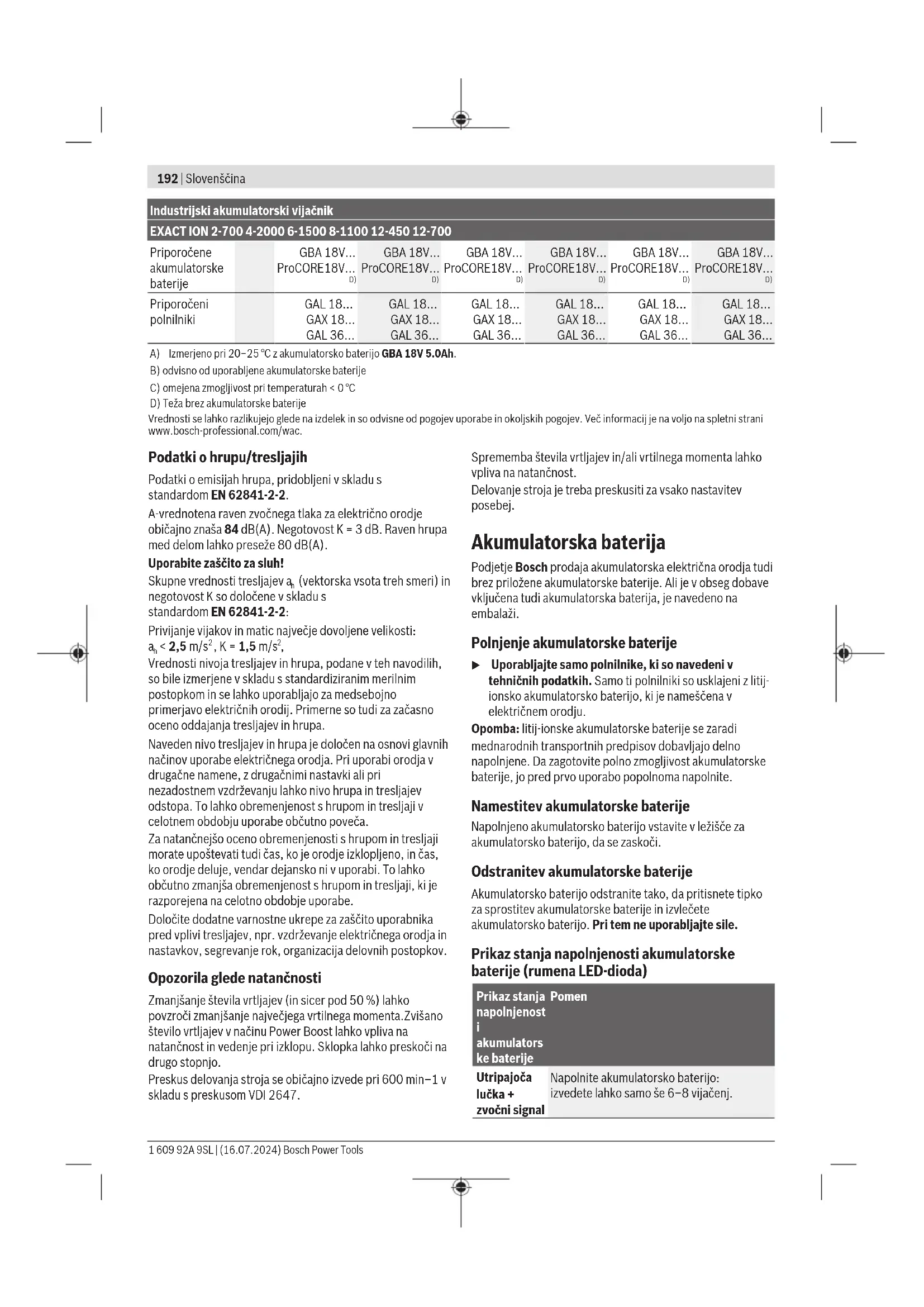 Izmerjeno pri 20−25°C z akumulatorsko baterijoGBA18V5.0Ah. B) odvisno od uporabljene akumulatorske baterije C) omejena zmogljivost pri temperaturah <0°C D) Teža brez akumulatorske baterije Vrednosti se lahko razlikujejo glede na izdelek in so odvisne od pogojev uporabe in okoljskih pogojev. Več informacij je na voljo na spletni strani www.bosch-professional.com/wac. Podatki o hrupu/tresljajih Podatki o emisijah hrupa, pridobljeni v skladu s standardomEN62841-2-2. A-vrednotena raven zvočnega tlaka za električno orodje običajno znaša 84 dB(A). Negotovost K=3 dB. Raven hrupa med delom lahko preseže 80 dB(A). Uporabite zaščito za sluh! Skupne vrednosti tresljajev a