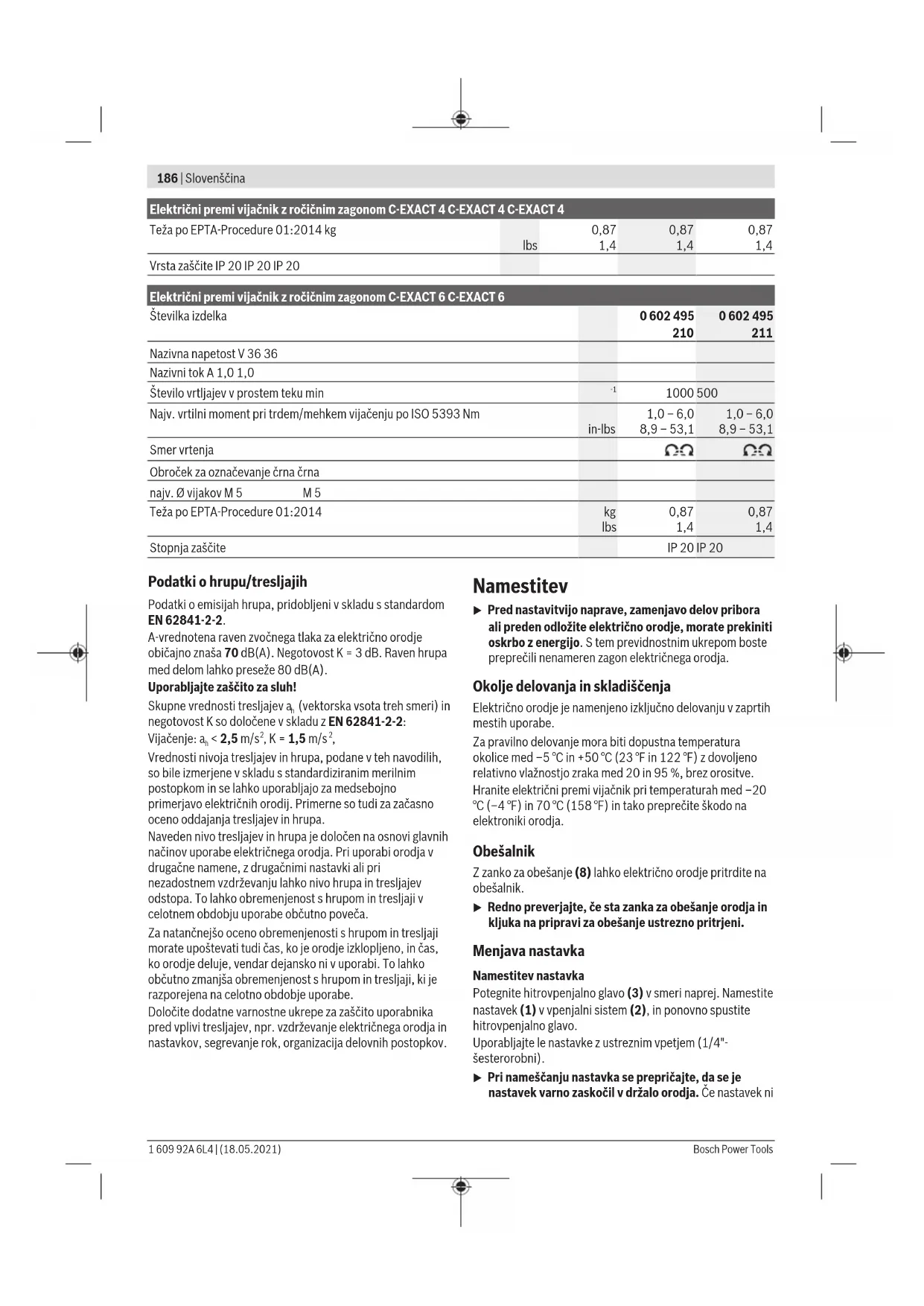 Najv. vrtilni moment pri trdem/mehkem vijačenju po ISO 5393 Nm in-lbs 1,0 – 6,0 8,9 – 53,1 1,0 – 6,0 8,9 – 53,1 Smer vrtenja Obroček za označevanje črna črna najv. Ø vijakov M 5 M 5 Teža po EPTA-Procedure 01:2014 kg lbs 0,87 1,4 0,87 1,4 Stopnja zaščite IP20 IP20 Podatki o hrupu/tresljajih Podatki o emisijah hrupa, pridobljeni v skladu s standardom EN62841-2-2. A-vrednotena raven zvočnega tlaka za električno orodje običajno znaša 70 dB(A). Negotovost K=3 dB. Raven hrupa med delom lahko preseže 80 dB(A). Uporabljajte zaščito za sluh! Skupne vrednosti tresljajev a