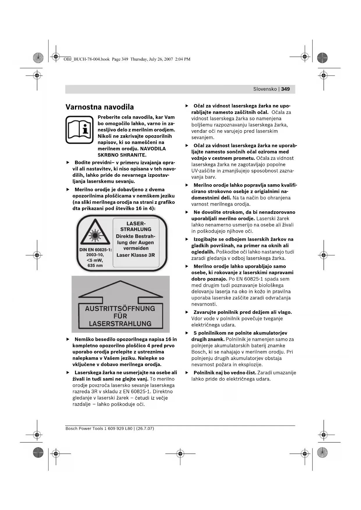 Varnostna navodila Preberite cela navodila, kar Vam bo omogočilo lahko, varno in za- nesljivo delo z merilnim orodjem. Nikoli ne zakrivajte opozorilnih napisov, ki so nameščeni na merilnem orodju. NAVODILA SKRBNO SHRANITE. f Bodite previdni – v primeru izvajanja opra- vil ali nastavitev, ki niso opisana v teh navo- dilih, lahko pride do nevarnega izpostav- ljanja laserskemu sevanju. f Merilno orodje je dobavljeno z dvema opozorilnima ploščicama v nemškem jeziku (na sliki merilnega orodja na strani z grafiko dta prikazani pod številko 16 in 4): f Nemško besedilo opozorilnega napisa 16 in kompletno opozorilno ploščico 4 pred prvo uporabo orodja prelepite z ustreznima nalepkama v Vašem jeziku. Nalepke so vključene v dobavo merilnega orodja. f Laserskega žarka ne usmerjajte na osebe ali živali in tudi sami ne glejte vanj. To merilno orodje povzroča lasersko sevanje laserskega razreda 3R v skladu z EN 60825-1. Direktno gledanje v laserski žarek – četudi iz večje razdalje – lahko poškoduje oči. f Očal za vidnost laserskega žarka ne upo- rabljajte namesto zaščitnih očal. Očala za vidnost laserskega žarka so namenjena boljšemu razpoznavanju laserskega žarka, vendar oči ne varujejo pred laserskim sevanjem. f Očal za vidnost laserskega žarka ne uporab- ljajte namesto sončnih očal oziroma med vožnjo v cestnem prometu. Očala za vidnost laserskega žarka ne zagotavljajo popolne UV-zaščite in zmanjšujejo sposobnost zazna- vanja barv. f Merilno orodje lahko popravlja samo kvalifi- cirano strokovno osebje z origialnimi na- domestnimi deli. Na ta način bo ohranjena varnost merilnega orodja. f Ne dovolite otrokom, da bi nenadzorovano uporabljali merilno orodje. Laserski žarek lahko nenamerno usmerijo na osebe ali živali in poškodujejo njihove oči. f Izogibajte se odbojem laserskih žarkov na gladkih površinah, na primer na oknih ali ogledalih. Poškodbe oči lahko nastanejo tudi zaradi gledanja v odboj laserskega žarka. f Merilno orodje lahko uporabljajo samo osebe, ki rokovanje z laserskimi napravami dobro poznajo. Po EN 60825-1 spada sem med drugim tudi poznavanje biološkega delovanju laserja na oko in kožo in pravilna uporaba laserske zaščite zaradi odvračanja nevarnosti. f Zavarujte polnilnik pred dežjem ali vlago. Vdor vode v polnilnik povečuje tveganje električnega udara. f S polnilnikom ne polnite akumulatorjev drugih znamk. Polnilnik je namenjen samo za polnjenje akumulatorskih baterij znamke Bosch, ki se nahajajo v merilnem orodju. Pri polnjenju drugih akumulatorjev obstaja nevarnost požara in eksplozije. f Polnilnik naj bo vedno čist. Zaradi umazanije lahko pride do električnega udara. DIN EN 60825-1:2003-10, <5 mW, 635 nm LASER- STRAHLUNG Direkte Bestrah- lung der Augen vermeiden Laser Klasse 3R AUSTRITTSÖFFNUNG FÜR LASERSTRAHLUNG OBJ_BUCH-78-004.book Page 349 Thursday, July 26, 2007 2:04 PM350 | Slovensko 1 609 929 L80 | (26.7.07) Bosch Power Tools f Pred vsako uporabo je potrebno polnilnik, kabel in vtikač preizkusiti. Če ugotovite poškodbe, polnilnika ne uporabljajte. Polnilnika ne odpirajte, popravila pa naj opravi samo kvalificirano strokovno osebje s pomočjo originalnih nadomestnih delov. Poškodovani polnilniki, kabli in vtikači povečujejo nevarnost električnega udara. f Ne uporabljajte polnilnika na lahko gorljivi podlagi (na primer na papirju, tekstilu in podobnem) oziroma v okolju, kjer lahko pride do požara. Pri polnjenju se polnilnik segreje – nevarnost požara. f V primeru napačne uporabe lahko iz aku- mulatorske baterije izteče tekočina. Izogi- bajte se kontaktu z njo. Pri naključnem kon- taktu s kožo spirajte z vodo. Če pride teko- čina v oko, dodatno poiščite tudi zdravniško pomoč. Iztekajoča akumulatorska tekočina lahko povzroči draženje kože ali opekline. Opis delovanja Prosimo odprite zloženo stran, kjer je prikazano merilno orodje in pustite to stran med branjem navodila za uporabo odprto. Uporaba v skladu z namenom Merilno orodje je namenjeno za izračunavanje in preverjanje točnosti vodoravnih višinskih črt, navpičnih črt, poravnanosti črt in točk svinčnice v notranjih prostorih in na prostem. Komponente na sliki Oštevilčenje naslikanih komponent se nanaša na prikaz merilnega orodja na strani z grafiko. 1 Libela 2 Sprejemna leča daljinskega krmilnika 3 Puša za vtikač polnilnika 4 Opozorilni napis na izhodni odprtini laserskega žarka 5 Izstopna odprtina laserskega žarka 6 Označitev osi Y 7 Označitev osi X 8 Žarek svinčnice 9 Variabilni laserski žarek 10 Zareza svinčnice na osi X 11 Zareza svinčnice na osi Y 12 Aretiranje pokrova predalčka za baterije 13 Pokrov predalčka za baterije 14 Gumijasto podnožje 15 Akumulatorska baterija 16 Opozorilna ploščica laserja 17 Prijemalo za stativ 5/8" (vodoravno in navpično) 18 Serijska številka 19 Tipka za črtno delovanje in izbira dolžine črte 20 Smerna tipka gor 21 Smerna tipka levo 22 Tipka za rotacijsko delovanje in izbiro rotacijske hitrosti 23 Smerna tipka dol 24 Smerna tipka desno 25 Prikaz ročnega niveliranja „man“ 26 Prikaz samodejnega niveliranja „auto“ 27 Prikaz napolnjenosti baterije 28 Tipka „man/auto“ za izklop avtomatike niveliranja 29 Vklopno/izklopna tipka 30 Merilna letev gradbenega laserja* 31 Očala za vidnost laserskega žarka 32 Stensko držalo/izravnalna enota* 33 5/8"-vijak na stenskem držalu* 34 Vijaki izravnalne enote* 35 Merilna plošča s podnožjem 36 Merilna plošča za strop* 37 Naklonski klin* 38 Visokozmogljivi sprejemnik z držalom 39 Daljinski krmilnik 40 Stativ* 41 Polnilni vtikač 42 Polnilnik 43 Kovček *Prikazan ali opisan pribor ne spada v standardni obseg dobave. OBJ_BUCH-78-004.book Page 350 Thursday, July 26, 2007 2:04 PMSlovensko | 351 Bosch Power Tools 1 609 929 L80 | (26.7.07) Tehnični podatki Gradbeni laser BL 200 GC Professional Številka artikla 3 601 K15 000 Delovno območje (radij)