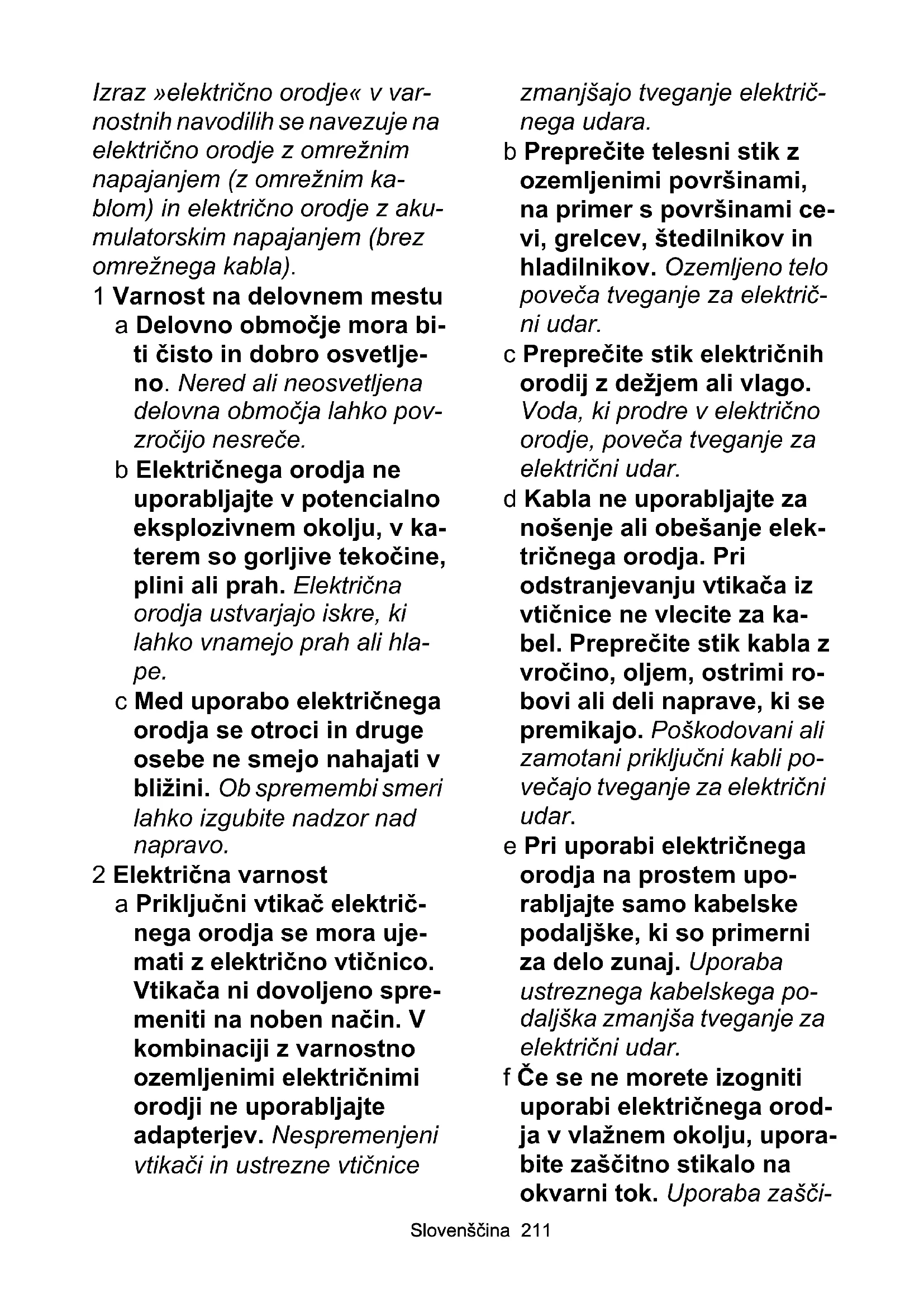 - Izjava EU o skladnosti Slovenščina 211 Izraz »električno orodje« v var- nostnih navodilih se navezuje na električno orodje z omrežnim napajanjem (z omrežnim ka- blom) in električno orodje z aku- mulatorskim napajanjem (brez omrežnega kabla). 1 Varnost na delovnem mestu a Delovno območje mora bi- ti čisto in dobro osvetlje- no. Nered ali neosvetljena delovna območja lahko pov- zročijo nesreče. b Električnega orodja ne uporabljajte v potencialno eksplozivnem okolju, v ka- terem so gorljive tekočine, plini ali prah. Električna orodja ustvarjajo iskre, ki lahko vnamejo prah ali hla- pe. c Med uporabo električnega orodja se otroci in druge osebe ne smejo nahajati v bližini. Ob spremembi smeri lahko izgubite nadzor nad napravo. 2 Električna varnost a Priključni vtikač električ- nega orodja se mora uje- mati z električno vtičnico. Vtikača ni dovoljeno spre- meniti na noben način. V kombinaciji z varnostno ozemljenimi električnimi orodji ne uporabljajte adapterjev. Nespremenjeni vtikači in ustrezne vtičnice zmanjšajo tveganje električ- nega udara. b Preprečite telesni stik z ozemljenimi površinami, na primer s površinami ce- vi, grelcev, štedilnikov in hladilnikov. Ozemljeno telo poveča tveganje za električ- ni udar. c Preprečite stik električnih orodij z dežjem ali vlago. Voda, ki prodre v električno orodje, poveča tveganje za električni udar. d Kabla ne uporabljajte za nošenje ali obešanje elek- tričnega orodja. Pri odstranjevanju vtikača iz vtičnice ne vlecite za ka- bel. Preprečite stik kabla z vročino, oljem, ostrimi ro- bovi ali deli naprave, ki se premikajo. Poškodovani ali zamotani priključ ni kabli po- večajo tveganje za električni udar. e Pri uporabi električnega orodja na prostem upo- rabljajte samo kabelske podaljške, ki so primerni za delo zunaj. Uporaba ustreznega kabelskega po- daljška zmanjša tveganje za električni udar. f Če se ne morete izogniti uporabi električnega orod- ja v vlažnem okolju, upora- bite zaščitno stikalo na okvarni tok. Uporaba zašči-212 Slovenščina tnega stikala na okvarni tok zmanjša tveganje za elek- trični udar. 3 Varnost oseb a Pri uporabi električnega orodja bodite pozorni. Ele- ktričnega orodja ne upo- rabljajte, ko ste utrujeni ali pod vplivom drog, alkoho- la ali zdravil. Trenutek ne- pozornosti med uporabo električnega orodja lahko povzroči hude poškodbe. b Vedno nosite osebno za- ščitno opremo in zaščitna očala. Osebna zaščitna oprema, npr. protiprašna maska, nedrsljivi varnostni čevlji, zaščitna čelada ali zaščita sluha, glede na vrsto in uporabo električnega orodja zmanjša tveganje za električni udar. c Preprečite nenameren za- gon. Pred priključitvijo električnega in/ali akumu- latorskega napajanja, dvi- ganjem ali nošenjem zagotovite, da je električ- no orodje izklopljeno. Če imate med nošenjem elek- tričnega orodja prst na stika- lu ali če vklopljeno napravo priključite na električno na- pajanje, lahko to povzroči nesrečo. d Pred vklopom električne- ga orodja odstranite orod- ja za nastavitev ali vijačne ključe. Orodje ali ključ na vr- tečem se delu naprave lahko povzroči poškodbe. e Izogibajte se neobičajni drži telesa. Poskrbite, da boste trdno stali na mestu in vedno ohranjajte ravno- težje. Tako lahko bolje nad- zorujete električno orodje v nepričakovani situaciji. f Nosite ustrezna oblačila. Ne nosite ohlapnih oblačil ali nakita. Preprečite stik las, oblačil in rokavic z de- li, ki se premikajo. Premi- kajoči se deli lahko zagrabijo ohlapna oblačila, rokavice, nakit ali dolge lase. g Zagotovite ustrezno pri- ključitev in pravilno upora- bo potencialno nameščenih naprav za se- sanje prahu in prestreza- nje. Uporaba naprave za sesanje prahu lahko zmanj- ša nevarnosti, ki jih povzro- ča prah. 4 Uporaba električnega orod- p. 221
