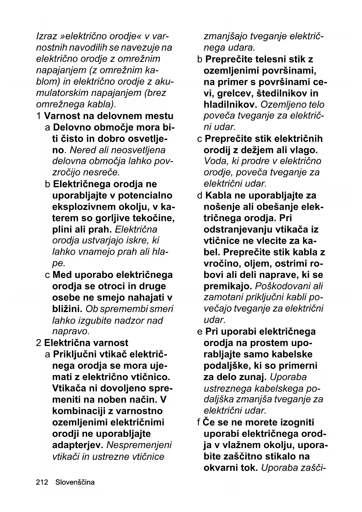 - Izjava EU o skladnosti 12 Slovenščina Izraz »električno orodje« v var- nostnih navodilih se navezuje na električno orodje z omrežnim napajanjem (z omrežnim ka- blom) in električno orodje z aku- mulatorskim napajanjem (brez omrežnega kabla). 1 Varnost na delovnem mestu a Delovno območje mora bi- ti čisto in dobro osvetlje- no. Nered ali neosvetljena delovna območja lahko pov- zročijo nesreče. b Električnega orodja ne uporabljajte v potencialno eksplozivnem okolju, v ka- terem so gorljive tekočine, plini ali prah. Električna orodja ustvarjajo iskre, ki lahko vnamejo prah ali hla- pe. c Med uporabo električnega orodja se otroci in druge osebe ne smejo nahajati v bližini. Ob spremembi smeri lahko izgubite nadzor nad napravo. 2 Električna varnost a Priključni vtikač električ- nega orodja se mora uje- mati z električno vtičnico. Vtikača ni dovoljeno spre- meniti na noben način. V kombinaciji z varnostno ozemljenimi električnimi orodji ne uporabljajte adapterjev. Nespremenjeni vtikači in ustrezne vtičnice zmanjšajo tveganje električ- nega udara. b Preprečite telesni stik z ozemljenimi površinami, na primer s površinami ce- vi, grelcev, štedilnikov in hladilnikov. Ozemljeno telo poveča tveganje za električ- ni udar. c Preprečite stik električnih orodij z dežjem ali vlago. Voda, ki prodre v električno orodje, poveča tveganje za električni udar. d Kabla ne uporabljajte za nošenje ali obešanje elek- tričnega orodja. Pri odstranjevanju vtikača iz vtičnice ne vlecite za ka- bel. Preprečite stik kabla z vročino, oljem, ostrimi ro- bovi ali deli naprave, ki se premikajo. Poškodovani ali zamotani priključni kabli po- večajo tveganje za električni udar. e Pri uporabi električnega orodja na prostem upo- rabljajte samo kabelske podaljške, ki so primerni za delo zunaj. Uporaba ustreznega kabelskega po- daljška zmanjša tveganje za p. 2222