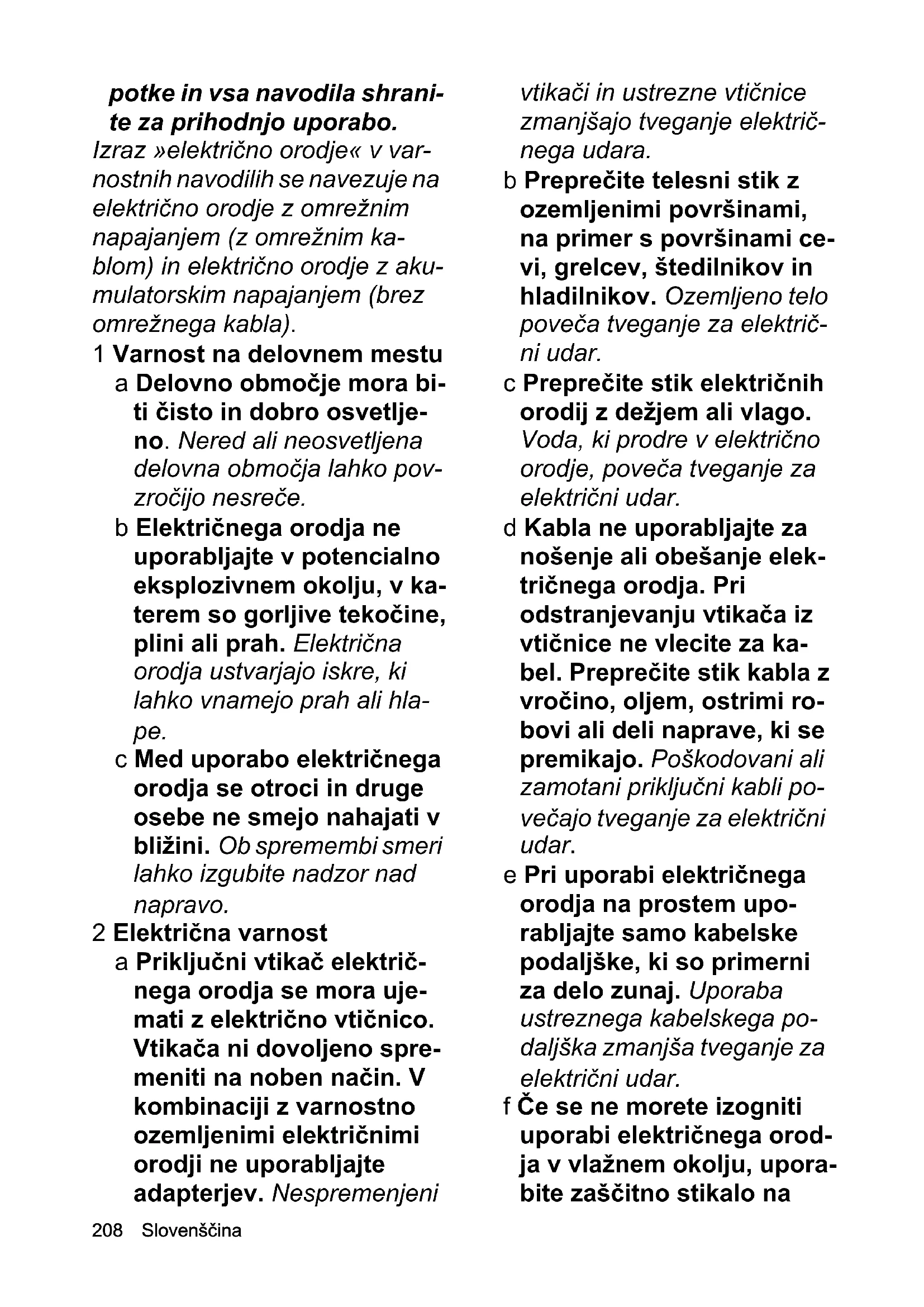 - Izjava EU o skladnosti 08 Slovenščina potke in vsa navodila shrani- te za prihodnjo uporabo. Izraz »električno orodje« v var- nostnih navodilih se navezuje na električno orodje z omrežnim napajanjem (z omrežnim ka- blom) in električno orodje z aku- mulatorskim napajanjem (brez omrežnega kabla). 1 Varnost na delovnem mestu a Delovno območje mora bi- ti čisto in dobro osvetlje- no. Nered ali neosvetljena delovna območja lahko pov- zročijo nesreče. b Električnega orodja ne uporabljajte v potencialno eksplozivnem okolju, v ka- terem so gorljive tekočine, plini ali prah. Električna orodja ustvarjajo iskre, ki lahko vnamejo prah ali hla- pe. c Med uporabo električnega orodja se otroci in druge osebe ne smejo nahajati v bližini. Ob spremembi smeri lahko izgubite nadzor nad napravo. 2 Električna varnost a Priključni vtikač električ- nega orodja se mora uje- mati z električno vtičnico. Vtikača ni dovoljeno spre- meniti na noben način. V kombinaciji z varnostno ozemljenimi električnimi orodji ne uporabljajte adapterjev. Nespremenjeni vtikači in ustrezne vtičnice zmanjšajo tveganje električ- nega udara. b Preprečite telesni stik z ozemljenimi površinami, na primer s površinami ce- vi, grelcev, štedilnikov in hladilnikov. Ozemljeno telo poveča tveganje za električ- ni udar. c Preprečite stik električnih orodij z dežjem ali vlago. Voda, ki prodre v električno orodje, poveča tveganje za električni udar. d Kabla ne uporabljajte za nošenje ali obešanje elek- tričnega orodja. Pri odstranjevanju vtikača iz vtičnice ne vlecite za ka- bel. Preprečite stik kabla z vročino, oljem, ostrimi ro- bovi ali deli naprave, ki se premikajo. Poškodovani ali zamotani priključni kabli po- večajo tveganje za električni udar. e Pri uporabi električnega orodja na prostem upo- rabljajte samo kabelske podaljške, ki so primerni za delo zunaj. Uporaba ustreznega kabelskega po- daljška zmanjša tveganje za električni udar. f Če se ne morete izogniti uporabi električnega orod- ja v vlažnem okolju, upora- bite zaščitno stikalo naSlovenščina 209 okvarni tok. Uporaba zašči- tnega stikala na okvarni tok zmanjša tveganje za elek- trični udar. 3 Varnost oseb a Pri uporabi električnega orodja bodite pozorni. Ele- ktričnega orodja ne upo- rabljajte, ko ste utrujeni ali pod vplivom drog, alkoho- la ali zdravil. Trenutek ne- pozornosti med uporabo električnega orodja lahko povzroči hude poškodbe. b Vedno nosite osebno za- ščitno opremo in zaščitna očala. Osebna zaščitna oprema, npr. protiprašna maska, nedrsljivi varnostni čevlji, zaščitna čelada ali zaščita sluha, glede na vrsto in uporabo električnega orodja zmanjša tveganje za električni udar. c Preprečite nenameren za- gon. Pred priključitvijo električnega in/ali akumu- latorskega napajanja, dvi- ganjem ali nošenjem zagotovite, da je električ- no orodje izklopljeno. Če imate med nošenjem elek- tričnega orodja prst na stika- lu ali če vklopljeno napravo priključite na električno na- pajanje, lahko to povzroči nesrečo. d Pred vklopom električne- ga orodja odstranite orod- ja za nastavitev ali vijačne ključe. Orodje ali ključ na vr- tečem se delu naprave lahko povzroči poškodbe. e Izogibajte se neobičajni drži telesa. Poskrbite, da boste trdno stali na mestu in vedno ohranjajte ravno- težje. Tako lahko bolje nad- zorujete električno orodje v nepričakovani situaciji. f Nosite ustrezna oblačila. Ne nosite ohlapnih oblačil ali nakita. Preprečite stik las, oblačil in rokavic z de- li, ki se premikajo. Premi- kajoči se deli lahko zagrabijo ohlapna oblačila, rokavice, nakit ali dolge lase. g Zagotovite ustrezno pri- ključitev in pravilno upora- bo potencialno nameščenih naprav za se- sanje prahu in prestreza- nje. Uporaba naprave za sesanje prahu lahko zmanj- ša nevarnosti, ki jih povzro- ča prah. 4 Uporaba električnega orod- p. 2182