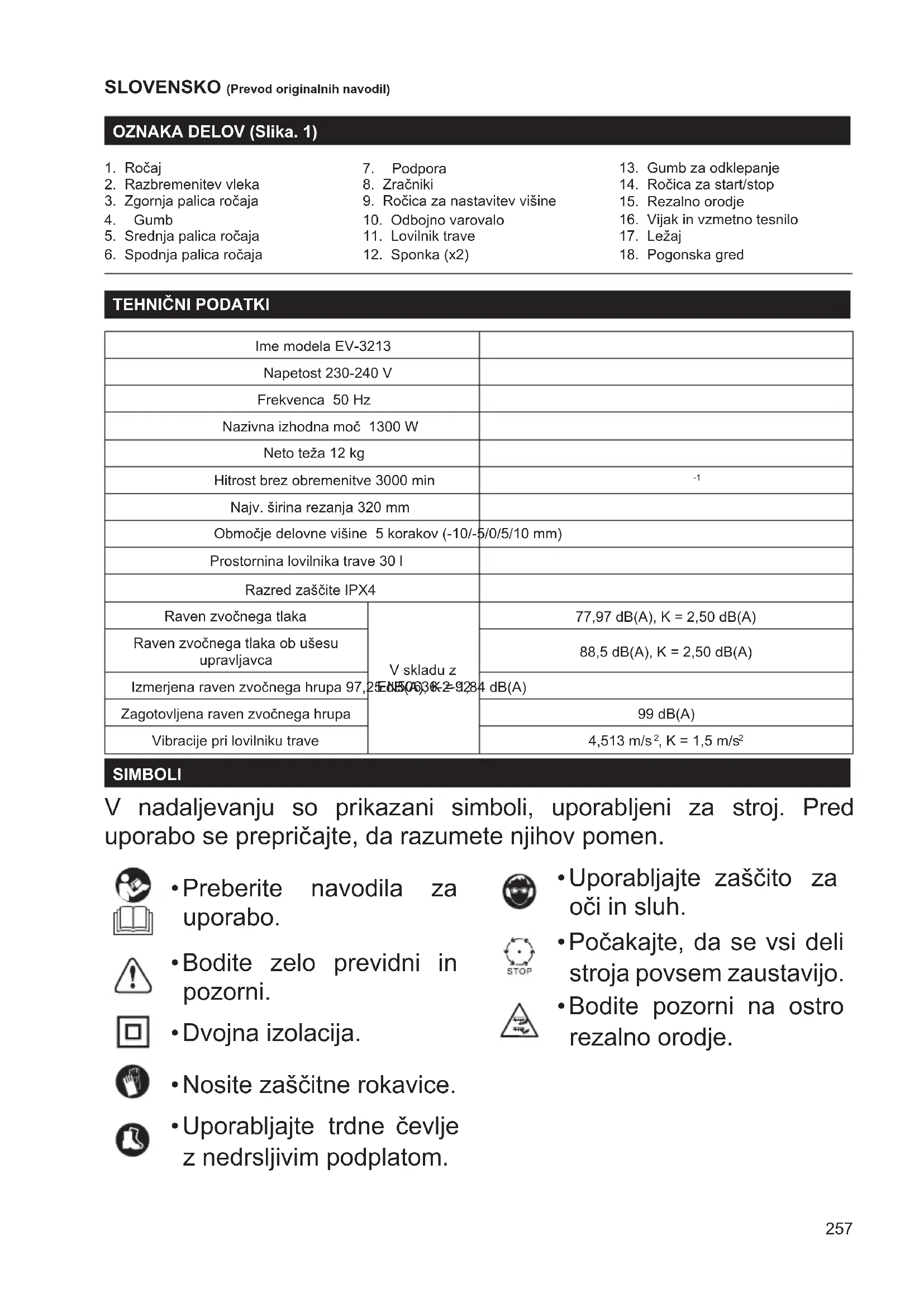 ali varnostne naprave pravilno delujejo v skladu z njihovim namenom; – ali premikajoči se deli delujejo enakomerno in brez zatikanja; – ali so vsi deli brezhibni in pravilno nameščeni; – preglejte rezalno orodje, če je poškodovano, obrabljeno ali neuravnovešeno; – redno preverjajte lovilnik trave, če je poškodovan ali obrabljen; – preverite vse matice, sornike in vijake, če so tesno priviti; – če so kateri deli poškodovani ali obrabljeni, naj vam jih zamenja ali popravi pooblaščeni servisni center.