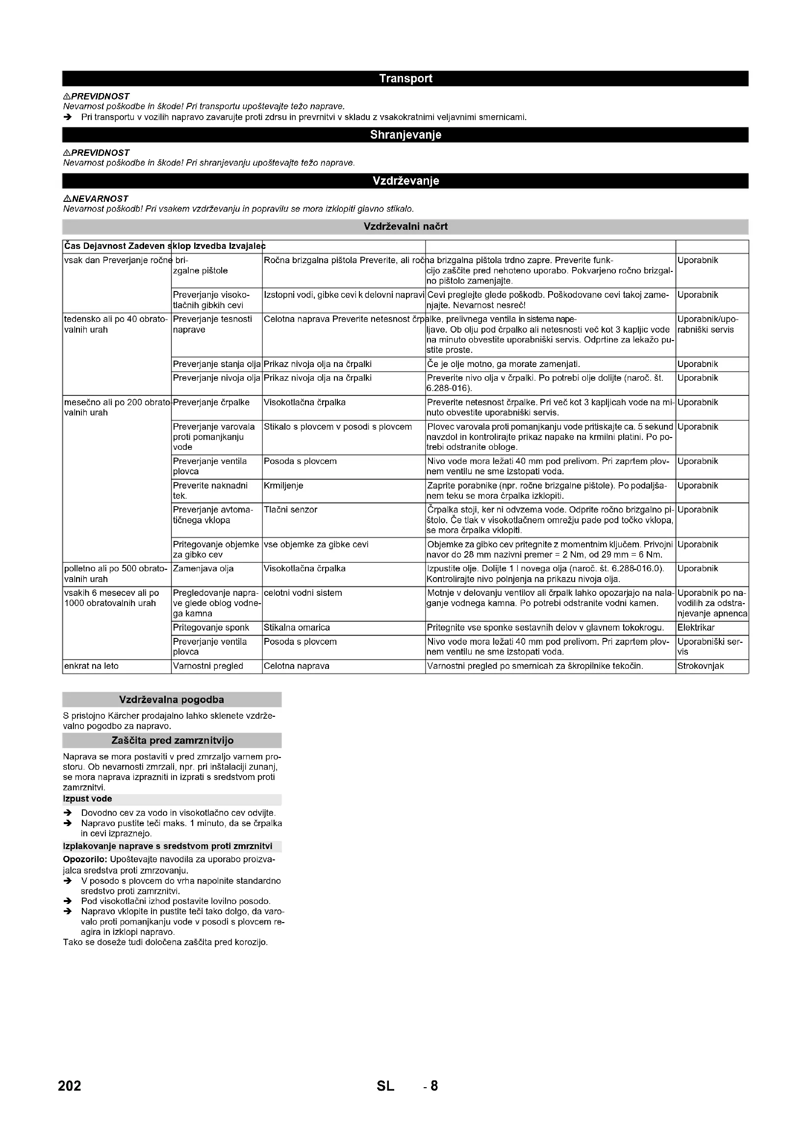 Přívod vody hodnota pH 6,5...9,5elektrická vodivost < 2000 µS/cmusaditelné látky < 0,5 mg/l *odfiltrovatelné látky (velikost zrna menší než 0,025 mm)< 20 mg/luhlovodíky < 20 mg/lchlorid < 300 mg/lvápník < 85 mg/l **celková tvrdost < 15 °dH **železo < 0,5 mg/lmangan < 0,05 mg/lměď < 0,02 mg/lbez nepříjemného zápachu Elektrické připojení EU prohlášení o shodě Výrobek: Vysokotlaký čističTyp: 2.509-xxxPříslušné směrnice EU:2006/42/ES (+2009/127/ES)2009/125/ES2011/65/EU2014/30/EUPoužité harmonizační normyEN IEC 63000: 2018EN 55014–1: 2017 + A11: 2020EN 55014–2: 2015EN 60335–1EN 60335–2–79EN 61000–3–2: 2014EN 61000–3–11: 2000EN 61000–3–12: 2011EN 61000–6–2: 2005EN 61000–6–4: 2007EN 62233: 2008Použitá ustanoven’(EU) 2019/1781 Záruka Chairman of the Board of ManagementDirector Regulatory Affairs & Certification 193CS- 12 Oddělení služeb zákazníkům Typ zařízení: Výrobní č.: Uvedení do provozu: Datum zkoušky: Výsledek: Podpis Datum zkoušky: Výsledek: Podpis Datum zkoušky: Výsledek: Podpis Datum zkoušky: Výsledek: Podpis 194 CS- 1 Pred prvo uporabo Vaše naprave preberi- te to originalno navodilo za uporabo, rav- najte se po njem in shranite ga za more- bitno kasnejšo uporabo ali za naslednjega lastnika. – Pred prvim zagonom obvezno preberite varnostna navodila št. 5.956-309.0! – V primeru transportnih poškodb takoj obvestite tr- govca. Opozorila k sestavinam (REACH) Aktualne informacije o sestavinah najdete na: www.kaercher.com/REACH NEVARNOST Opozorilo na neposredno nevarnost, ki vodi do težkih telesnih poškodb ali smrti. 몇 OPOZORILO Opozorilo na možno nevarno situacijo, ki lahko vodi do težkih telesnih poškodb ali smrti. 몇 PREVIDNOST Opozorilo na možno nevarno situacijo, ki lahko vodi do lažjih poškodb. POZOR Opozorilo na možno nevarno situacijo, ki lahko vodi do premoženjskih škod. – Upoštevajte ustrezne nacionalne predpise zakono- dajalca za škropilnike tekočin. – Upoštevajte ustrezne nacionalne predpise zakono- dajalca za preprečevanje nesreč. Škropilnik teko- čin je potrebno redno pregledovati in o rezultatu pregleda je potrebno podati pismeno izjavo. – Upoštevajte varnostna navodila, ki so priložena uporabljenim čistilom (ponavadi na etiketi embala- že). Delovno mesto se nahaja na zaslonu. Odvisno od tipa naprave so nadaljnja delovna mesta na pripravah iz pri- bora (brizgalne naprave), ki se priključijo na odvzemna mesta. – Za zaščito pred brizganjem vode ali umazanije no- site primerno zaščitno obleko in zaščitne očale. – Ta naprava črpa vodo pod visokim tlakom do pri- ključenih visokotlačnih čistilnih naprav. Naprava se fiksno instalira v suhem prostoru. Tam morata ob- stajati vodni in električni priključek v skladu z na- vedbami v Tehničnih podatkih. Na mestu postavi- tve ne sme biti topleje kot 40 °C. Porazdelitev viso- kotlačne vode se izvede preko fiksno instaliranega cevovodnega omrežja. – Kot visokotlačni medij se sme uporabljati le čista voda. Umazanije vodijo do predčasne obrabe ali oblog v stroju. – Nad 15 °dH se lahko zahtevajo ukrepi za znižanje trdote. – Uporabo reciklirne vode je potrebno predhodno uskladiti s podjetjem Kärcher. NEVARNOST Nevarnost poškodb! Pri uporabi na bencinskih črpalkah ali drugih nevarnih območjih upoštevajte ustrezne var- nostne predpise. Vsebinsko kazalo Varstvo okolja SL 1 Stopnje nevarnosti SL 1 Simboli na napravi SL 1 Varnostna navodila SL 1 Namenska uporaba SL 1 Delovanje SL 2 Varnostne priprave SL 3 Elementi naprave SL 4 Zagon SL 5 Uporaba SL 5 Mirovanje naprave SL 5 Tehnični podatki SL 6 Transport SL 8 Shranjevanje SL 8 Vzdrževanje SL 8 Pomoč pri motnjah SL 9 Pribor SL 10 Inštalacija naprave SL 11 Izjava EU o skladnosti SL 11 Garancija SL 11 Uporabniški servis SL 12 Varstvo okolja Embalaža je primerna za recikliranje. Pro- simo, da embalaže ne odvržete med go- spodinjske odpadke, temveč jo odložite v zbiralnik za ponovno obdelavo. Stare naprave vsebujejo dragocene reci- klirne materiale, ki jih je treba odvajati za ponovno uporabo. Baterije, olje in podob- ne snovi ne smejo priti v okolje. Zato stare naprave zavrzite v ustrezne zbiralne siste- me. Pazite, da motornje olje, kurilno olje, dizelsko gorivo in bencin ne pridejo v okolje. Varujte tla in staro olje zavr- zite v skladu s predpisi o varstvu okolja. Kärcher čistila so lahko razgradljiva. To pomeni, da ne ovirajo delovanja lovilnika olja. Seznam priporočljivih čistil se nahaja v poglavju "Pribor". Stopnje nevarnosti Simboli na napravi Nevarnost opeklin! Opozorilo na vroče sklope. Varnostna navodila Delovna mesta Osebna zaščitna oprema Pri čiščenju delov, ki povečujejo hrup, nosite glušnike, da prepreči- te poškodovanje sluha. Namenska uporaba Preprečiti morate, da odpadna voda, ki vsebuje mine- ralna olja, odteka v zemljo, tekoče vode ali kanalizacijo. Pranje motorjev in podvozij zato izvajajte izključno na ustreznih mestih z lovilci olj. 195SL- 2 1 Lovilnik umazanije (vgrajen) 2 Temperaturni senzor 3 Varovalo proti pomanjkanju vode 4 Posoda s plovcem 5 Predtlačna črpalka (Opcija) 6 Črpalka z ročično gredjo 7 Varnostni ventil 8 Elektromotor 9 Protipovratni ventil 10 Visokotlačna gibka cev 11 Tlačni senzor za visok tlak 12 Prelivni ventil 13 Tokovno stikalo 14 Plovni ventil 15 Zaporni ventil (vgrajen) 16 Zaporni ventil (vgrajen) A Cevovod/Visokotlačni izhod B Dotok vode C Preliv Delovanje Shema pretoka 196 SL- 3 Voda se od posode s plovcem vodi di sesalne strani čr- palke. Nivo vode v posodi s plovcem se s pomočjo plov- nega ventila ohranja konstanten. Ob odpovedi plovne- ga ventila voda odteka čez preliv. Pri moteni oskrbi z vodo poda varovalo proti pomanjkanju vode prijavo na- pake na krmiljenje. Elektromotor zažene črpalko z ročično gredjo. Črpalka črpa vodo pod visokim tlakom na tlačno stran. Visokotlačna voda preko prelivnega ventila in tlačnega senzorja prispev v v