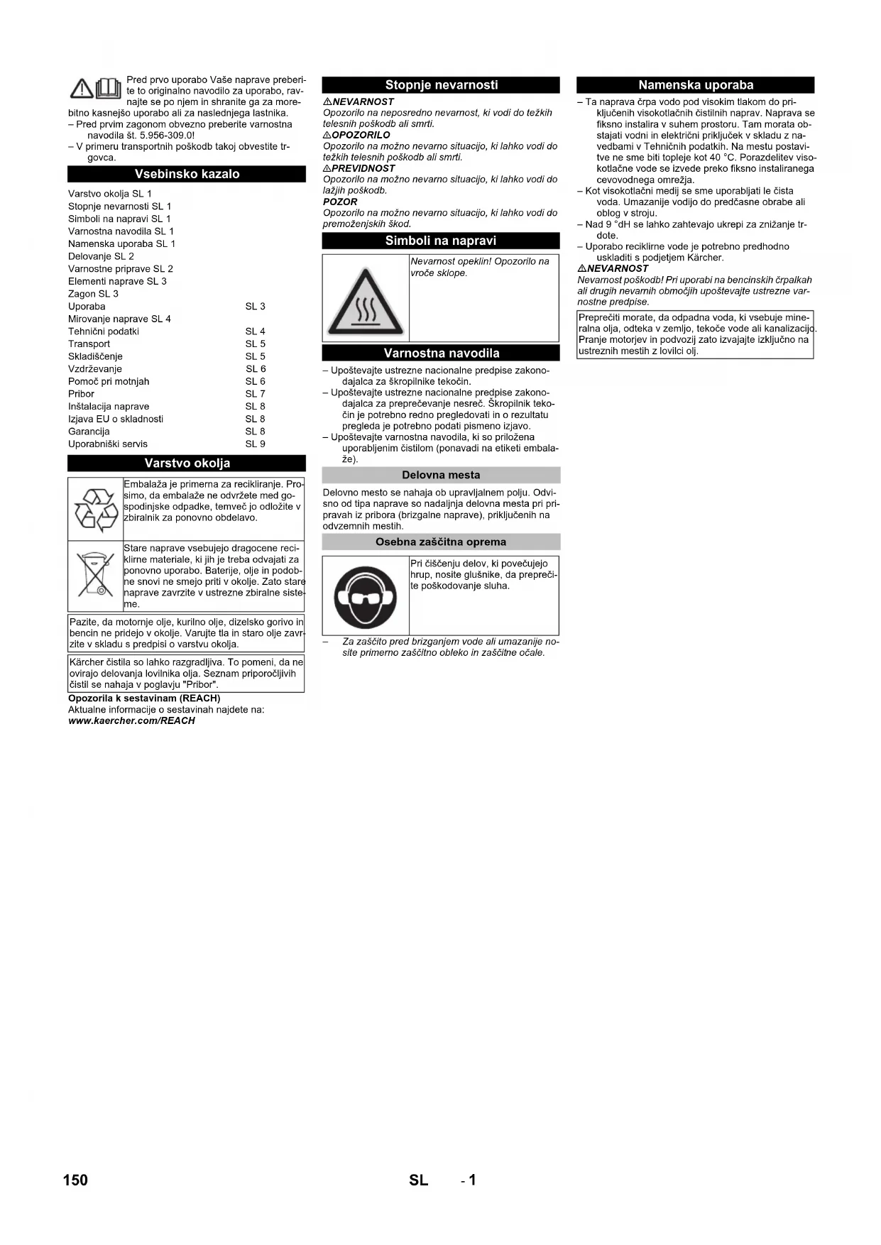 Kontrolne lučke Zagon Uporaba Varnostna navodila 152 SL- 4 NEVARNOSTŽivljenjska nevarnost zaradi električnega udara! Vodne-ga curka ne usmerjajte v sledeče priprave:– električni aparati in naprave,– ta naprava sama, – vsi deli v delovnem območju, ki so pod napetostjo. Vodni curek, ki izstopa iz brizgalne cevi povzroča odboj-no silo. Zaradi zvite brizgalne cevi deluje sila navzgor. NEVARNOST– Nevarnost poškodb! Zaradi odbojne sile brizgalne cevi lahko izgubite ravnotežje. Lahko padete. Bri-zgalna cev lahko leti naokrog in poškoduje ljudi. Poiščite varno pozicijo in pištolo trdno držite. Roči- co ročne brizgalne pištole nikoli ne zataknite. – Curka ne usmerjajte na druga ali nase, da bi očistili oblačila ali obutev. – Nevarnost poškodb zaradi letečih delov! Leteči drobci ali predmeti lahko poškodujejo ljudi ali živali. Vodnega curka nikoli ne usmerjajte v lomljive ali ra-hlo nameščene predmete. – Nevarnost nesreče, kot posledice poškodb! Gume in ventile čistite z minimalne razdalje 30 cm. NEVARNOSTNevarnost zaradi zdravju škodljivih snovi! Sledečih ma-terialov ne smete poškropiti, ker se lahko sicer v zrak zvrtinčijo zdravju škodljive snovi:– materiali, ki vsebujejo azbest,– materiali, ki morebiti vsebujejo zdravju škodljive snovi. NEVARNOST – Nevarnost poškodb zaradi izstopajočega, morebiti vročega vodnega curka! Le originalne Kärcher vi-sokotlačne gibke cevi so optimalno prilagojene na-pravi. Pri uporabi drugih cevi odpade garancija. – Ogrožanje zdravja zaradi čistila! Zaradi morebiti primešanega čistila voda, ki izhaja iz naprave, ne ustreza kakovosti pitne vode.– Nevarnost poškodovanja sluha zaradi dela na de-lih, ki povečujejo hrup! V tem primeru nosite glušni- ke. 몇 OPOZORILODaljša uporaba naprave lahko privede do vibracijsko pogojenih motenj prekrvavitve rok.Splošno veljavnega časa uporabe ni možno določiti, saj je ta odvisen od številnih dejavnikov:– osebno nagnjenje k slabi prekrvavitvi (pogosto hla-dni prsti, mravljinčasti prsti).– nizka temperatura okolice. Za zaščito rok nosite to-ple rokavice.– Trdno prijemanje ovira prekrvavitev.– Neprekinjeno obratovanje je slabše kot delo s pre-mori.Pri redni daljši uporabi naprave in pri ponavljajočem po-javu določenih simptomov (na primer mravljinci ali hla-dni prsti) svetujemo zdravniški pregled. NEVARNOSTNevarnost poškodb zaradi izstopajočega, morebiti vro-čega vodnega curka! NEVARNOSTPred vsakim zagonom preverite gibko visokotlačno cev na poškodbe. Poškodovano visokotlačno gibko cev ta-koj zamenjajte. Pred vsako uporabo preverite visokotlačno gibko cev, cevovode, armature in brizgalno cev glede po-škodb. Preverite trdnost naseda in tesnost cevne spojke. Glavno stikalo obrnite na položaj „0“. Zaprite dovod vode. Pritiskajte ročno brizgalno pištolo, dokler naprava ni več pod pritiskom. Odprite dovod vode. Glavno stikalo obrnite na položaj „1“. Pritisnite tipko za deblokado.Kontrolna lučka pripravljenosti za obratovanje sveti. Opravite čiščenje.Opozorilo: Pri premoru čiščenja nad 30 sekund se čr-palka zaustavi. Istočasno se začne 6 urni čas pripravlje-nosti za obratovanje. Znotraj časa pripravljenosti za obratovanje se naprava zažene avtomatično s padcem tlaka pri odprtju ročne brizgalne pištole. Pritisnite tipko za deblokado.Kontrolna lučka pripravljenosti za obratovanje sveti. Glavno stikalo obrnite na položaj „0“. Zaprite dovod vode. Pritiskajte ročno brizgalno pištolo, dokler naprava ni več pod pritiskom. Ročno brizgalno pištolo z zaščitno zaskočko zava-rujte pred nehotenim odpiranjem.Pri daljših obratovalnih premorih ali ko ni možna inasta-lacija naprave brez nevarnosti zamrznitve, izvedite sle-deče ukrepe (glejte poglavje "Nega in vzdrževanje", od-stavek "Zaščita pred zamrznitvijo"): Izpustite vodo. Napravo izperite s sredstvom proti zmrznitvi. Izklopite in zavarujte glavno stikalo.