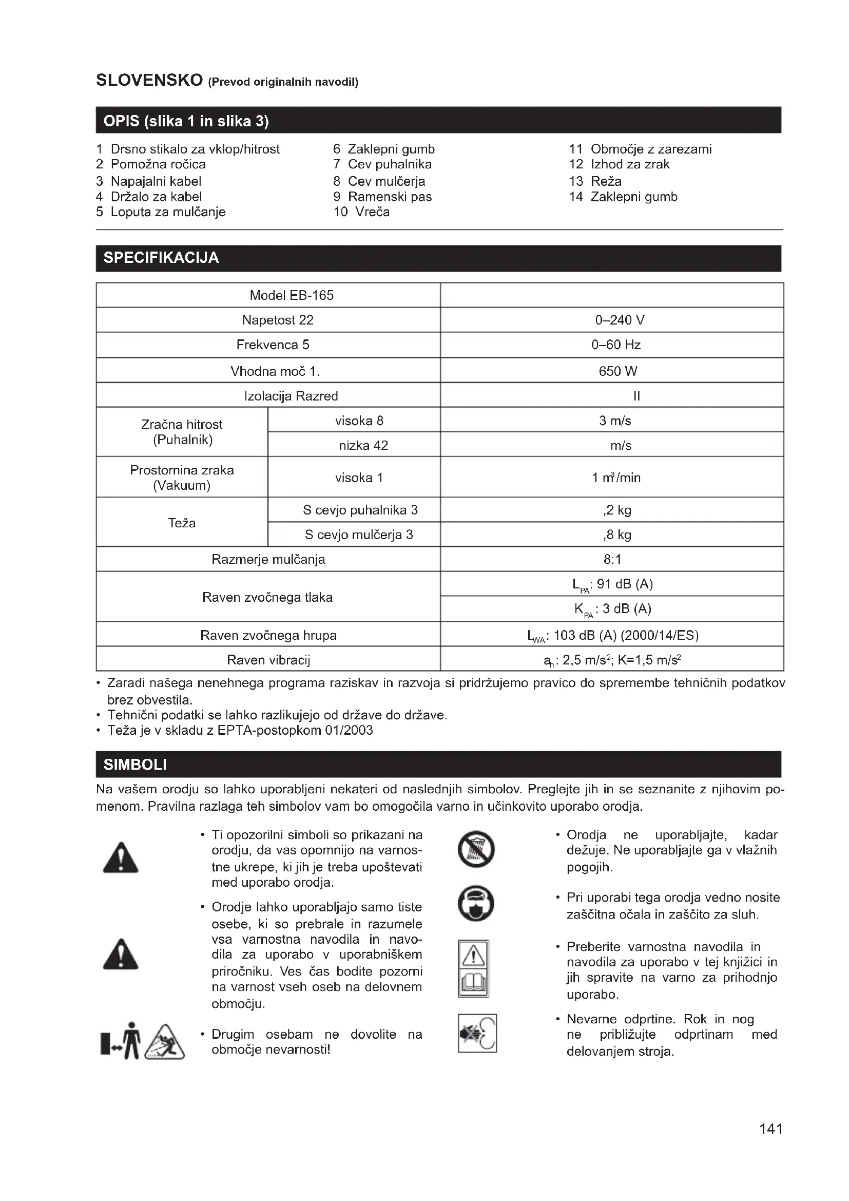 SLOVENSKO (Prevod originalnih navodil) OPIS (slika 1 in slika 3) 1 Drsno stikalo za vklop/hitrost 2 Pomožna ročica 3 Napajalni kabel 4 Držalo za kabel 5 Loputa za mulčanje 6 Zaklepni gumb 7 Cev puhalnika 8 Cev mulčerja 9 Ramenski pas 10 Vreča 11 Območje z zarezami 12 Izhod za zrak 13 Reža 14 Zaklepni gumb SPECIFIKACIJA Model EB-165 Napetost 22 0–240 V Frekvenca 5 0–60 Hz Vhodna moč 1. 650 W Izolacija Razred